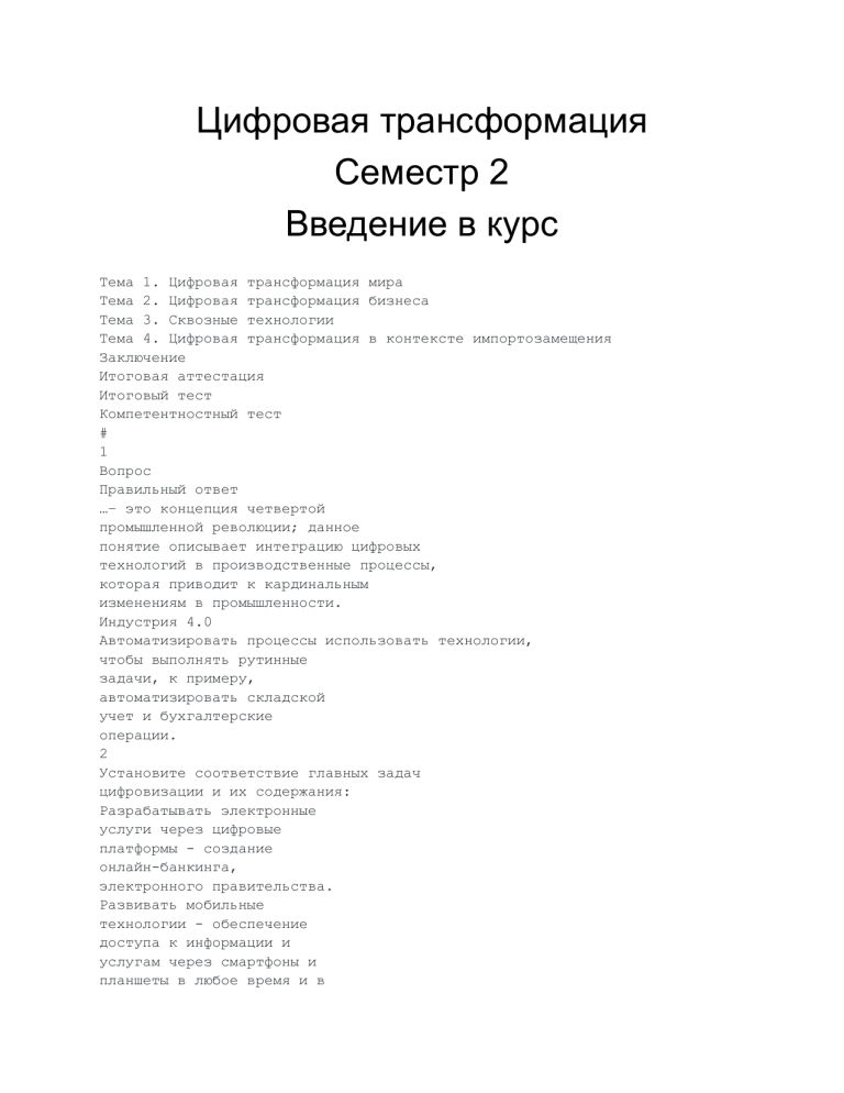 Цифровая трансформация Семестр 2 Введение в курс Тема 1. Цифровая трансформация мира Тема 2. Цифровая трансформация бизнеса Тема 3. Сквозные технологии Тема 4. Цифровая трансформация в контексте импортозамещения Заключение Итоговая аттестация Итоговый тест Компетентностный тест # 1 Вопрос Правильный ответ …– это концепция четвертой промышленной революции; данное понятие описывает интеграцию цифровых технологий в производственные процессы, которая приводит к кардинальным изменениям в промышленности. Индустрия 4.0 Автоматизировать процессы использовать технологии, чтобы выполнять рутинные задачи, к примеру, автоматизировать складской учет и бухгалтерские операции. 2 Установите соответствие главных задач цифровизации и их содержания: Разрабатывать электронные услуги через цифровые платформы - создание онлайн-банкинга, электронного правительства. Развивать мобильные технологии - обеспечение доступа к информации и услугам через смартфоны и планшеты в любое время и в любом месте. 3 … – это процесс внедрения организацией цифровых технологий, которые сопровождаются оптимизацией системы управления основными технологическими процессами; ускоряет продажи и помогает бизнесу расти. 4 Установите правильную последовательность этапов комплексной трансформации бизнес-модели и процессов с использованием цифровых технологий: Цифровая трансформация 1) оцифровка 2) цифровизация 3) цифровая трансформация «Рождение ребенка» включает, в частности, услуги по получению пособий и записи ребенка в детский сад. 5 Установите соответствие примеров суперсервисов и их характеристик: «Цифровой профиль гражданина» - включает все данные о гражданине, доступные для различных государственных органов. Телемедицинские услуги включает сервисы для удаленного медицинского консультирования. 6 … в государственном управлении – это технологическая и организационная основа, которая поддерживает интеграцию и взаимодействие разных государственных служб и учреждений. 7 … – это элемент Индустрии 4.0, который представляет собой интеграцию Киберфизические системы физических процессов и вычислительных (CPS) ресурсов; такие системы включают датчики, программное обеспечение и сети, Платформа которые взаимодействуют с физическими объектами и процессами. 8 Технологические … – это современные направления развития технологий, которые оказывают значительное влияние на разные отрасли и формируют будущее бизнеса и общества. тренды 9 … культура – это стратегический актив, в который входят ценности, установки и поведение сотрудников, направленные на поддержку и развитие цифровых инициатив; предполагает внедрение инноваций и повышение гибкости организации. Цифровая 10 Цель цифровой трансформации бизнеса – … создать более эффективные, гибкие и конкурентоспособные бизнес-процессы 11 По данным системы управления бизнеспроцессами (BPMS), только … задач автоматизируется информационными технологиями – чрезмерное использование ручного труда замедляет бизнес-процессы, поэтому цифровая трансформация позволяет минимизировать ручной труд и освободить рабочее время сотрудников для более эффективной работы. треть 12 К преимуществам цифровой трансформации бизнеса можно отнести … (укажите 2 варианта ответа) повышение операционной эффективности улучшение кач
