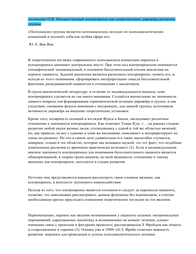 Аксиненко О.В. Множественный контрперенос как сопротивление дирижёра развитию группы. «Психоанализ группы является психоанализом, исходит из психоаналитических концепций и осознаёт себя как особая сфера их» Ю. Е. Ван Вик. В теоретических взглядах современного психоанализа концепции переноса и контрпереноса занимают центральное место. При этом под контрпереносом понимается специфический эмоциональный, в основном бессознательный отклик аналитика на перенос пациента. Задачей аналитика является распознать контрперенос, понять его, и, исходя из этого понимания, сформировать интерпретацию смысла бессознательной фантазии, разыгрываемой пациентом в отношениях с аналитиком. В групп-аналитической литературе, в отличие от индивидуального анализа, теме контрпереноса уделяется не так много внимания. Создаётся впечатление не значимости данного вопроса для формирования терапевтической позиции дирижёра в группе, и как следствие, смещение фокуса внимания с внутренних, для данной группы, источников активности дирижёра на внешние теоретические установки. Кроме того, полярность позиций и взглядов Фукса и Биона, закладывает различное отношение к значимости контрпереноса. Как отмечает Томас Кун, « …на ранних стадиях развития любой науки разные люди, столкнувшись с одной и той же областью явлений, но, как правило, не все с одними и теми же явлениями, описывают и интерпретируют их очень по-разному. Но что в самом деле удивительно и в таких масштабах случается, наверное, только в тех областях, которые мы называем наукой, это тот факт, что подобные изначальные различия со временем практически исчезают» (2). Если в индивидуальном анализе значимость контрпереноса для понимания бессознательного пациента является общепризнанной, в теории групп-анализа, по всей видимости, отношение к такому явлению, как контрперенос, находится в стадии развития. Поэтому мне представляется важным рассмотреть такое сложное явление, как контрперенос, в контексте группового взаимодействия. Исходя из того, что контрперенос является откликом и следует за переносом пациента, полагаю, что невозможно рассматривать данные феномены без взаимосвязи, и считаю необходимым кратко проследить изменения теоретических взглядов на эти явления. Первоначально, перенос как явление возникновения у пациента сильных эмоциональных переживаний, адресованных аналитику и возникающих на момент лечения, однако имеющих связь с прошлым и фигурами прошлого, рассматривался З. Фрейдом как помеха и сопротивление к терапии (3). Однако уже в 1909г (4) З. Фрейд отмечает важность развития переноса для проведения и успеха психоаналитического лечения. Используя термин «перенос», Фрейд включал в него различные явления, хотя всех их объединяло то, что они являлись повторением пережитых когда-то эмоций. Именно свойство переноса повторять прошлые отношения с ранними значимыми фигурами в актуальных отношениях определялось Фрейдом, как самое важное свойство в развитии и построении всех человеческих отношений. Данный взгляд сегодня разделяется не только психоаналитиками, но всеми, кто исследует природу человеческих отношений. Как указывает Сандлер (5, стр. 38), важным открытием Фрейда явилось его предположение, что «конкретные особенности переноса каждого пациента являются результатом специфик