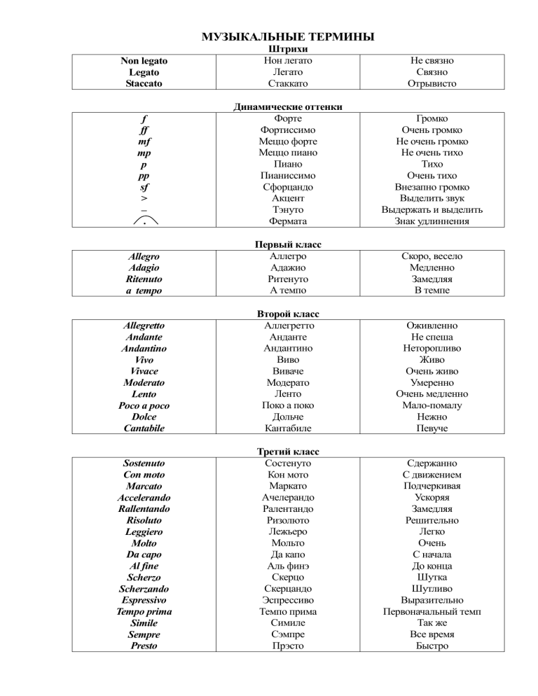 МУЗЫКАЛЬНЫЕ ТЕРМИНЫ Non legato Legato Staccato Штрихи Нон легато Легато Стаккато Не связно Связно Отрывисто f ff mf mp p pp sf > – . Динамические оттенки Форте Фортиссимо Меццо форте Меццо пиано Пиано Пианиссимо Сфорцандо Акцент Тэнуто Фермата Громко Очень громко Не очень громко Не очень тихо Тихо Очень тихо Внезапно громко Выделить звук Выдержать и выделить Знак удлиннения Allegro Adagio Ritenuto a tempo Первый класс Аллегро Адажио Ритенуто А темпо Скоро, весело Медленно Замедляя В темпе Allegretto Andante Andantino Vivo Vivace Moderato Lento Poco a poco Dolce Cantabile Второй класс Аллегретто Анданте Андантино Виво Виваче Модерато Ленто Поко а поко Дольче Кантабиле Оживленно Не спеша Неторопливо Живо Очень живо Умеренно Очень медленно Мало-помалу Нежно Певуче Sostenuto Con moto Marcato Accelerando Rallentando Risoluto Leggiero Molto Da capo Al fine Scherzo Scherzando Espressivo Tempo prima Simile Sempre Presto Третий класс Состенуто Кон мото Маркато Ачелерандо Ралентандо Ризолюто Лежьеро Мольто Да капо Аль финэ Скерцо Скерцандо Эспрессиво Темпо прима Симиле Сэмпре Прэсто Сдержанно С движением Подчеркивая Ускоряя Замедляя Решительно Легко Очень С начала До конца Шутка Шутливо Выразительно Первоначальный темп Так же Все время Быстро Giocoso Non troppo Agitato Con brio Corda Una corda Tre corda Grazioso Subito Pesante Tranguillo Senza Четвертый класс Джиокозо Нон троппо Аджитато Кон брио Корда Уна корда Трэ корда Грациозо Субито Пезантэ Транкуилло Сэнца Весело Не слишком Взволнованно С огнем Педаль Левая педаль Правая педаль Изящно Внезапно Тяжело Спокойно без Allergando Ad libitum Anima Con anima Maestoso Mesto Mano Mano destra Mano sinistra Calando Mezzo voce Пятый класс Аллергандо Ад либитум Анима Кон анима Маэстозо Мэсто Мано Мано дэстра Мано синистра Каландо Мэццо воче Расширяя Свободно Душа С душой Величественно Печально Рука Правая рука Левая рука Успокаиваясь, затихая Вполголоса Appassionato Con fuoco Morendo Stretto Stringendo Sonore Ben Decizo Lugubre Opus Giusto Quasi Шестой класс Апасионато Кон фуоко Морэндо Стретто Стринжендо Сонорэ Бэн Дэчизо Люгубрэ Опус Джусто Квази Страстно С жаром Замирая Сжато Ускоряя Звучно Хорошо Решительно Мрачно Сочинение Ритмично, точно Почти как, подобно