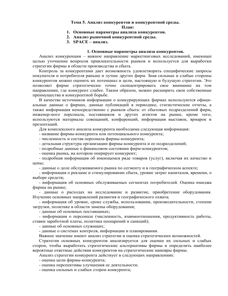 Тема 5. Анализ конкурентов и конкурентной среды. План: 1. Основные параметры анализа конкурентов. 2. Анализ рыночной конкурентной среды. 3. SPACE – анализ. 1. Основные параметры анализа конкурентов. Анализ конкуренции – важное направление маркетинговых исследований, имеющее целью уточнение вопросов привлекательности рынков и используется для выработки стратегии фирмы в области производства и сбыта. Контроль за конкурентами дает возможность удовлетворить специфические запросы покупателя и потребителя раньше и лучше других фирм. Зная сильные и слабые стороны конкурентов можно оценить их потенциал и цели, настоящую и будущую стратегии. Это позволяет фирме стратегически точно сконцентрировать свое внимание на том направлении, где конкурент слабее. Таким образом, можно расширить свои собственные преимущества в конкурентной борьбе. В качестве источников информации о конкурирующих фирмах используются официальные данные о фирмах, данные публикаций в периодике, статистические отчеты, а также информация непосредственно с рынков сбыта: от сбытовых подразделений фирм, инженер-ного персонала, поставщиков и других агентов на рынке, кроме того, используются материалы совещаний, конференций, информация выставок, ярмарок и презентаций. Для комплексного анализа конкурента необходима следующая информация: - название фирмы-конкурента или потенциального конкурента; - численность и состав персонала фирмы-конкурента; - детальная структура организации фирмы-конкурента и ее подразделений; - подробные данные о финансовом состоянии фирм-конкурентов; - оценка рынка, на котором оперирует конкурент; - подробная информация об имеющемся ряде товаров (услуг), включая их качество и цены; - данные о доле обслуживаемого рынка по сегменту и в географическом аспекте; - информация о рекламе и стимулировании сбыта, уровне затрат капиталов, времени, о выборе средств; - информация об основных обслуживаемых сегментах потребителей. Оценка имиджа фирмы на рынке; - данные о расходах на исследование и развитие, приобретение оборудования. Изучение основных направлений развития и географического охвата; - информация об уровне, сроке службы, использовании, производительности, степени загрузки, политике в области замены оборудования; - данные об основных поставщиках; - информация о персонале (численность, взаимоотношения, продуктивность работы, ставки заработной платы, политика поощрений и санкций); - данные об основных служащих; - данные о системах контроля, информации и планирования. Важное значение имеют анализ стратегии и оценка стратегических возможностей. Стратегия основных конкурентов анализируется для оценки их сильных и слабых сторон, чтобы выработать стратегические альтернативы фирмы и определить наиболее вероятные ответные действия конкурентов на стратегические маневры фирмы. Анализ стратегии конкурента действует в следующих направлениях: - оценка цели фирмы-конкурента; - оценка перспективы улучшения ее деятельности; - оценка сильных и слабых сторон конкурента; - оценка способности фирмы приспосабливаться к изменяющимся рыночным условиям; - оценка квалификации персонала; - оценка деятельности высшего руководства. Конкурентные преимущества фирмы обеспечиваются в процессе конкурентной борьбы с так называемыми пятью силами (направлениями) конк