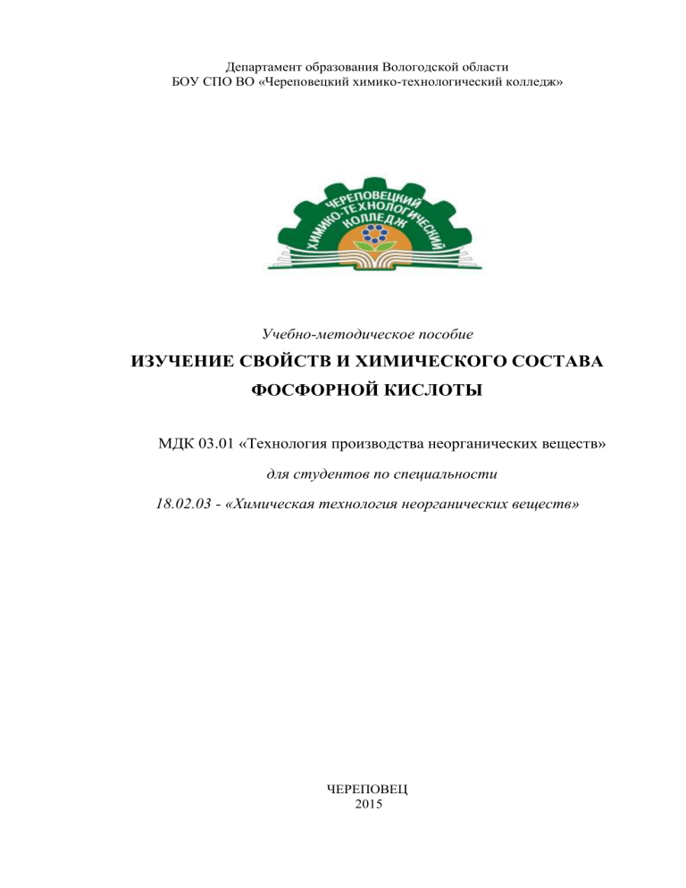 Департамент образования Вологодской области БОУ СПО ВО «Череповецкий химико-технологический колледж» Учебно-методическое пособие ИЗУЧЕНИЕ СВОЙСТВ И ХИМИЧЕСКОГО СОСТАВА ФОСФОРНОЙ КИСЛОТЫ МДК 03.01 «Технология производства неорганических веществ» для студентов по специальности 18.02.03 - «Химическая технология неорганических веществ» ЧЕРЕПОВЕЦ 2015 Учебно-методическое пособие к выполнению лабораторных работ по теме «Технология производства фосфорной кислоты» профессионального модуля ПМ.03 «Ведение технологических неорганических веществ», для студентов процессов БОУ СПО производства ВО «ЧХТК» специальности 18.02.03 «Химическая технология неорганических веществ». Составитель: Гаганова Наталья Николаевна – преподаватель БОУ СПО ВО «ЧХТК» Рецензент: Аксенчик Константин Васильевич – И.О. заведующего кафедрой «Химических технологий» ГОУ ВПО ЧГУ Рассмотрено и рекомендовано к использованию на заседании ЦМК по ППССЗ Протокол № __ от «___» __________ 20___ г. Председатель ЦМК по ППССЗ_____________/Н.Г.Кузнецова/ СОДЕРЖАНИЕ АННОТАЦИЯ.......................................................................................................... 4 1 ОБЩИЕ УКАЗАНИЯ ПО ВЫПОЛНЕНИЮ ЛАБОРАТОРНОГО ПРАКТИКУМА ....................................................................................................... 5 2 ОСНОВНЫЕ ТЕОРЕТИЧЕСКИЕ ПОЛОЖЕНИЯ ........................................... 7 3 КОНТРОЛЬНЫЕ ВОПРОСЫ ........................................................................... 14 4 ОПРЕДЕЛЕНИЕ ФТОРА В ЭФК ПОТЕНЦИОМЕТРИЧЕСКИМ МЕТОДОМ ............................................................................................................ 15 4.1 Сущность метода ............................................................................................. 15 4.2 Аппаратура и посуда ....................................................................................... 15 4.3 Реактивы и растворы....................................................................................... 16 4.4 Проведение анализа ........................................................................................ 16 4.5 Обработка результатов ................................................................................... 18 5 ОПРЕДЕЛЕНИЕ МАССОВОЙ ДОЛИ ОРТОФОСФОРНОЙ КИСЛОТЫ .. 20 5.1 Сущность метода ............................................................................................. 20 5.2 Аппаратура и посуда ....................................................................................... 20 5.3 Реактивы и растворы....................................................................................... 21 5.4 Проведение анализа ........................................................................................ 21 5.5 Обработка результатов ................................................................................... 21 6 ОПРЕДЕЛЕНИЕ МАССОВОЙ ДОЛИ НИТРАТОВ ...................................... 23 6.1 Сущность метода ............................................................................................. 23 6.2 Аппаратура и посуда ....................................................................................... 23 6.3 Реактивы и растворы....................................................................................... 23 6.4 Проведение анализа ........................................................................................ 23 7 ОПРЕДЕЛЕНИЕ МАССОВОЙ ДОЛИ ЖЕЛЕЗА СУЛЬФОСАЛИЦИЛОВЫМ МЕТОДОМ .......................................................... 25 7.1 Сущность метода ............................................................................................. 25 7.2 Аппаратура и посуда ....................................................................................... 25 7.3 Реактивы и растворы....................................................................................... 25 7.4 Проведение анализа ........................................................................................ 25 7.5 Обработка результатов ................................................................................... 26 ЛИТЕРАТУРА ....................................................................................................... 27 ПРИЛОЖЕНИЯ ..................................................................................................... 28 3 АННОТАЦИЯ Методические указания предназначены для студентов 3-го курса очной формы обучения специальности 18.02.03 «Х