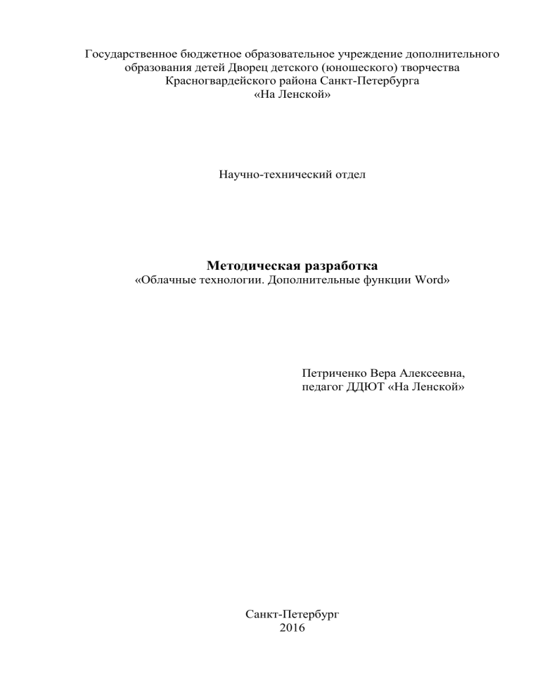 Государственное бюджетное образовательное учреждение дополнительного образования детей Дворец детского (юношеского) творчества Красногвардейского района Санкт-Петербурга «На Ленской» Научно-технический отдел Методическая разработка «Облачные технологии. Дополнительные функции Word» Петриченко Вера Алексеевна, педагог ДДЮТ «На Ленской» Санкт-Петербург 2016 Содержание 1. Облачные технологии ..................................................................................... 3 2. Дополнительные функции Word.................................................................... 4 2.1. Создание оглавления автоматическим способом. 4 2.2. Перемещение по заголовкам на прокрутке справа. 2.3. Расстановка /Снятие переносов. 8 8 2.4. Преобразование таблицы в текст. 8 2.5. Преобразование текста в таблицу. 9 2.6. Вставка рисунка SmartArt. 10 2.7. Применение форматной кисти. 11 2.8. Вставка горизонтальной линии. 2.9. Отобразить все знаки. 11 11 2.10. Разрывы. 11 2.11. Колонки. Разметка страницы. 11 2.12. Разделение экрана на два. 12 2.13. Установка места печати с применением табуляции. 12 1. Облачные технологии Облачные технологии - это электронное хранилище ваших данных в сети интернет, которое позволяет хранить, редактировать, а также делиться интересными файлами и документами с вашими друзьями и коллегами. Интернет предлагает пользователю различные службы: mail, google, yandex, World Wide Web и т.д. Каждая служба предлагает свои сервисы. Что же такое сервис? Для простого понимания зайдем например, на обычную ближайшую почту в городе. Что мы можем сделать на почте? Мы можем послать письмо, послать почтовый перевод, получить пенсию, отправить и получить посылку – это и есть почтовые сервисы. Каждый сервис выполняет свою задачу и своим способом, отличающимся от другого. Так и в Интернете. Каждая служба имеет свои сервисы и каждый сервис – это отдельная программа со своей технологией. Например, сервисы mail. Это почта, Мой мир, Одноклассники, Игры, Знакомства, Новости, Календарь, Облако и т.д. Google предлагает очень большой выбор сервисов: Со всеми сервисами Google можно познакомиться на странице: https://www.google.ru/intl/ru/about/products/ Наша задача – познакомиться со службой «Облако». Практически все используют почтовую службу e-mail. Для чего нам может понадобиться «Облако»? хранить фото, видео, документов; создавать прямо on-line текстовые и табличные документы (word и excel), а также презентации (power point); переносить информацию их почты в облако; загружать с личного компьютера любые документы в облако; давать доступ к своим папкам другим пользователям; одновременно редактировать один и тот же документ разным пользователям; распечатывать документы на удаленном принтере; Для закрепления материала можно просмотреть видео https://www.youtube.com/watch?v=cmxkZvMeE2I 2. Дополнительные функции Word 2.1. Создание оглавления автоматическим способом. Для проработки данного материала используем заготовленный текст. Воспитание детей Принципы, методы, формы воспитания Принципы воспитания. Методы воспитания. Схема функционально-операционного подхода к методам воспитания. Формы воспитания. Классификация форм воспитания. Принцип - общее руководящее положение, требующее постоянства действий при различных условиях и обстоятельствах. Это очень высокая степень обобщения, иначе принцип не может быть реализован в неповторимых частных ситуациях, в необычных группах детей. Обобщенный характер принципа позволяет им руководствоваться все