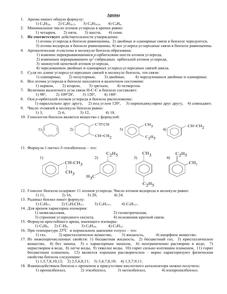 Арены 1. Арены имеют общую формулу: 1) СnH2n, 2) CnH2n-2, 3) CnH2n-6, 4) CnHn. 2. Минимальное число атомов углерода в аренах равно: 1) четырем, 2) пяти, 3) шести, 4) семи. 3. Не соответствует действительности утверждение: 1) атомы углерода в бензоле равноценны, 2) двойные и одинарные связи в бензоле чередуются, 3) атомы водорода в бензоле равноценны, 4) все углерод-углеродные связи в бензоле равноценны. 4. Ароматическая -система в молекуле бензола образована: 1) взаимно перекрывающимися р-орбиталями шести атомов углерода, 2) взаимным перекрыванием sp2-гибридных орбиталей атомов углерода, 3) замкнутой цепочкой атомов углерода, 4) чередованием двойных и одинарных углерод-углеродных связей цикла. 5. Судя по длине углерод-углеродных связей в молекуле бензола, эти связи: 1) одинарные, 2) полуторные, 3) двойные, 4) чередующиеся двойные и одинарные. 6. Все атомы углерода в бензоле находятся в валентном состоянии: 1) первом, 2) втором, 3) третьем, 4) четвертом. 7. Величина валентного угла связи Н-С-С в бензоле составляет: 1) 90о, 2) 109о28', 3) 120о, 4) 180о. 8. Оси р-орбиталей атомов углерода в бензоле расположены: 1) параллельно друг другу, 2) под углом 120о, 3) перпендикулярно друг другу, 4) совпадают. 9. Число -связей в молекуле бензола равно: 1) 3, 2) 6, 3) 12, 4) 18. 10. Гомологом бензола является вещество с формулой: C 1) CH 2) CH3 3) CH=CH2 CH=CH2 4) C2H5 11. Формула 1-метил-3-этилбензола – это: 1) 2) C2H5 3) CH3 C2H5 CH3 CH-CH3 CH3 4) H3C C2H5 12. Гомолог бензола содержит 11 атомов углерода. Число атомов водорода в молекуле равно: 1) 11, 2) 16, 3) 20, 4) 24. 13. Радикал бензил имеет формулу: 1) С6Н5-, 2) С6Н5СН2-, 3) С6Н15-, 4) С6Н11-. 14. Для аренов характерна изомерия: 1) межклассовая, 2) геометрическая, 3) строения углеродного скелета, 4) положения кратной связи. 15. Формула простейшего арена, имеющего изомеры: 1) C6H6, 2) C7H8, 3) C8H10, 4) C9H12. 16. При температуре 250С и нормальном давлении толуол – это: 1) газ, 2) кристаллическое вещество, 3) жидкость, 4) аморфное вещество. 17. Из нижеперечисленных свойств: 1) бесцветная жидкость, 2) бесцветный газ, 3) кристаллическое вещество, 4) без запаха, 5) с характерным запахом, 6) неограниченно растворим в воде, 7) нерастворим в воде, 8) легче воды, 9) тяжелее воды, 10) горит сильно коптящим пламенем, 11) горит бесцветным пламенем, 12) является хорошим растворителем – верно характеризуют физические свойства бензола следующие: 1) 1,5,7,8,10,12; 2) 2,5,6,8,11; 3) 3,4,7,8,10; 4) 1,5,7,9,11. 18. Взаимодействием бензола с пропеном в присутствии кислотного катализатора можно получить: 1) пропилбензол, 2) этилбензол, 3) метилбензол, 4) изопропилбензол. 19. Для получения н-пропилбензола (синтезом Вюрца-Фиттига) с металлическим натрием нужно нагреть: 1) бромбензол и 2-бромпропан, 2) 1,2-дибромбензол и 1-бромпропан, 3) бромбензол и 1-бромпропан, 4) бромбензол и 1,3-дибромпропан. 20. Для аренов наиболее характерны реакции: 1) замещения, 2) окисления, 3) отщепления, 4) изомеризации. 21. Причина того, что бензол горит на воздухе коптящим пламенем, заключается в: 1) наличии цикла в молекуле, 2) большой массовой доле углерода в молекуле, 3) жидком агрегатном состоянии; 4) наличии ароматической системы электронов. 22. При монобромировании этилбензола в присутствии FeBr3 число образующихся изомерных продуктов равно: 1) двум, 2) трем, 3) четырем, 4) пяти. 23. При радикальном монохлорировании этилбензола получается: 1) 2) 3) 4) CHCl-CH3 CH2-CH2Cl CH2-CH3 CH2-CH3 Cl Cl Cl Cl Cl Cl Cl 24. Заместители II рода ориентируют второй заместитель в реакциях электрофильного замещения в положения цикла: 1) 2,6; 2)