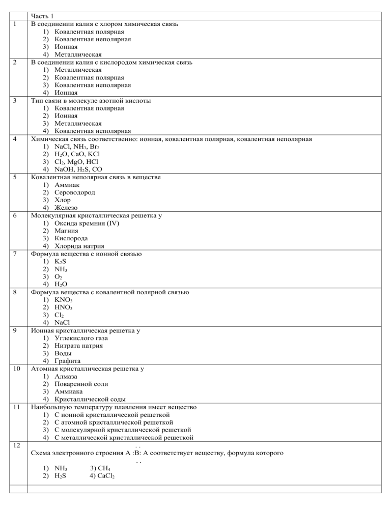 1 2 3 4 5 6 7 8 9 10 11 12 Часть 1 В соединении калия с хлором химическая связь 1) Ковалентная полярная 2) Ковалентная неполярная 3) Ионная 4) Металлическая В соединении калия с кислородом химическая связь 1) Металлическая 2) Ковалентная полярная 3) Ковалентная неполярная 4) Ионная Тип связи в молекуле азотной кислоты 1) Ковалентная полярная 2) Ионная 3) Металлическая 4) Ковалентная неполярная Химическая связь соответственно: ионная, ковалентная полярная, ковалентная неполярная 1) NaCl, NH3, Br2 2) H2O, CaO, KCl 3) Cl2, MgO, HCl 4) NaOH, H2S, CO Ковалентная неполярная связь в веществе 1) Аммиак 2) Сероводород 3) Хлор 4) Железо Молекулярная кристаллическая решетка у 1) Оксида кремния (IV) 2) Магния 3) Кислорода 4) Хлорида натрия Формула вещества с ионной связью 1) K2S 2) NH3 3) O2 4) H2O Формула вещества с ковалентной полярной связью 1) KNO3 2) HNO3 3) Cl2 4) NaCl Ионная кристаллическая решетка у 1) Углекислого газа 2) Нитрата натрия 3) Воды 4) Графита Атомная кристаллическая решетка у 1) Алмаза 2) Поваренной соли 3) Аммиака 4) Кристаллической соды Наибольшую температуру плавления имеет вещество 1) С ионной кристаллической решеткой 2) С атомной кристаллической решеткой 3) С молекулярной кристаллической решеткой 4) С металлической кристаллической решеткой .. Схема электронного строения A :B: A соответствует веществу, формула которого .. 1) NH3 3) CH4 2) H2S 4) CaCl2 13 14 15 16 17 18 19 20 21 22 23 24 Какое из веществ образовано металлической связью? 1) SO3 2) N2O 3) Br2 4) Fe Вещество, не образованное ионной связью 1) Хлорид калия 2) Оксид натрия 3) Хлорид магния 4) Оксид серы (VI) Высокая электропроводность и теплопроводность характерны для веществ с 1) Металлической связью 2) Ионной связью 3) Ковалентной полярной связью 4) Ковалентной неполярной связью Какое из указанных веществ образовано ионной связью? 1) NH3 2) K2O 3) H2O 4) CH4 Какое из указанных веществ имеет ковалентную неполярную связь? 1) Br2 2) NO2 3) CO 4) NaCl Какое из указанных веществ имеет ковалентную полярную связь? 1) Na2S 2) N2 3) H2S 4) CaO Тип связи в веществе, формула которого H2CO3 1) Ковалентная неполярная 2) Ионная 3) Металлическая 4) Ковалентная полярная Тип связи в веществе, формула которого СuО 1) Металлическая 2) Ионная 3) Ковалентная полярная 4) Ковалентная неполярная Тип кристаллической решетки у вещества CaCl2 1) Ионная 2) Молекулярная 3) Атомная 4) Металлическая Ковалентная полярная связь характерна для каждого из двух веществ 1) Алмаз, хлорид калия 2) Кислород, метан 3) Сероводород, вода 4) Калий, аммиак Ионная связь характерна для каждого из двух веществ 1) Магний, хлорид натрия 2) Оксид кальция, бромид калия 3) Вода, азот 4) Графит, сульфат натрия Ковалентная неполярная связь характерна для каждого из двух веществ 1) Оксид углерода (II), хлорид калия 2) Аммиак, углекислый газ 3) Кислород, азот 4) Бромид калия, бром 25 26 27 28 29 30 31 32 33 34 35 36 Ионная и ковалентная полярная связи характерны соответственно у веществ 1) NaBr, CH4 2) NH3, O2 3) H2O, H2S 4) KCl, Na2O Ковалентная неполярная и ковалентная полярная связи соответственно у веществ 1) O2, NaCl 2) N2, CH4 3) KBr, CO 4) Br2, Cl2 Ионная и ковалентная неполярная связи характерны соответственно у веществ 1) NH3, O2 2) CaO, H2O 3) Cl2, H2S 4) MgCl2, Br2 В веществе, формула которого FeCl3, тип связи 1) Ионная 2) Ковалентная полярная 3) Ковалентная неполярная 4) Металлическая Для вещества NH4Cl не характерны вид связи 1) Ковалентная полярная 2) Ионная 3) Ковалентная неполярная 4) Нет правильного ответа В веществе С2Н4 химическая связь 1) Ионная и ковалентная неполярная 2) И