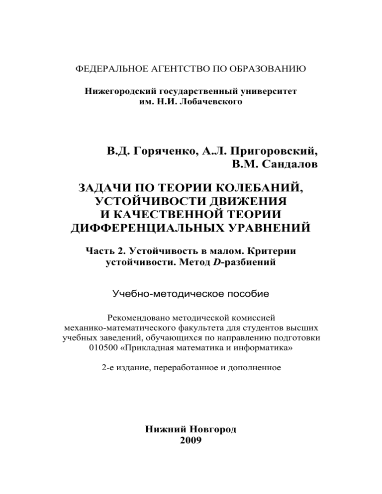 ФЕДЕРАЛЬНОЕ АГЕНТСТВО ПО ОБРАЗОВАНИЮ Нижегородский государственный университет им. Н.И. Лобачевского В.Д. Горяченко, А.Л. Пригоровский, В.М. Сандалов ЗАДАЧИ ПО ТЕОРИИ КОЛЕБАНИЙ, УСТОЙЧИВОСТИ ДВИЖЕНИЯ И КАЧЕСТВЕННОЙ ТЕОРИИ ДИФФЕРЕНЦИАЛЬНЫХ УРАВНЕНИЙ Часть 2. Устойчивость в малом. Критерии устойчивости. Метод D-разбиений Учебно-методическое пособие Рекомендовано методической комиссией механико-математического факультета для студентов высших учебных заведений, обучающихся по направлению подготовки 010500 «Прикладная математика и информатика» 2-е издание, переработанное и дополненное Нижний Новгород 2009 УДК 517.925+517.938 ББК В 232 Г 71 Рецензенты: д.т. н., проф. В.Н. Комаров д.ф.-м.н., проф. М.М. Коган Г 71 Горяченко В.Д., Пригоровский А.Л., Сандалов В.М. ЗАДАЧИ ПО ТЕОРИИ КОЛЕБАНИЙ, УСТОЙЧИВОСТИ ДВИЖЕНИЯ И КАЧЕСТВЕННОЙ ТЕОРИИ ДИФФЕРЕНЦИАЛЬНЫХ УРАВНЕНИЙ. Часть 2: Учебное пособие. 2-е изд., перераб. и доп. – Нижний Новгород: Нижегородский госуниверситет, 2009. – 30 с. Предлагаемый сборник задач предназначен для студентов и аспирантов, специализирующихся по прикладной математике и изучающих курс теории нелинейных колебаний. Сборник также будет полезен преподавателям, широкому кругу инженернотехнических работников и специалистов, занятых разработкой и исследованием математических моделей динамики систем различной природы. В нем приведены задачи об устойчивости состояний равновесия по линейному приближению, построение областей с различной степенью неустойчивости в пространстве параметров динамических систем с разбором их решения, а также вопросы и задачи для самостоятельной работы. Ко многим задачам даны ответы, указания, пояснения к решениям. УДК 517.925+517.938 ББК В 232 В.Д. Горяченко, А.Л. Пригоровский, В.М. Сандалов, 2009 Содержание Введение ................................................................................................ 4 1. Устойчивость в малом. Классические теоремы Ляпунова ........................................................................................... 5 2. Критерии Рауса–Гурвица, Льенара–Шипара, Эрмита–Гурвица ............................................................................... 8 3. Метод D-разбиений ........................................................................ 13 4. Робастная устойчивость ................................................................ 18 Задачи для самостоятельной работы ................................................. 20 Ответы и указания .............................................................................. 26 Список литературы ............................................................................. 29 3 Введение Во второй части сборника “Задачи по теории колебаний, устойчивости движения и качественной теории дифференциальных уравнений” приведены классические теоремы Ляпунова об устойчивости по линейному приближению, критерии Рауса–Гурвица, Льенара–Шипара, Эрмита–Гурвица, а также метод D-разбиений и понятие робастной устойчивости. Краткие теоретические сведения снабжены примерами и решенными задачами. В конце сборника приведено более ста задач для самостоятельной работы, для которых даны ответы и указания. Предлагаемое учебно-методическое пособие будет полезно студентам и аспирантам, изучающим курс теории колебаний и устойчивости движения, а также специалистам, занятым разработкой динамических систем различной природы. 4 1. Устойчивость в малом. Классические теоремы Ляпунова Пусть автономная динамическая система описывается следующей системой дифференциальных уравнений: xi X i ( x1 , x2 ,..., xn ) , i 1, n . (1) Точка P0 ( x10 ,..., xn 0 ) , координаты кото