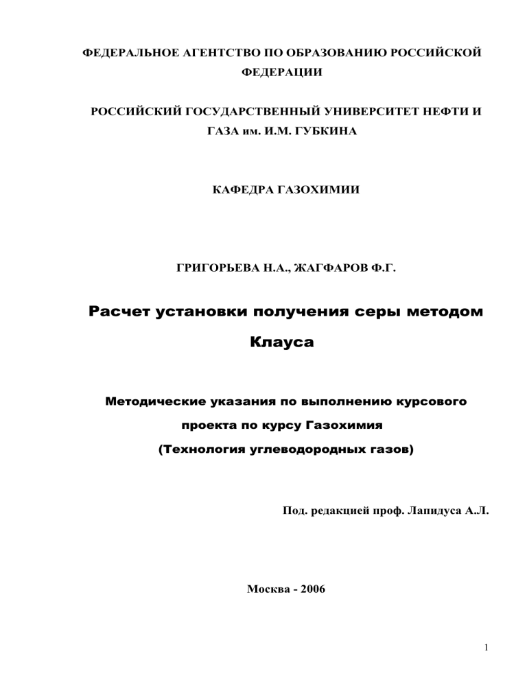 ФЕДЕРАЛЬНОЕ АГЕНТСТВО ПО ОБРАЗОВАНИЮ РОССИЙСКОЙ ФЕДЕРАЦИИ РОССИЙСКИЙ ГОСУДАРСТВЕННЫЙ УНИВЕРСИТЕТ НЕФТИ И ГАЗА им. И.М. ГУБКИНА КАФЕДРА ГАЗОХИМИИ ГРИГОРЬЕВА Н.А., ЖАГФАРОВ Ф.Г. Расчет установки получения серы методом Клауса Методические указания по выполнению курсового проекта по курсу Газохимия (Технология углеводородных газов) Под. редакцией проф. Лапидуса А.Л. Москва - 2006 1 1.ОБЩИЕ ПОЛОЖЕНИЯ Курсовой проект по технологии углеводородных газов выполняется в соответствии с учебным планом и имеет своей целью закрепление студентами знаний, полученных при изучении теоретического курса, более глубокое ознакомление с технологией конкретных производств, приобретение навыков по расчету и проектированию технологических установок и основных аппаратов. Курсовой проект оформляется в виде расчетно-пояснительной записки и технологической схемы процесса, выполненной в формате А1. Исходными данными для выполнения курсового проекта являются материалы первой производственной практики на установке получения серы методом Клауса, а также литературные данные. 2. СТРУКТУРА РАСЧЕТНО-ПОЯСНИТЕЛЬНОЙ ЗАПИСКИ Титульный лист (приложение 1) Оглавление Введение (1-2 стр.) Назначение процесса 1. Производство серы методом Клауса (литературный обзор) 10-12 стр. 1.1 Краткая характеристика серы и ее применение 1.2 Физико-химические основы процесса 1.3 Факторы, влияющие на процесс 1.4 Технологическое оформление 2. Расчет установки получения серы методом Клауса 2.1 Технологическая схема процесса 2 Приводится технологическая схема на формате А4 и ее описание с указанием технологических режимов работы основных аппаратов. 2.2 Исходные данные для проектирования 2.3 Расчет материальных балансов процесса по стадиям 2.4 Расчет тепловых балансов аппаратов (по заданию преподавателя – руководителя курсового проекта) 2.5 Расчет основного оборудования (по заданию преподавателя – руководителя курсового проекта) Литература 2.2 Исходные данные для расчета Производительность установки по кислому газу – м3/ч; Число дней работы установки в году ; Выход серы в термической части – %; В каталитической части – % от общего количества серы Состав исходного газа (табл. 1) Распределение потока кислого газа между термической и каталитической ступенями, % Таблица 1 Компоненты Состав кислого газа %об. м3/ч %масс. кг/ч 3 2.3 Расчет материальных балансов 2.3.1 Материальный баланс термической ступени Расчет процесса горения Расчет ведется по уравнениям химических реакций, протекающих в печиреакторе. Основная реакция окисления до паров серы м3/ч H2S+0,5O2=0,5S2+H2O При 100% выходе образуется серы Пересчет с учетом выхода % серы Количество H2S, расходуемого на реакцию Образуется воды Расход кислорода на окисление Реакция окисления до диоксида серы м3/ч H2S+1,5O2=SO2+H2O Расходуется 1/3 оставшегося H2S Количество диоксида серы Образуется воды Расход кислорода на окисление кг/ч кг/ч Реакция окисления метана CH4+O2=СО2+H2O кг/ч Количество диоксида углерода Образуется воды Расход кислорода на окисление Реакция разложения сероводорода H2S=1/2S2+H2 Разлагается 6% оставшегося сероводорода Количество образующегося водорода Количество образовавшейся серы кг/ч 4 Реакция образования серооксида углерода H2S+CO2=H2O+COS В реакцию вступает 1,5% оставшегося сероводорода Образуется воды Образуется серооксида углерода Количество вступающего в реакц
