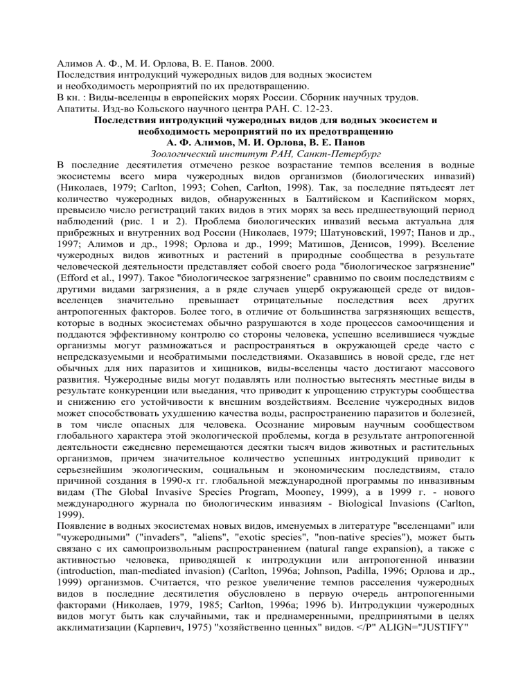 Алимов А. Ф., М. И. Орлова, В. Е. Панов. 2000. Последствия интродукций чужеродных видов для водных экосистем и необходимость мероприятий по их предотвращению. В кн. : Виды-вселенцы в европейских морях России. Сборник научных трудов. Апатиты. Изд-во Кольского научного центра РАН. С. 12-23. Последствия интродукций чужеродных видов для водных экосистем и необходимость мероприятий по их предотвращению А. Ф. Алимов, М. И. Орлова, В. Е. Панов Зоологический институт РАН, Санкт-Петербург В последние десятилетия отмечено резкое возрастание темпов вселения в водные экосистемы всего мира чужеродных видов организмов (биологических инвазий) (Николаев, 1979; Carlton, 1993; Cohen, Carlton, 1998). Так, за последние пятьдесят лет количество чужеродных видов, обнаруженных в Балтийском и Каспийском морях, превысило число регистраций таких видов в этих морях за весь предшествующий период наблюдений (рис. 1 и 2). Проблема биологических инвазий весьма актуальна для прибрежных и внутренних вод России (Николаев, 1979; Шатуновский, 1997; Панов и др., 1997; Алимов и др., 1998; Орлова и др., 1999; Матишов, Денисов, 1999). Вселение чужеродных видов животных и растений в природные сообщества в результате человеческой деятельности представляет собой своего рода "биологическое загрязнение" (Efford et al., 1997). Такое "биологическое загрязнение" сравнимо по своим последствиям с другими видами загрязнения, а в ряде случаев ущерб окружающей среде от видоввселенцев значительно превышает отрицательные последствия всех других антропогенных факторов. Более того, в отличие от большинства загрязняющих веществ, которые в водных экосистемах обычно разрушаются в ходе процессов самоочищения и поддаются эффективному контролю со стороны человека, успешно вселившиеся чуждые организмы могут размножаться и распространяться в окружающей среде часто с непредсказуемыми и необратимыми последствиями. Оказавшись в новой среде, где нет обычных для них паразитов и хищников, виды-вселенцы часто достигают массового развития. Чужеродные виды могут подавлять или полностью вытеснять местные виды в результате конкуренции или выедания, что приводит к упрощению структуры сообщества и снижению его устойчивости к внешним воздействиям. Вселение чужеродных видов может способствовать ухудшению качества воды, распространению паразитов и болезней, в том числе опасных для человека. Осознание мировым научным сообществом глобального характера этой экологической проблемы, когда в результате антропогенной деятельности ежедневно перемещаются десятки тысяч видов животных и растительных организмов, причем значительное количество успешных интродукций приводит к серьезнейшим экологическим, социальным и экономическим последствиям, стало причиной создания в 1990-х гг. глобальной международной программы по инвазивным видам (The Global Invasive Species Program, Mooney, 1999), а в 1999 г. - нового международного журнала по биологическим инвазиям - Biological Invasions (Carlton, 1999). Появление в водных экосистемах новых видов, именуемых в литературе "вселенцами" или "чужеродными" ("invaders", "aliens", "exotic species", "non-native species"), может быть связано с их самопроизвольным распространением (natural range expansion), а также с активностью человека, приводящей к интродукции или антропогенной инвазии (introduction, man-mediated invasion) (Carlton, 1996а; Johnson, Padilla, 1996; Орлова и др., 1999) организмов. Считается, что резкое увеличение темпов р