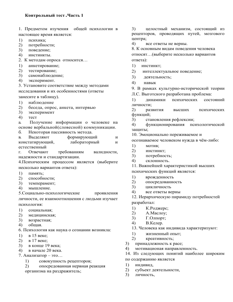 Контрольный тест. Часть 1 1. Предметом изучения общей психологии в настоящее время является: 1) психика; 2) потребности; 3) поведение; 4) инстинкты. 2. К методам опроса относится… 1) анкетирование; 2) тестирование; 3) самонаблюдение; 4) эксперимент. 3. Установите соответствие между методами исследования и их особенностями (ответы занесите в таблицу). 1) наблюдение 2) беседа, опрос, анкета, интервью 3) эксперимент 4) тест а. Получение информации о человеке на основе вербальной(словесной) коммуникации. б. Некоторая пассивность метода. в. Выделяют формирующий и констатирующий, лабораторный и естественный г. Отвечают требованиям валидности, надежности и стандартизации. 4.Психическим процессом является (выберите несколько вариантов ответа): 1) память; 2) способности; 3) темперамент; 4) мышление. 5.Социально-психологические проявления личности, ее взаимоотношения с людьми изучает психология: 1) социальная; 2) медицинская; 3) возрастная; 4) общая. 6. Психология как наука о сознании возникла: 1) в 15 веке; 2) в 17 веке; 3) в конце 19 века; 4) в начале 20 века. 7. Анализатор – это… 1) совокупность рецепторов; 2) опосредованная нервная реакция организма на раздражитель; 3) целостный механизм, состоящий из рецепторов, проводящих путей, мозгового центра; 4) все ответы не верны. 8. К основным видам поведения человека относят…(выберите несколько вариантов ответа): 1) инстинкт; 2) интеллектуальное поведение; 3) деятельность; 4) навык 9. В рамках культурно-исторической теории Л.С. Выготского разработана проблема: 1) динамики психических состояний личности; 2) развития высших психических функций; 3) становления рефлексии; 4) функционирования психологической защиты; 10. Эмоционально переживаемое и осознаваемое человеком нужда в чём-либо: 1) мотив; 2) инстинкт; 3) потребность; 4) склонность. 11. Важнейшей характеристикой высших психических функций является: 1) врожденность 2) опосредованность 3) цикличность 4) все ответы верны 12. Иерархическую пирамиду потребностей разработал: 1) К.Роджерс; 2) А.Маслоу; 3) Г.Олпорт; 4) В.Келер. 13. Человека как индивида характеризуют: 1) жизненный опыт; 2) креативность; 3) принадлежность к расе; 4) мотивационая направленность. 14. Из следующих понятий наиболее широким по содержанию является 1) индивид, 2) субъект деятельности, 3) личность, 4) индивидуальность. 15. Своеобразие, уникальность, неповторимость человека выражается в понятии: 1) субъект деятельности, 2) личность, 3) индивидуальность 4) индивид. 16.Тип темперамента, характеризующийся высокой сензитивностью, эмоциональной возбудимостью, повышенной тревожностью, сниженной активностью и интроверсией: 1) флегматик 2) холерик 3) меланхолик 4) сангвиник 17. Индивидуально-своеобразное свойство психики, определяющее динамику психической деятельности, которые остаются постоянными на протяжения всей жизни: 1) темперамент; 2) характер; 3) личность; 4) способности. 18. Легкость и гибкость приспособления человека в новых условиях, к новым людям, обстоятельствам: 1) регидность; 2) пластичность; 3) активность; 4) реактивность. 21.Склонность к самоанализу, направленность на внутренний мир, характерно для: 1) циклойда; 2) гипертима; 3) эктроверта 4) психастеника. 22.Легкость и гибкость приспособления человека в новых условиях, к новым людям, обстоятельствам 1) регидность 2) пластичность 3) активность 23. Акцентуациями являются такие варианты развития характера, ко
