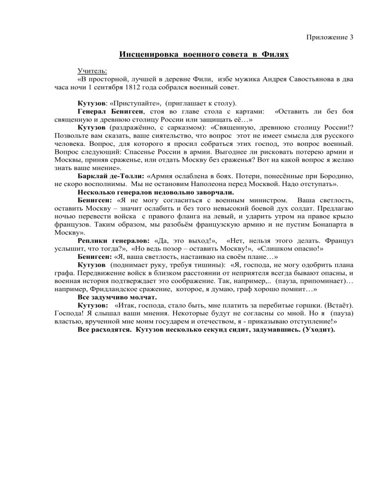 Приложение 3 Инсценировка военного совета в Филях Учитель: «В просторной, лучшей в деревне Фили, избе мужика Андрея Савостьянова в два часа ночи 1 сентября 1812 года собрался военный совет. Кутузов: «Приступайте», (приглашает к столу). Генерал Бенигсен, стоя во главе стола с картами: «Оставить ли без боя священную и древнюю столицу России или защищать её…» Кутузов (раздражённо, с сарказмом): «Священную, древнюю столицу России!? Позвольте вам сказать, ваше сиятельство, что вопрос этот не имеет смысла для русского человека. Вопрос, для которого я просил собраться этих господ, это вопрос военный. Вопрос следующий: Спасенье России в армии. Выгоднее ли рисковать потерею армии и Москвы, приняв сраженье, или отдать Москву без сраженья? Вот на какой вопрос я желаю знать ваше мнение». Барклай де-Толли: «Армия ослаблена в боях. Потери, понесённые при Бородино, не скоро восполнимы. Мы не остановим Наполеона перед Москвой. Надо отступать». Несколько генералов недовольно заворчали. Бенигсен: «Я не могу согласиться с военным министром. Ваша светлость, оставить Москву – значит ослабить и без того невысокий боевой дух солдат. Предлагаю ночью перевести войска с правого фланга на левый, и ударить утром на правое крыло французов. Таким образом, мы разобьём французскую армию и не пустим Бонапарта в Москву». Реплики генералов: «Да, это выход!», «Нет, нельзя этого делать. Француз услышит, что тогда?», «Но ведь позор – оставить Москву!», «Слишком опасно!» Бенигсен: «Я, ваша светлость, настаиваю на своём плане…» Кутузов (поднимает руку, требуя тишины): «Я, господа, не могу одобрить плана графа. Передвижение войск в близком расстоянии от неприятеля всегда бывают опасны, и военная история подтверждает это соображение. Так, например,.. (пауза, припоминает)… например, Фридландское сражение, которое, я думаю, граф хорошо помнит…» Все задумчиво молчат. Кутузов: «Итак, господа, стало быть, мне платить за перебитые горшки. (Встаёт). Господа! Я слышал ваши мнения. Некоторые будут не согласны со мной. Но я (пауза) властью, врученной мне моим государем и отечеством, я - приказываю отступление!» Все расходятся. Кутузов несколько секунд сидит, задумавшись. (Уходит).