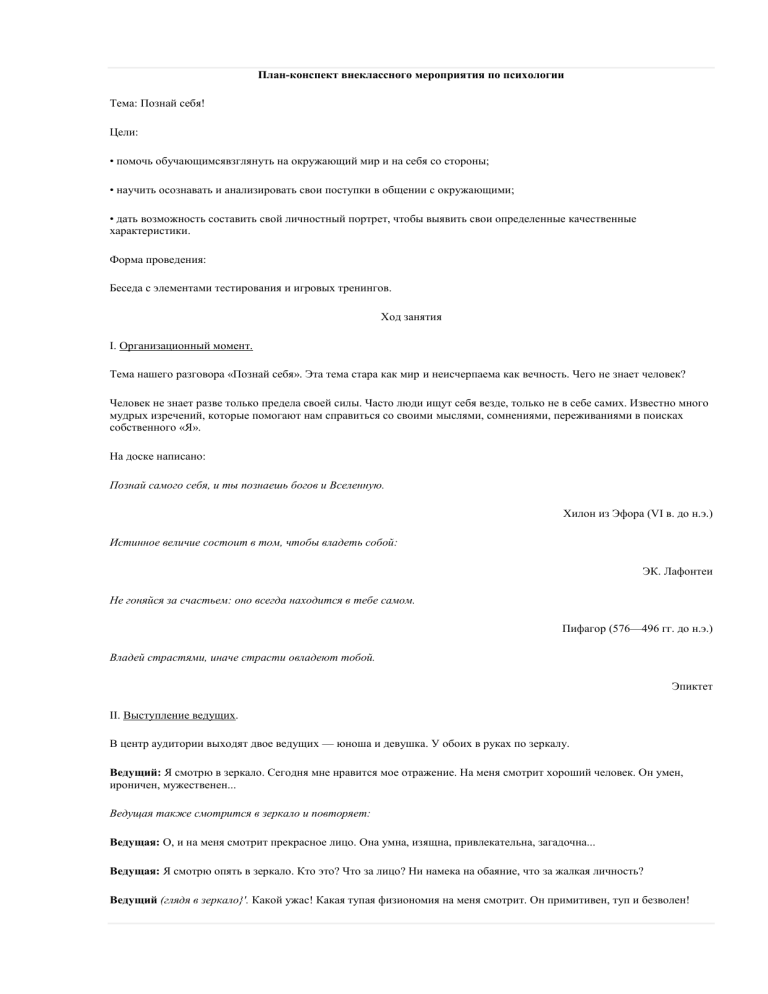 План-конспект внеклассного мероприятия по психологии Тема: Познай себя! Цели: • помочь обучающимсявзглянуть на окружающий мир и на себя со стороны; • научить осознавать и анализировать свои поступки в общении с окружающими; • дать возможность составить свой личностный портрет, чтобы выявить свои определенные качественные характеристики. Форма проведения: Беседа с элементами тестирования и игровых тренингов. Ход занятия I. Организационный момент. Тема нашего разговора «Познай себя». Эта тема стара как мир и неисчерпаема как вечность. Чего не знает человек? Человек не знает разве только предела своей силы. Часто люди ищут себя везде, только не в себе самих. Известно много мудрых изречений, которые помогают нам справиться со своими мыслями, сомнениями, переживаниями в поисках собственного «Я». На доске написано: Познай самого себя, и ты познаешь богов и Вселенную. Хилон из Эфора (VI в. до н.э.) Истинное величие состоит в том, чтобы владеть собой: ЭК. Лафонтеи Не гоняйся за счастьем: оно всегда находится в тебе самом. Пифагор (576—496 гг. до н.э.) Владей страстями, иначе страсти овладеют тобой. Эпиктет II. Выступление ведущих. В центр аудитории выходят двое ведущих — юноша и девушка. У обоих в руках по зеркалу. Ведущий: Я смотрю в зеркало. Сегодня мне нравится мое отражение. На меня смотрит хороший человек. Он умен, ироничен, мужественен... Ведущая также смотрится в зеркало и повторяет: Ведущая: О, и на меня смотрит прекрасное лицо. Она умна, изящна, привлекательна, загадочна... Ведущая: Я смотрю опять в зеркало. Кто это? Что за лицо? Ни намека на обаяние, что за жалкая личность? Ведущий (глядя в зеркало}'. Какой ужас! Какая тупая физиономия на меня смотрит. Он примитивен, туп и безволен! Ведущая: Каждый день мы отражаемся во множестве зеркал. Ведущий: На протяжении всей жизни мы отражаем и ловим несовершенные, сиюминутные, иногда мутные и расплывчатые свои отражения, блики, силуэты... Ведущая: Каждый раз мы пытаемся представить светлый образ самого себя, созданный нами в самых сокровенных мечтах... Ведущие: Какие же мы??? Как познать себя? Ведущая: Китайский философ, житель царства Чу, Лао-Цзы (579—499 гг. до н.э.), говорил: «Жизнь учит лишь тех, кто ее изучает... По себе можно познать других. Будьте внимательны к своим мыслям — они начало поступков». Ведущий: «Велика власть ваша, если вы собой владеете», —учил Сенека. III. Тест «Что вы за птица?» Учитель: Многие воспринимают тесты как развлечение, или при ответах на вопросы пытаются оценить не себя, а насколько точно угадал тест то, что человек уже о себе знал. Однако тесты нельзя воспринимать слишком прямолинейно, не преломляя через призму своих особенностей и личных ситуаций. Ребята, предлагаем вашему вниманию тест, который называется «Что вы за птица?». Итак, отвечая на вопросы, не думайте о том, что вы лучше или хуже, этот тест пытается показать — вы тот или иной... Вопросы теста Выберите из трех ответов один, наиболее подходящий. 1. Вы собрались погулять с друзьями, родители не позволяют, говоря, что уже поздно. Я: а) очень попрошу, чтобы меня все-таки отпустили, но, если родители будут настаивать на своем, то останусь дома; б) скажу себе: «А никуда я не хочу идти» и останусь дома; в) скажу: «Ничего не поздно, я пойду», хотя меня потом будут ругать. 2. В случае разногласий я обычно: а) внимательно прислушиваюсь к другому мнению 