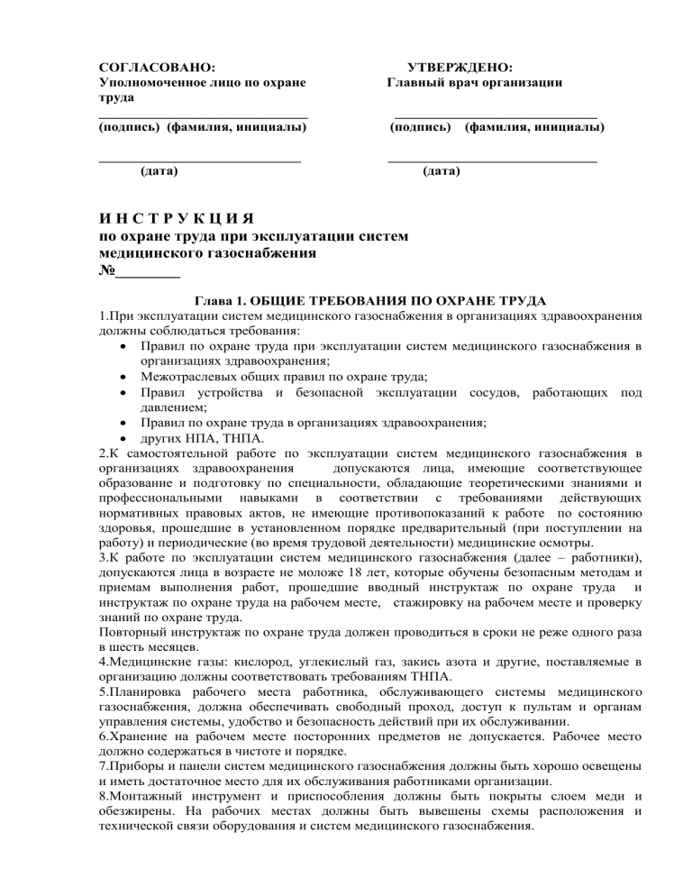 CОГЛАСОВАНО: Уполномоченное лицо по охране труда ______________________________ (подпись) (фамилия, инициалы) УТВЕРЖДЕНО: Главный врач организации _____________________________ (дата) ______________________________ (дата) _____________________________ (подпись) (фамилия, инициалы) ИНСТРУКЦИЯ по охране труда при эксплуатации систем медицинского газоснабжения №________ Глава 1. ОБЩИЕ ТРЕБОВАНИЯ ПО ОХРАНЕ ТРУДА 1.При эксплуатации систем медицинского газоснабжения в организациях здравоохранения должны соблюдаться требования: Правил по охране труда при эксплуатации систем медицинского газоснабжения в организациях здравоохранения; Межотраслевых общих правил по охране труда; Правил устройства и безопасной эксплуатации сосудов, работающих под давлением; Правил по охране труда в организациях здравоохранения; других НПА, ТНПА. 2.К самостоятельной работе по эксплуатации систем медицинского газоснабжения в организациях здравоохранения допускаются лица, имеющие соответствующее образование и подготовку по специальности, обладающие теоретическими знаниями и профессиональными навыками в соответствии с требованиями действующих нормативных правовых актов, не имеющие противопоказаний к работе по состоянию здоровья, прошедшие в установленном порядке предварительный (при поступлении на работу) и периодические (во время трудовой деятельности) медицинские осмотры. 3.К работе по эксплуатации систем медицинского газоснабжения (далее – работники), допускаются лица в возрасте не моложе 18 лет, которые обучены безопасным методам и приемам выполнения работ, прошедшие вводный инструктаж по охране труда и инструктаж по охране труда на рабочем месте, стажировку на рабочем месте и проверку знаний по охране труда. Повторный инструктаж по охране труда должен проводиться в сроки не реже одного раза в шесть месяцев. 4.Медицинские газы: кислород, углекислый газ, закись азота и другие, поставляемые в организацию должны соответствовать требованиям ТНПА. 5.Планировка рабочего места работника, обслуживающего системы медицинского газоснабжения, должна обеспечивать свободный проход, доступ к пультам и органам управления системы, удобство и безопасность действий при их обслуживании. 6.Хранение на рабочем месте посторонних предметов не допускается. Рабочее место должно содержаться в чистоте и порядке. 7.Приборы и панели систем медицинского газоснабжения должны быть хорошо освещены и иметь достаточное место для их обслуживания работниками организации. 8.Монтажный инструмент и приспособления должны быть покрыты слоем меди и обезжирены. На рабочих местах должны быть вывешены схемы расположения и технической связи оборудования и систем медицинского газоснабжения. 9.Работники эксплуатирующие системы медицинского газоснабжения обязаны: соблюдать режим труда и отдыха, установленный законодательством, правилами внутреннего трудового распорядка организации, трудовую дисциплину, выполнять требования охраны труда, правил личной гигиены; выполнять требования пожарной безопасности, знать порядок действий при пожаре, уметь применять первичные средства пожаротушения; курить только в установленных для курения местах; знать приемы оказания первой помощи при несчастных случаях; о неисправности оборудования и других замечаний по работе с обслуживанием систем газоснабжения, приборов и инструмента сообщать л