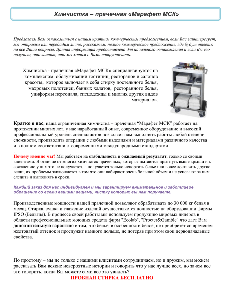 Химчистка – прачечная «Марафет МСК» Предлагаем Вам ознакомиться с нашим кратким коммерческим предложением, если Вас заинтересует, мы отправим или передадим лично, расскажем, полное коммерческое предложение, где будут ответы на все Ваши вопросы. Данная информация предоставлена для начального ознакомления и если Вы его получили, это значит, что мы хотим с Вами сотрудничать. Химчистка - прачечная «Марафет МСК» специализируется на комплексном обслуживании гостиниц, ресторанов и салонов красоты, которое включает в себя стирку постельного белья, махровых полотенец, банных халатов, ресторанного белья, униформы персонала, спецодежды и многих других видов материалов. Кратко о нас, наша ограниченная химчистка – прачечная “Марафет МСК” работает на протяжении многих лет, у нас наработанный опыт, современное оборудование и высокий профессиональный уровень специалистов позволяет нам выполнять работы любой степени сложности, производить операции с любыми изделиями и материалами различного качества и в полном соответствии с современными международными стандартами . Почему именно мы? Мы работаем на стабильность и ожидаемый результат, только со своими клиентами. В отличие от многих химчисток прачечных, которые пытаются прыгнуть выше крыши и к сожалению у них это не получается, а получается только испортить белье или вовсе доставить другие вещи, их проблемы заключаются в том что они набирают очень большой объем и не успевают за ним следить и выполнять в сроки. Каждый заказ для нас индивидуален и мы гарантируем внимательное и заботливое обращение со всеми вашими вещами, чистку которых вы нам поручаете. Производственные мощности нашей прачечной позволяют обрабатывать до 30 000 кг белья в месяц. Стирка, сушка и глажение изделий осуществляется полностью на оборудовании фирмы IPSO (Бельгия). В процессе своей работы мы используем продукцию мировых лидеров в области профессиональных моющих средств фирм "Ecolab", "Procter&Gamble" что дает Вам дополнительную гарантию в том, что белье, в особенности белое, не приобретет со временем желтоватый оттенок и прослужит намного дольше, не потеряв при этом свои первоначальные свойства. По простому – мы не только с нашими клиентами сотрудничаем, но и дружим, мы можем рассказать Вам всякие невероятные истории и говорить что у нас лучше всех, но зачем все это говорить, когда Вы можете сами все это увидеть? ПРОБНАЯ СТИРКА БЕСПЛАТНО Наши преимущества – Ваша выгода 1. Бесплатная и точно в срок доставка Вы экономите бензин или заказ услуг у транспортных компаний, мы сами все доставим и заберем. 2. Применение современного оборудования Ваше белье будет стираться, и гладиться, в новых современных оборудованиях 3. Качественные моющие средства. С химией у нас налаженные поставки из Германии и в Москве свои поставщики, которые поставляют нам хорошую химию, которая не портит белье. 4. Быстрые сроки выполнения услуг Мы не откладываем на завтра, мы делаем сразу, и за этого Ваша выгода заключается, в получение белья в нужные сроки и без задержек. 5. Индивидуальные цены Мы понимаем, что каждая компания хочет сэкономить на услугах прачечных и стараемся максимально в этом помочь, изначально готовы выслушать Ваше предложение и желания по ценам, мы всегда сможем договориться. 6. Персональный технолог и менеджер. Очень важный фактор, одн