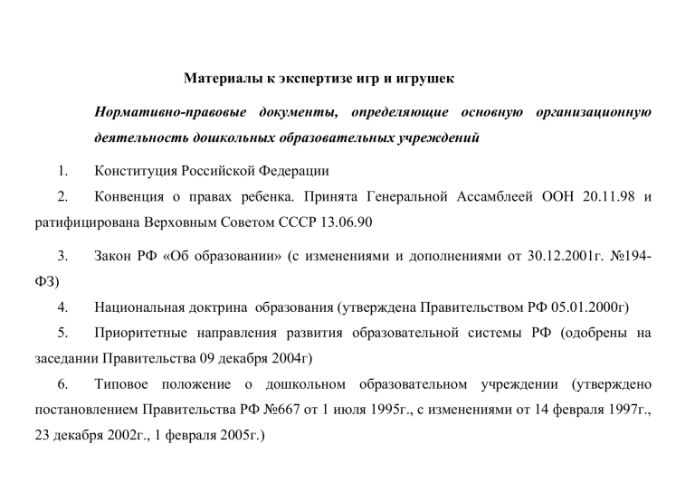 Материалы к экспертизе игр и игрушек Нормативно-правовые документы, определяющие основную организационную деятельность дошкольных образовательных учреждений 1. Конституция Российской Федерации 2. Конвенция о правах ребенка. Принята Генеральной Ассамблеей ООН 20.11.98 и ратифицирована Верховным Советом СССР 13.06.90 3. Закон РФ «Об образовании» (с изменениями и дополнениями от 30.12.2001г. №194- ФЗ) 4. Национальная доктрина образования (утверждена Правительством РФ 05.01.2000г) 5. Приоритетные направления развития образовательной системы РФ (одобрены на заседании Правительства 09 декабря 2004г) 6. Типовое положение о дошкольном образовательном учреждении (утверждено постановлением Правительства РФ №667 от 1 июля 1995г., с изменениями от 14 февраля 1997г., 23 декабря 2002г., 1 февраля 2005г.) 7. Типовое положение об образовательном учреждении для детей дошкольного и младшего школьного возраста (утверждено постановлением Правительства РФ от 19.09.97 №1204) 8. Концепция стандарта дошкольного образования№9/1 от 27.04.94 9. «Об утверждении документов по проведению аттестации и государственной аккредитации дошкольных образовательных учреждений», приказ МО РФ от 22.08.96 №448, приложения № 1,2,3. 10. «Об обеспечении выполнения Комплекса мероприятий по реализации приоритетных направлений развития образовательной системы Российской Федерации на период до 2010 года», приказ Минобрнауки России от 15 июня 2005 г. № 178 11. «О введении в действие санитарно-эпидемиологических правил и нормативов 2.4.1.1249-03» СанПин №24 от 26.03.2003 12. «О федеральных компонентах государственных образовательных стандартов дошкольного образования» (постановление Правительства РФ № 309 от 8 апреля 2000 г., с изменениями от 1 февраля 2005 г). 13. «О социальной защите инвалидов РФ» (с изменениями и дополнениями). Федеральный закон от 17.07.99 №172-ФЗ. 14. Инструктивное письмо Минобразования России от 29.06.99 № 129/23-16 «Об организации в дошкольных образовательных учреждениях групп кратковременного пребывания детей». 15. Письмо Минобразования РФ от 14.03.2000 № 65/23-16 «О гигиенических требованиях к максимальной нагрузке на детей дошкольного возраста в организованных формах обучения». 16. Приказ Минобразования от 22.08.96 № 448 «Временные (примерные) требования к содержанию и методам воспитания и обучения, реализуемым в дошкольном образовательном учреждении». 17. О психолого-медико-педагогическом консилиуме (ПМПк) в образовательном учреждении (Письмо Министерства образования РФ № 27/901-6 от 27 марта 2000г.) 18. О порядке создания и организации работы психолого-медико-педагогического консилиума (ПМПк) образовательного учреждения (Приложение № 1 к письму Министерства образования РФ № 27/901-6 от 27 марта 2000г.). 19. Об интегрированном воспитании и обучении детей с отклонениями в развитии в дошкольных образовательных учреждениях (Приложение к письму Министерства образования РФ№ 03-51-5 ин/23-03 от 16.01.2002г.). Организация предметно-развивающей, игровой среды в дошкольном образовательном учреждении 1. «Об информатизации дошкольного образования в России» (информационное письмо Минобразования РФ № 753/23-16 от 25 мая 2001г) (Извлечение) 2. «О программно-методическом обеспечении дошкольного образования -в контексте педагогики развития». Инструктивное письмо Минобразования России от 24.03.1995 №42/19-15 3. «Временный порядок проведения экспертизы настольных, компьютерных и иных игр, игру