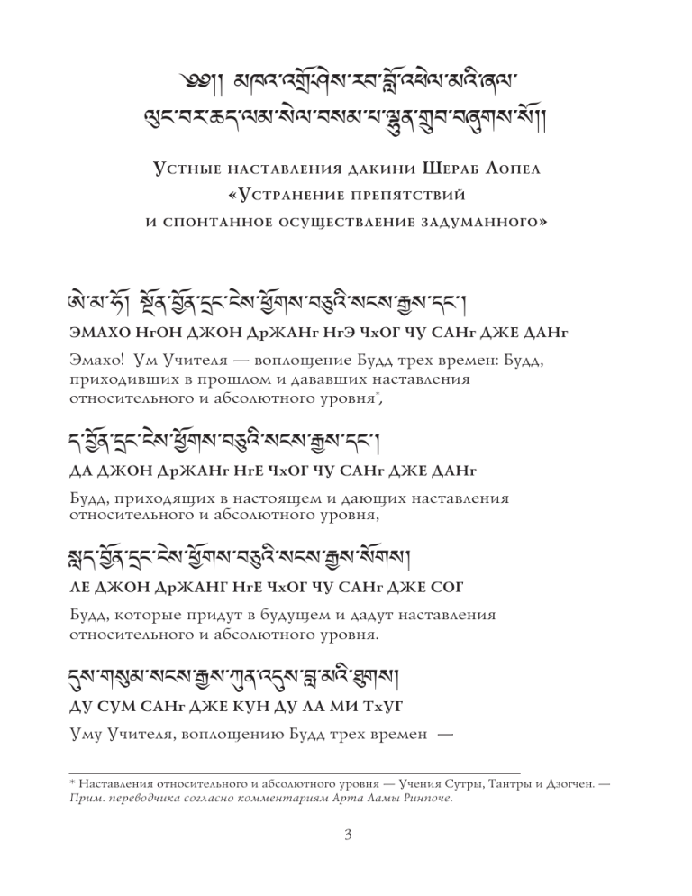 @#//\mkh' 'groshes rab blo 'phel m'i zhal lung bar chad lam sel basm p lhun grub bzhugs so// У стные наставления дакини Ш ераб Л опел «У странение препятствий и спонтанное осуществление задуманного » e m ho/\sngon byon drang nges phyogs bcu'i sangs rgyas dang / ЭМАХО НгОН ДЖОН ДрЖАНг НгЭ ЧхОГ ЧУ САНг ДЖЕ ДАНг Эмахо! Ум Учителя — воплощение Будд трех времен: Будд, приходивших в прошлом и дававших наставления относительного и абсолютного уровня*, d byon drang nges phyogs bcu'i sangs rgyas dang / ДА ДЖОН ДрЖАНг НгЕ ЧхОГ ЧУ САНг ДЖЕ ДАНг Будд, приходящих в настоящем и дающих наставления относительного и абсолютного уровня, slad byon drang nges phyogs bcu'i sangs rgyas sogs/ ЛЕ ДЖОН ДрЖАНГ НгЕ ЧхОГ ЧУ САНг ДЖЕ СОГ Будд, которые придут в будущем и дадут наставления относительного и абсолютного уровня. dus gsum sangs rgyas kun 'dus bla m'i thugs/ ДУ СУМ САНг ДЖЕ КУН ДУ ЛА МИ ТхУГ Уму Учителя, воплощению Будд трех времен — * Наставления относительного и абсолютного уровня — Учения Сутры, Тантры и Дзогчен. — Прим. переводчика согласно комментариям Арта Ламы Ринпоче. 3 skyabs gnas kun 'dus rtsa b'i bla m l/ ЧАП НЭ КУН ДУ ЦА ВИ ЛА МА ЛА Коренному Учителю, воплощению всех Прибежищ, phyag 'tshal sdig bshags mchod 'bul gsol b 'debs/ ЧхАК ЦхАЛ ДИК ЩАГ ЧхО БУЛ СОЛ ВА ДЕБ Простираюсь, раскаиваюсь в недобродетелях, совершаю подношение и обращаюсь с молитвой: bar chad kun zhi thar p'i lam sna 'dren/ БАР ЧхЕ КУН ЖИ ТхАР ПИ ЛАМ НА ДрЖЕН Устрани все препятствия, Ведущий по пути Освобождения! bsam p lhun gyis grub par byin gyis rlobs/ САМ ПА ХЛУН ДЖИ ДрЖУБ ПАР ДЖИН ДЖИ ЛОБ Благослови, чтобы все задуманное осуществлялось спонтанно! rgyal b kun gyi dgongs p mngon shar bk'/ ДЖЯЛ ВА КУН ДЖИ ГОН ПА НгОН ЩАР КА Речь Учителя — воплощение трех видов верного познания* Высшего Бона: устных наставлений, являющихся проявлением просветленных помыслов всех Победителей, m lus kun mkhyen 'phags p kun gyi lung / МА ЛЮ КУН ЧхЕН ПхАГ ПА КУН ДЖИ ЛУНг Писаний всех до единого всезнающих Святых, * Три вида верного познания Высшего Бона — это: 1) Устные наставления ПобедителейБудд; 2) Писания и наставления Святых: Свастикосаттв, Ригдзинов, Дакинь; 3) Собственное изучение, исследование, следование Учению и (возникающее вследствие этого) безошибочное понимание. — Прим. переводчика согласно комментариям Арта Ламы Ринпоче. 4 bk' lung kunshong dri med rang rig snod/ КА ЛУНг КУН ЩОНг ДрЖИ МЕ РАНг РИГ НО Сосуда неомраченного самоосознавания, вмещающего все наставления и писания. tshad gsum bon mchog kun 'dus bla m'i gsung / ЦЕ СУМ БОН ЧхОГ КУН ДУ ЛА МИ СУНг Речи Учителя, воплощению трех видов верного познания Высшего Бона — skyabs gnas kun 'dus rtsa b'i bla m l/ ЧАП НЭ КУН ДУ ЦА ВИ ЛА МА ЛА Коренному Учителю, воплощению всех Прибежищ, phyag 'tshal sdig bshags mchod 'bul gsol b 'debs/ ЧхАК ЦхАЛ ДИК ЩАГ ЧхО БУЛ СОЛ ВА ДЕБ Простираюсь, раскаиваюсь в недобродетелях, совершаю подношение и обращаюсь с молитвой: bar chad kun zhi thar p'i lam sna 'dren/ БАР ЧхЕ КУН ЖИ ТхАР ПИ ЛАМ НА ДрЖЕН Устрани все препятствия, Ведущий по пути Освобождения! bsam p lhun gyis grub par byin gyis rlobs/ САМ ПА ХЛУН ДЖИ ДрЖУБ ПАР ДЖИН ДЖИ ЛОБ Благослови, чтобы все задуманное осуществлялось спонтанно! bslab p tshul khrims ldan p'i dge 'dun dang / ЛАБ ПА ЦхУЛ ТшрИМ ДЭН ПИ ГЕ ДУН ДАНг Тело Учителя — воплощение общин трех дисциплин: Общины, практикующей и овладевшей нравственностью, 5 bslab p ting 'dzin ldan p'i dge 'dun dang / ЛАБ ПА ТИНг ДЗИН ДЭН ПИ ГЕ ДУН ДАНг Общины, практикующей и овладевшей сосредоточением, bslab pshes rab ldan p'i dge 'dun sogs/ ЛАБ ПА ЩЕ РАБ ДЭН ПИ ГЕ ДУН СОГ Общины, практикующей и овладевшей Мудростью. bslab gsum dge 'dun kun 'dus bla m'i sku/ ЛАБ СУМ ГЕ ДУН КУН ДУ ЛА МИ КУ Телу Учителя, воплощению общин трех дисциплин — skyabs gnas kun 'dus rtsa 