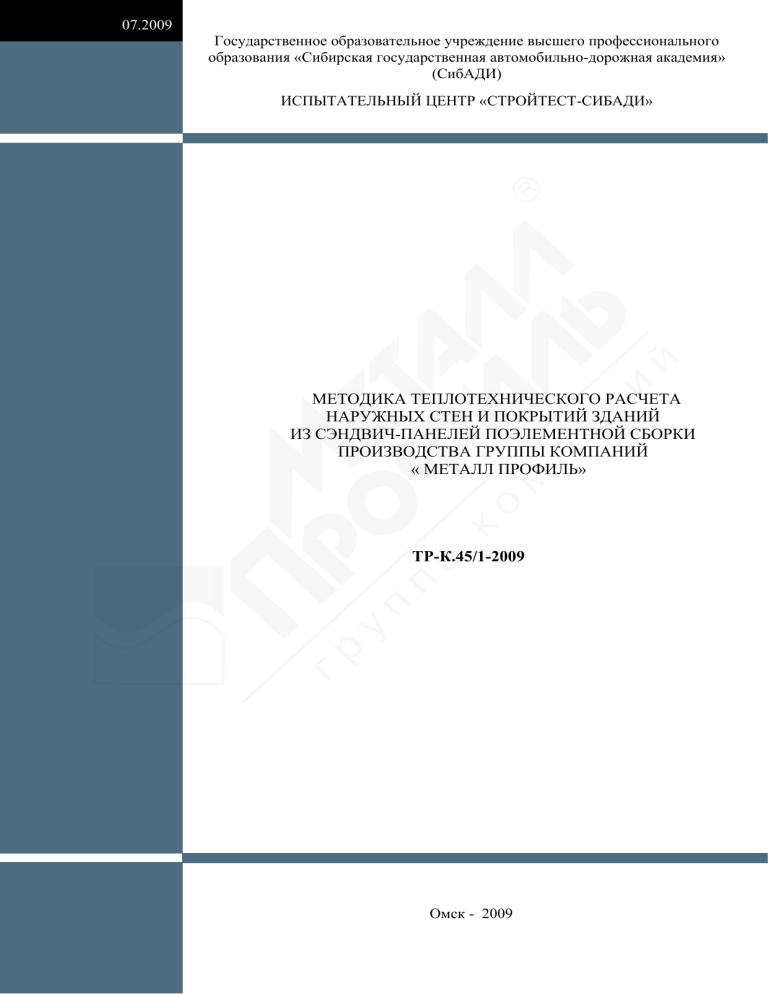 07.2009 Государственное образовательное учреждение высшего профессионального образования «Сибирская государственная автомобильно-дорожная академия» (СибАДИ) ИСПЫТАТЕЛЬНЫЙ ЦЕНТР «СТРОЙТЕСТ-СИБАДИ» МЕТОДИКА ТЕПЛОТЕХНИЧЕСКОГО РАСЧЕТА НАРУЖНЫХ СТЕН И ПОКРЫТИЙ ЗДАНИЙ ИЗ СЭНДВИЧ-ПАНЕЛЕЙ ПОЭЛЕМЕНТНОЙ СБОРКИ ПРОИЗВОДСТВА ГРУППЫ КОМПАНИЙ « МЕТАЛЛ ПРОФИЛЬ» ТР-К.45/1-2009 Омск - 2009 2 ПРЕДИСЛОВИЕ Методика теплотехнического расчета наружных стен и покрытий зданий из сэндвичпанелей поэлементной сборки производства группы компаний «Металл Профиль» разработана сотрудниками инженерно-строительного института ГОУ ВПО СибАДИ (ИЦ «Стройтест-СибАДИ») по заказу ООО «Промышленная компания Металл Профиль-Лобня». Разработка методики обусловлена необходимостью детализации ряда положений СНиП 23-02-2003 «Тепловая защита зданий», СП 23-101-2003 «Проектирование тепловой защиты зданий» с учетом особенностей конструктивных решений наружных стен и покрытий зданий из сэндвич-панелей поэлементной сборки. Предназначена для проектировщиков, инженерно-технических сотрудников строительных и проектных организаций. . 3 СОДЕРЖАНИЕ Обозначение Наименование Примечание Пояснительная 1. ОБЩИЕ ПОЛОЖЕНИЯ Стр.5 записка 2. ОПРЕДЕЛЕНИЕ ТРЕБУЕМЫХ ПОКАЗАТЕЛЕЙ ТЕПЛОВОЙ ЗАЩИТЫ ЗДАНИЙ Стр.5 3. РАСЧЕТ ПРИВЕДЕННОГО СОПРОТИВЛЕНИЯ ТЕПЛОПЕРЕДАЧЕ Стр.7 4. ОЦЕНКА ТЕМПЕРАТУРНОГО РЕЖИМА КОНСТРУКЦИЙ Стр.10 СПИСОК ИСПОЛЬЗОВАННЫХ ИСТОЧНИКОВ Стр.12 Приложения Стр.13 Приложение А. Значения требуемого Rreg и допустимого Rmin сопротивления теплопередаче наружных стен и совмещенных покрытий для некоторых климатических районов (по СНиП 23-02-2003) Стр.14 Приложение Б. Температура точки росы для некоторых значений температур и относительной влажности воздуха Стр.17 Приложение В. Пример расчета приведенного сопротивления теплопередаче наружной стены из сэндвич-панелей по программе расчета температурных полей Стр.18 Приложение Г. Результаты расчета приведенного сопротивления теплопередаче и температуры внутренней поверхности наружных стен из сэндвич панелей поэлементной сборки для условий эксплуатации «А» и «Б» Стр.20 Приложение Д. Результаты расчета приведенного сопротивления теплопередаче и температуры внутренней поверхности совмещенных покрытий из сэндвич панелей Стр.25 Приложение Е. Примеры теплотехнического расчета наружных Âçàì. èíâ. ¹ стен и покрытий зданий из сэндвич-панелей поэлементной Стр.30 Ïîäï. è äàòà сборки ÒÐ-Ê.45/1-2009 Èíâ.¹ ïîäë. Èçì. Êîë.ó÷. Ëèñò ¹ äîê. Ðàçðàáîòàë Õàðëàìîâ Ä.À. Ïðîâåðèë Êðèâîøåèí À.Ä. Ïîäï. Äàòà ÌÅÒÎÄÈÊÀ ÒÅÏËÎÒÅÕÍÈ×ÅÑÊÎÃÎ ÐÀÑ×ÅÒÀ ÍÀÐÓÆÍÛÕ ÑÒÅÍ È ÏÎÊÐÛÒÈÉ ÇÄÀÍÈÉ ÈÇ ÑÝÍÄÂÈ×ÏÀÍÅËÅÉ ÏÎÝËÅÌÅÍÒÍÎÉ ÑÁÎÐÊÈ ÏÐÎÈÇÂÎÄÑÒÂÀ ÃÐÓÏÏÛ ÊÎÌÏÀÍÈÉ « ÌÅÒÀËË ÏÐÎÔÈËÜ». Ñîäåðæàíèå Ñòàäèÿ Ëèñò 1 Ëèñòîâ 2 Èñïûòàòåëüíûé öåíòð «ÑÒÐÎÉÒÅÑÒ-ÑÈÁÀÄÈ» 4 Ëèñò ÒÐ-Ê.45/1-2009 Èçì. Êîë.ó÷. Ëèñò ¹ äîê. Ïîäïèñü Äàòà 2 5 1. ОБЩИЕ ПОЛОЖЕНИЯ 1.1. Методика теплотехнического расчета наружных стен и покрытий зданий из сэндвичпанелей поэлементной сборки производства группы компаний «Металл Профиль» разработана в соответствии с основными положениями СНиП 23-02-2003 «Тепловая защита зданий», СП 23-101-2003 «Проектирование тепловой защиты зданий». 1.2. В общем случае последовательность теплотехнического расчета наружных стен и покрытий из сэндвич-панелей поэлементной сборки включает: - определение требуемых (нормируемых) показ