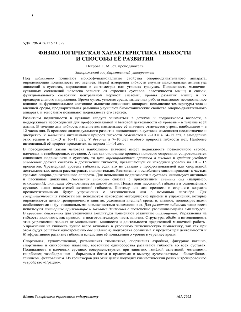 1 УДК 796.41:615.951.827 ФИЗИОЛОГИЧЕСКАЯ ХАРАКТЕРИСТИКА ГИБКОСТИ И СПОСОБЫ ЕЁ РАЗВИТИЯ Петрова Г. М., ст. преподаватель Запорожский государственный университет Под гибкостью понимают морфофункциональные свойства опорно-двигательного аппарата, определяющие подвижность его звеньев. Мерой измерения гибкости служит максимальная амплитуда движений в суставах, выраженная в сантиметрах или угловых градусах. Подвижность мышечносуставных сочленений человека зависит: от строения суставов; эластичности мышц и связок; функционального состояния центральной нервной системы; уровня развития мышц и их предварительного напряжения. Время суток, условия среды, мышечная работа оказывают неоднозначное влияние на функциональное состояние мышечно-связочного аппарата: повышение температуры тела и внешней среды, предварительная разминка улучшают биомеханические свойства опорно-двигательного аппарата, и тем самым повышают подвижность его звеньев. Развитием подвижности в суставах следует заниматься в детском и подростковом возрасте, а поддерживать необходимый для профессиональной и бытовой деятельности её уровень – в течение всей жизни. В течение дня гибкость изменяется: наименьшее её значение отмечается утром, наибольшее – в 12 часов дня. В процессе индивидуального развития подвижность в суставах изменяется неоднозначно и дискретно. У мальчиков интенсивный прирост гибкости отмечается в 7–10 и в 14–15 лет, а замедление этих темпов в 11–13 и 16–17 лет. У девочек в 7–10 лет особого прироста гибкости нет. Наиболее интенсивный её прирост приходится на период 11–14 лет. В повседневной жизни человека наибольшее значение имеет подвижность позвоночного столба, плечевых и тазобедренных суставов. А так как окончание процесса полового созревания сопровождается снижением подвижности в суставах, то цель тренировочного процесса в высших и средних учебных заведениях должна состоять в достижении гибкости, превышающей её исходный уровень на 10 – 15 процентов. Чрезмерный уровень гибкости, если это не связано с профессиональной или спортивной деятельностью, нельзя рассматривать положительно. Растяжение и ослабление связок приводит к частым травмам опорно-двигательного аппарата. Для повышения подвижности в суставах используют активные и пассивные движения. Пассивная гибкость связана с приложением внешних сил (например, отягощений), активная обусловливается тягой мышц. Показатели пассивной гибкости в одноимённых суставах выше показателей активной гибкости. Поэтому для лиц среднего и старшего возраста предпочтительными будут упражнения с отягощениями или с помощью партнёра. Для совершенствования гибкости мы используем некоторые методические приёмы и упражнения, которые определяются целью тренировочного занятия, условиями внешней среды и, главное, половозрастными особенностями и функциональными возможностями занимающихся. Для развития гибкости чаще всего используют повторные пружинящие и маховые движения с постепенно увеличивающейся амплитудой. В круговых движениях для увеличения амплитуды применяют различные отягощения. Упражнения на гибкость включают, как правило, в подготовительную часть занятия. Структура, объём и интенсивность этих упражнений зависят от модальности, мощности и длительности предстоящей мышечной работы. Упражнения на г