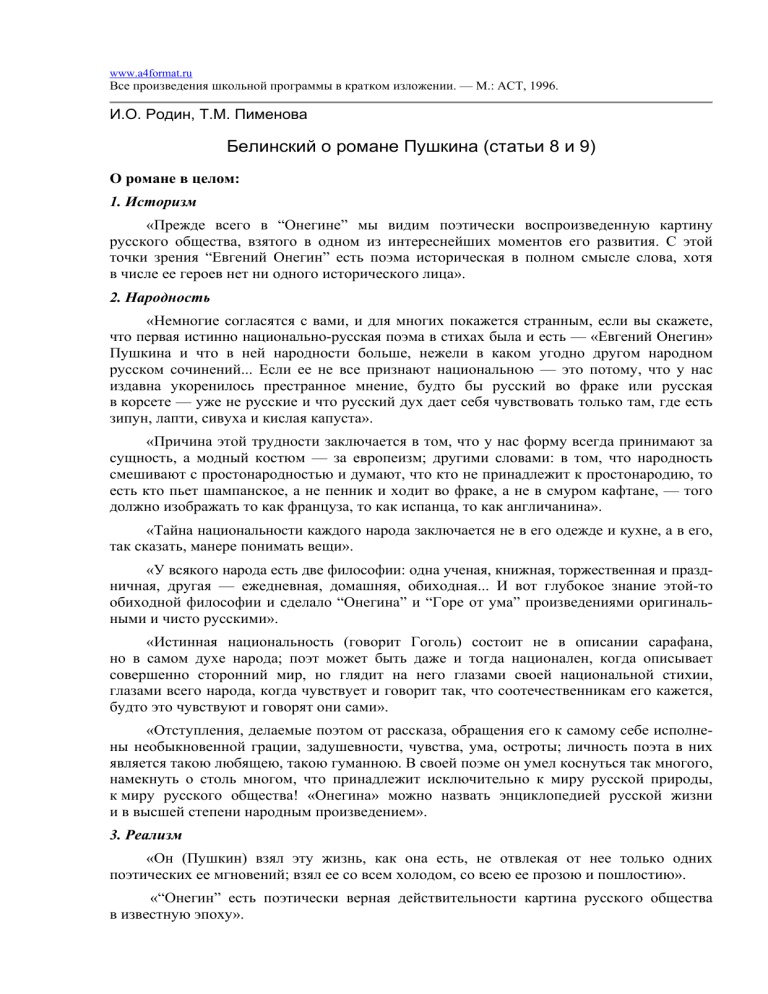 www.a4format.ru Все произведения школьной программы в кратком изложении. — М.: АСТ, 1996. И.О. Родин, Т.М. Пименова Белинский о романе Пушкина (статьи 8 и 9) О романе в целом: 1. Историзм «Прежде всего в “Онегине” мы видим поэтически воспроизведенную картину русского общества, взятого в одном из интереснейших моментов его развития. С этой точки зрения “Евгений Онегин” есть поэма историческая в полном смысле слова, хотя в числе ее героев нет ни одного исторического лица». 2. Народность «Немногие согласятся с вами, и для многих покажется странным, если вы скажете, что первая истинно национально-русская поэма в стихах была и есть — «Евгений Онегин» Пушкина и что в ней народности больше, нежели в каком угодно другом народном русском сочинений... Если ее не все признают национальною — это потому, что у нас издавна укоренилось престранное мнение, будто бы русский во фраке или русская в корсете — уже не русские и что русский дух дает себя чувствовать только там, где есть зипун, лапти, сивуха и кислая капуста». «Причина этой трудности заключается в том, что у нас форму всегда принимают за сущность, а модный костюм — за европеизм; другими словами: в том, что народность смешивают с простонародностью и думают, что кто не принадлежит к простонародию, то есть кто пьет шампанское, а не пенник и ходит во фраке, а не в смуром кафтане, — того должно изображать то как француза, то как испанца, то как англичанина». «Тайна национальности каждого народа заключается не в его одежде и кухне, а в его, так сказать, манере понимать вещи». «У всякого народа есть две философии: одна ученая, книжная, торжественная и праздничная, другая — ежедневная, домашняя, обиходная... И вот глубокое знание этой-то обиходной философии и сделало “Онегина” и “Горе от ума” произведениями оригинальными и чисто русскими». «Истинная национальность (говорит Гоголь) состоит не в описании сарафана, но в самом духе народа; поэт может быть даже и тогда национален, когда описывает совершенно сторонний мир, но глядит на него глазами своей национальной стихии, глазами всего народа, когда чувствует и говорит так, что соотечественникам его кажется, будто это чувствуют и говорят они сами». «Отступления, делаемые поэтом от рассказа, обращения его к самому себе исполнены необыкновенной грации, задушевности, чувства, ума, остроты; личность поэта в них является такою любящею, такою гуманною. В своей поэме он умел коснуться так многого, намекнуть о столь многом, что принадлежит исключительно к миру русской природы, к миру русского общества! «Онегина» можно назвать энциклопедией русской жизни и в высшей степени народным произведением». 3. Реализм «Он (Пушкин) взял эту жизнь, как она есть, не отвлекая от нее только одних поэтических ее мгновений; взял ее со всем холодом, со всею ее прозою и пошлостию». «“Онегин” есть поэтически верная действительности картина русского общества в известную эпоху». www.a4format.ru 2 «В лице Онегина, Ленского и Татьяны Пушкин изобразил русское общество в одном из фазисов его образования, его развития, и с какою истиною, с какою верностью, как полно и художественно изобразил он его!» 4. Значение для последующего литературного процесса «Вместе с современным ему гениальным творением Грибоедова — “Горе от ума”, стихотворный роман Пушкина положил прочное основание новой русской поэзии, новой
