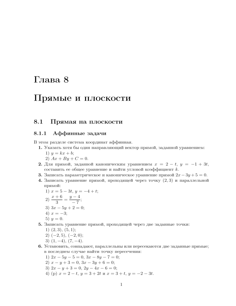 Глава 8 Прямые и плоскости 8.1 Прямая на плоскости 8.1.1 Аффинные задачи В этом разделе система координат аффинная. 1. Указать хотя бы один направляющий вектор прямой, заданной уравнением: 1) y = kx + b; 2) Ax + By + C = 0. 2. Для прямой, заданной каноническим уравнением x = 2 − t, y = −1 + 3t, составить ее общее уравнение и найти угловой коэффициент k. 3. Записать параметрическое и каноническое уравнение прямой 2x − 3y + 5 = 0. 4. Записать уравнение прямой, проходящей через точку (2, 3) и параллельной прямой: 1) x = 5 − 3t, y = −4 + t; x+6 y−4 2) = ; 3 −7 3) 3x − 5y + 2 = 0; 4) x = −3; 5) y = 0. 5. Записать уравнение прямой, проходящей через две заданные точки: 1) (2, 3), (5, 1); 2) (−2, 5), (−2, 0); 3) (1, −4), (7, −4). 6. Установить, совпадают, параллельны или пересекаются две заданные прямые; в последнем случае найти точку пересечения: 1) 2x − 5y − 5 = 0, 3x − 8y − 7 = 0; 2) x − y + 3 = 0, 3x − 3y + 6 = 0; 3) 2x − y + 3 = 0, 2y − 4x − 6 = 0; 4) (р) x = 2 − t, y = 3 + 2t и x = 3 + t, y = −2 − 3t. 1 2 ГЛАВА 8. ПРЯМЫЕ И ПЛОСКОСТИ 7. (р) Написать уравнение медианы AM треугольника ABC, если A(2, −5), B(3, 1), C(−1, −7). 8.1.2 Метрические задачи В этом разделе система координат декартовая прямоугольная. 8. Указать хотя бы один нормальный вектор для прямой, заданной уравнением 1) y = kx + b; 2) Ax + By + C = 0. 9. Составить уравнение прямой, проходящей через точку (2, −8) и перпендикулярной заданной: 1) 2x − 5y − 2 = 0; x+8 y−7 2) = ; 5 2 3) x = 6; 4) y = 0. 10. (р) Дана точка M (5, −8) и прямая 2x − 3y + 5 = 0. Найти проекцию P точки M на прямую и точку N, симметричную точке M (5, −8) относительно этой прямой. 11. Найти расстояние от точки (2, −1) до прямой: 1) 2x − 3y − 2 = 0; 2) 3x + 4y − 7 = 0; 3) x = −5; 4) y = 0. 12. Найти расстояние между параллельными прямыми Ax + By + C1 = 0 и Ax + By + C2 = 0. 13. Найти угол между прямыми: 1) x = 2 + 3t, y = −1 + 4t и x = −7 + t, y = 2 − t; 2) 4x − 3y − 3 = 0 и 7x + y + 6 = 0; 3) 4x − 5y − 7 = 0 и 5x + 4y − 11 = 0; 4) x = 1 + 5t, y = 6 − 4t и 2x + y + 3 = 0; 5) x − 3y − 7 = 0 и y = 1. 14. (р) Составить уравнение высоты AH треугольника ABC, если A(−11, 6), B(−3, −8), C(3, 1). Найти координаты точки пересечения высоты с прямой BC. Определить, внутри или снаружи стороны BC лежит точка H. 15. (р) Составить уравнение биссектрисы, выходящей из угла A треугольника ABC, если A(5, −4), B(−1, −1), C(6, −2). Найти координаты точки пересечения биссектрисы со стороной BC. 16. (р) Уравнение одной из сторон угла 13x + 6y + 9 = 0, уравнение биссектрисы 4x+5y −13 = 0. Найти уравнение второй стороны угла. Другая формулировка той же задачи: найти уравнение прямой, симметричной прямой 13x+6y+9 = 0 относительно 4x + 5y − 13 = 0. 3 8.2. ПЛОСКОСТЬ И ПРЯМАЯ В ПРОСТРАНСТВЕ 8.2 Плоскость и прямая в пространстве 8.2.1 Аффинные задачи В этом разделе система координат аффинная 17. (р) Доказать, что координаты (α, β, γ) направляющего вектора прямой, заданной в виде пересечения двух плоскостей A1 x + B1 y + C1 z + D1 = 0, A2 x + B2 y + C2 z + D2 = 0, можно находить по правилу «векторного произведения» α= B1 C1 B2 C2 , β=− A1 C1 A2 C2 , γ= A1 B1 A2 B2 . не только в прямоугольной, но и в произвольной аффинной системе координат. 18. По параметрическому уравнению плоскости x = 1 + t1 + 2t2 , y = −2 + 3t1 + 3t2 , z = 3 − 3t + t 1 2 составить ее общее уравнение. 19. По общему уравнению плоскости 2x − 5y + 3z + 4 = 0 составить ее параметрическое уравнение. 20. Записать уравнение прямой 2t, x = y = −2 − 2t, z = 1 − 3t в каноническом виде и в виде пересечения двух плоскостей. 21. Записать уравнение прямой ( 2x + 3y − 5z − 2 = 0, x − 2y + 3z − 1 = 0, в каноническом виде и параметрическом виде. 22. Записать уравнение плоскости, проходящей через точку (2, 3, −7) и параллельной плоскости: 1) x = 1 − 3t1 + 5t2 , y = 3 + 4t1 − 4t2 , z = 5 + t1 − 4t2 ; 2) −2x − y + z + 5 = 0; 3) z = 3. 23. Записать 