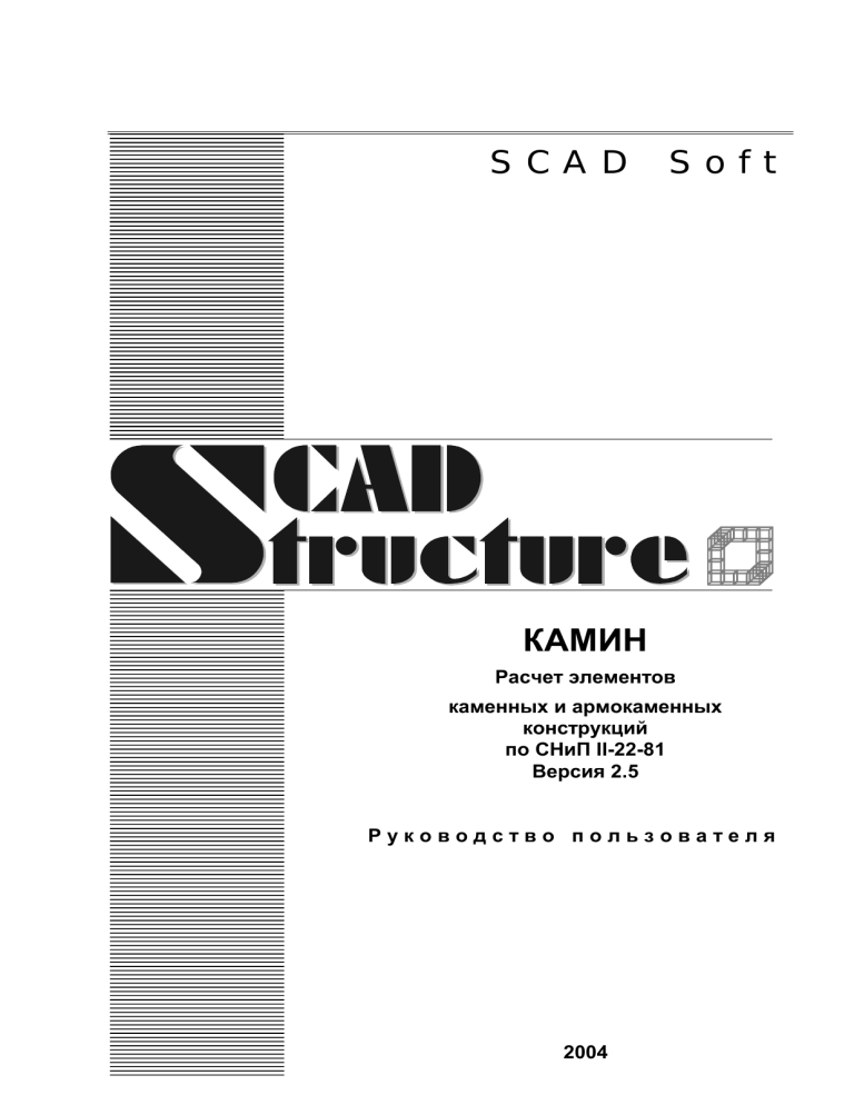 SCAD Soft КАМИН Расчет элементов каменных и армокаменных конструкций по СНиП II-22-81 Версия 2.5 Руководство пользователя 2004 УДК 539.3+624.014 Авторский коллектив: Криксунов Э.З., Микитаренко М.А., Перельмутер М.А., Скорук Л.Н. «КАМИН». Расчет элементов каменных и армокаменных конструкций. РУКОВОДСТВО ПОЛЬЗОВАТЕЛЯ. Версия 2.5. В руководстве приводятся описание функциональных возможностей программы КАМИН, технологии ее использования и рекомендации по применению в задачах проектирования. Программа предназначена для специалистов-проектировщиков, обладающих минимальными навыками работы с компьютером. © SCAD Soft, 2004 Оглавление 1. 1.1 1.2 1.3 ПРЕДВАРИТЕЛЬНЫЕ СВЕДЕНИЯ ............................................................................4 ОЦЕНКА КОНСТРУКТИВНОГО РЕШЕНИЯ............................................................................4 МАТЕРИАЛЫ .....................................................................................................................5 ПОВРЕЖДЕНИЯ ..................................................................................................................7 2.1 2.2 2.3 2.4 УПРАВЛЕНИЕ ПРОГРАММОЙ...................................................................................9 ЭЛЕМЕНТЫ УПРАВЛЕНИЯ ..................................................................................................9 ГЛАВНОЕ ОКНО ...............................................................................................................10 МЕНЮ .............................................................................................................................12 ДИАЛОГОВОЕ ОКНО «НАСТРОЙКИ»................................................................................13 3.1 3.2 3.3 3.4 3.5 3.6 КАМЕННЫЕ КОНСТРУКЦИИ ..................................................................................15 ЦЕНТРАЛЬНО СЖАТЫЕ СТОЛБЫ ......................................................................................15 ВНЕЦЕНТРЕННО СЖАТЫЕ СТОЛБЫ ..................................................................................17 НАРУЖНАЯ СТЕНА ..........................................................................................................18 СТЕНА ПОДВАЛА .............................................................................................................20 ПЕРЕМЫЧКИ ....................................................................................................................21 МЕСТНАЯ ПРОЧНОСТЬ.....................................................................................................25 4.1 4.2 4.3 4.4 4.5 АРМОКАМЕННЫЕ КОНСТРУКЦИИ ......................................................................28 АРМИРОВАННЫЕ ЦЕНТРАЛЬНО СЖАТЫЕ СТОЛБЫ...........................................................28 АРМИРОВАННЫЕ ВНЕЦЕНТРЕННО СЖАТЫЕ СТОЛБЫ ......................................................30 АРМИРОВАННАЯ НАРУЖНАЯ СТЕНА ...............................................................................31 АРМИРОВАННАЯ СТЕНА ПОДВАЛА .................................................................................32 МЕСТНАЯ ПРОЧНОСТЬ АРМИРОВАННЫХ КОНСТРУКЦИЙ ................................................32 5.1 5.2 5.3 5.4 РЕКОНСТРУИРУЕМЫЕ КОНСТРУКЦИИ.............................................................35 ЦЕНТРАЛЬНО СЖАТЫЕ СТОЛБЫ, УСИЛЕННЫЕ ОБОЙМАМИ .............................................35 ВНЕЦЕНТРЕННО СЖАТЫЕ СТОЛБЫ, УСИЛЕННЫЕ ОБОЙМАМИ ........................................36 УСИЛЕНИЕ ОБОЙМАМИ СТЕНЫ ЗДАНИЯ..........................................................................38 ПРОЕМ В СТЕНЕ ...............................................................................................................40 6.1 6.2 6.3 УЗЛЫ ОПИРАНИЯ........................................................................................................42 ВИСЯЧИЕ СТЕНЫ .............................................................................................................42 ОПИРАНИЕ БАЛОК И ПЛИТ НА СТЕНУ ..............................................................................45 ОПИРАНИЕ БАЛОК И/ИЛИ ФЕРМ НА ПИЛЯСТРЫ И СТОЛБЫ ..............................................46 7.1 7.2 СПРАВОЧНАЯ ИНФОРМАЦИЯ................................................................................49 ОБЪЕМНЫЕ ВЕСА ............................................................................................................49 КЛАСИФИКАЦИЯ ПОВРЕЖДЕНИЙ ....................................................................................49 8.1 8.2 СЕРВИСНЫЕ ФУНКЦИИ ...........................................................................................50 ВЫЧИСЛЕНИЕ ПО ФОРМУЛАМ ............................................