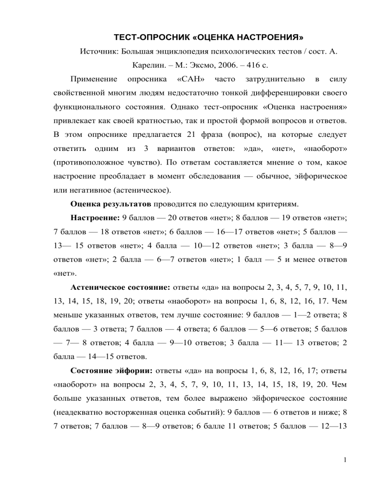 ТЕСТ-ОПРОСНИК «ОЦЕНКА НАСТРОЕНИЯ» Источник: Большая энциклопедия психологических тестов / сост. А. Карелин. – М.: Эксмо, 2006. – 416 с. Применение опросника «САН» часто затруднительно в силу свойственной многим людям недостаточно тонкой дифференцировки своего функционального состояния. Однако тест-опросник «Оценка настроения» привлекает как своей кратностью, так и простой формой вопросов и ответов. В этом опроснике предлагается 21 фраза (вопрос), на которые следует ответить одним из 3 вариантов ответов: »да», «нет», «наоборот» (противоположное чувство). По ответам составляется мнение о том, какое настроение преобладает в момент обследования — обычное, эйфорическое или негативное (астеническое). Оценка результатов проводится по следующим критериям. Настроение: 9 баллов — 20 ответов «нет»; 8 баллов — 19 ответов «нет»; 7 баллов — 18 ответов «нет»; 6 баллов — 16—17 ответов «нет»; 5 баллов — 13— 15 ответов «нет»; 4 балла — 10—12 ответов «нет»; 3 балла — 8—9 ответов «нет»; 2 балла — 6—7 ответов «нет»; 1 балл — 5 и менее ответов «нет». Астеническое состояние: ответы «да» на вопросы 2, 3, 4, 5, 7, 9, 10, 11, 13, 14, 15, 18, 19, 20; ответы «наоборот» на вопросы 1, 6, 8, 12, 16, 17. Чем меньше указанных ответов, тем лучше состояние: 9 баллов — 1—2 ответа; 8 баллов — 3 ответа; 7 баллов — 4 ответа; 6 баллов — 5—6 ответов; 5 баллов — 7— 8 ответов; 4 балла — 9—10 ответов; 3 балла — 11— 13 ответов; 2 балла — 14—15 ответов. Состояние эйфории: ответы «да» на вопросы 1, 6, 8, 12, 16, 17; ответы «наоборот» на вопросы 2, 3, 4, 5, 7, 9, 10, 11, 13, 14, 15, 18, 19, 20. Чем больше указанных ответов, тем более выражено эйфорическое состояние (неадекватно восторженная оценка событий): 9 баллов — 6 ответов и ниже; 8 7 ответов; 7 баллов — 8—9 ответов; 6 балле 11 ответов; 5 баллов — 12—13 1 ответов; 4 14—15 ответов; 3 балла — 16—17 ответов; 18—19 ответов; 1 балл — 20 ответов и более. Набор вопросов 1. Чувствую себя исключительно бодро. 2. Соседи (другие учащиеся и т. п.) очень мне надоели. 3. Испытываю какое-то тягостное чувство. 4. Скорее бы испытать чувство покоя (закончились бы урок, занятия, четверть и т. п.) 5. Оставили бы меня в покое, не беспокоили бы. 6. Состояние такое, что, образно говоря готов горы свернуть. 7. Оценка по тесту неприятна, вызываете неудовлетворенности. 8. Удивительное настроение: хочется петь и плясать, целовать от радости каждого, кого вижу. 9. Вокруг меня очень много людей, способных поступить неблагородно, сделать зло. От любого человека можно ожидать неблаговидного поступка. 10. Все здания вокруг, все постройки на улицах кажутся мне удивительно неудачными. 11. Каждому, кого встречаю, способен сказать грубость. 12. Иду радостно, не чувствую под собой ног. 13. Никого не хочется видеть, ни с кем не хочется разговаривать. 14. Настроение такое, что хочется сказать: «Пропади все пропадом!». 15. Хочется сказать: «Перестаньте меня беспокоить, отвяжитесь!» 16. Все люди без исключения мне кажутся чрезвычайно благожелательными, хорошими. Все они без исключения мне симпатичны. 17. Не вижу впереди никаких трудностей, легко. Все легко, доступно! 18. Мое будущее мне кажется очень печальным. 19. Бывает хуже, но редко. 20. Не верю даже самым близким людям. 2 21. Автомашины гудят на улице резко, но эти звуки воспринимаются как приятная музыка. 3