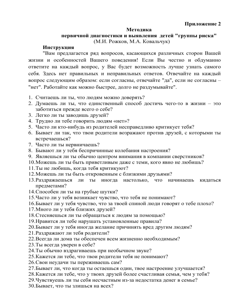 Приложение 2 Методика первичной диагностики и выявления детей "группы риска" (М.И. Рожков, М.А. Ковальчук) Инструкция "Вам предлагается ряд вопросов, касающихся различных сторон Вашей жизни и особенностей Вашего поведения! Если Вы честно и обдуманно ответите на каждый вопрос, у Вас будет возможность лучше узнать самого себя. Здесь нет правильных и неправильных ответов. Отвечайте на каждый вопрос следующим образом: если согласны, отвечайте "да", если не согласны – "нет". Работайте как можно быстрее, долго не раздумывайте". 1. Считаешь ли ты, что людям можно доверять? 2. Думаешь ли ты, что единственный способ достичь чего-то в жизни – это заботиться прежде всего о себе? 3. Легко ли ты заводишь друзей? 4. Трудно ли тебе говорить людям «нет»? 5. Часто ли кто-нибудь из родителей несправедливо критикует тебя? 6. Бывает ли так, что твои родители возражают против друзей, с которыми ты встречаешься? 7. Часто ли ты нервничаешь? 8. Бывают ли у тебя беспричинные колебания настроения? 9. Являешься ли ты обычно центром внимания в компании сверстников? 10.Можешь ли ты быть приветливым даже с теми, кого явно не любишь? 11.Ты не любишь, когда тебя критикуют? 12.Можешь ли ты быть откровенным с близкими друзьями? 13.Раздражаешься ли ты иногда настолько, что начинаешь кидаться предметами? 14.Способен ли ты на грубые шутки? 15.Часто ли у тебя возникает чувство, что тебя не понимают? 16.Бывает ли у тебя чувство, что за твоей спиной люди говорят о тебе плохо? 17.Много ли у тебя близких друзей? 18.Стесняешься ли ты обращаться к людям за помощью? 19.Нравится ли тебе нарушать установленные правила? 20.Бывает ли у тебя иногда желание причинять вред другим людям? 21.Раздражают ли тебя родители? 22.Всегда ли дома ты обеспечен всем жизненно необходимым? 23.Ты всегда уверен в себе? 24.Ты обычно вздрагиваешь при необычном звуке? 25.Кажется ли тебе, что твои родители тебя не понимают? 26.Свои неудачи ты переживаешь сам? 27.Бывает ли, что когда ты остаешься один, твое настроение улучшается? 28.Кажется ли тебе, что у твоих друзей более счастливая семья, чем у тебя? 29.Чувствуешь ли ты себя несчастным из-за недостатка денег в семье? 30.Бывает, что ты злишься на всех? 31.Часто ли ты чувствуешь себя беззащитным? 32.Легко ли ты осваиваешься в новом коллективе? 33.Трудно ли тебе отвечать в школе перед всем классом? 34.Есть ли у тебя знакомые, которых ты вообще не можешь переносить? 35.Можешь ли ты ударить человека? 36.Ты иногда угрожаешь людям? 37.Часто ли родители наказывали тебя? 38.Появлялось ли у тебя когда-нибудь сильное желание убежать из дома? 39.Думаешь ли ты, что твои родители часто обходятся с тобой как с ребенком? 40.Часто ли ты чувствуешь себя несчастным? 41.Легко ли ты можешь рассердиться? 42.Рискнул бы ты схватить за уздечку бегущую лошадь? 43.Считаешь ли ты, что есть много глупых моральных норм поведения? 44.Страдаешь ли ты от робости и застенчивости? 45.Испытывал ли ты чувство, что тебя недостаточно любят в семье? 46.Твои родители живут отдельно от тебя? 47.Часто ли ты теряешь уверенность в себе из-за внешнего вида7 48.Часто ли у тебя бывает веселое и беззаботное настроение? 49.Ты подвижный человек? 50.Любят ли тебя твои знакомые, друзья? 51.Бывает ли, что твои родители тебя не понимают и кажутся тебе чужими? 52.При неудачах бывает ли у тебя желание убежать куда-нибудь подальше и не возвращаться? 53.Бывало ли, что кто-то из родителей вызывал у те