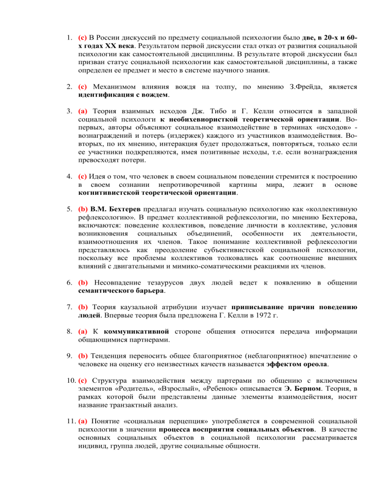 1. (с) В России дискуссий по предмету социальной психологии было две, в 20-х и 60х годах ХХ века. Результатом первой дискуссии стал отказ от развития социальной психологии как самостоятельной дисциплины. В результате второй дискуссии был призван статус социальной психологии как самостоятельной дисциплины, а также определен ее предмет и место в системе научного знания. 2. (с) Механизмом влияния вождя на толпу, по мнению З.Фрейда, является идентификация с вождем. 3. (а) Теория взаимных исходов Дж. Тибо и Г. Келли относится в западной социальной психологи к необихевиористкой теоретической ориентации. Вопервых, авторы объясняют социальное взаимодействие в терминах «исходов» вознаграждений и потерь (издержек) каждого из участников взаимодействия. Вовторых, по их мнению, интеракция будет продолжаться, повторяться, только если ее участники подкрепляются, имея позитивные исходы, т.е. если вознаграждения превосходят потери. 4. (с) Идея о том, что человек в своем социальном поведении стремится к построению в своем сознании непротиворечивой картины мира, лежит в основе когнитивистской теоретической ориентации. 5. (b) В.М. Бехтерев предлагал изучать социальную психологию как «коллективную рефлексологию». В предмет коллективной рефлексологии, по мнению Бехтерова, включаются: поведение коллективов, поведение личности в коллективе, условия возникновения социальных объединений, особенности их деятельности, взаимоотношения их членов. Такое понимание коллективной рефлексологии представлялось как преодоление субъективистской социальной психологии, поскольку все проблемы коллективов толковались как соотношение внешних влияний с двигательными и мимико-соматическими реакциями их членов. 6. (b) Несовпадение тезаурусов двух людей ведет к появлению в общении семантического барьера. 7. (b) Теория каузальной атрибуции изучает приписывание причин поведению людей. Впервые теория была предложена Г. Келли в 1972 г. 8. (a) К коммуникативной стороне общения относится передача информации общающимися партнерами. 9. (b) Тенденция переносить общее благоприятное (неблагоприятное) впечатление о человеке на оценку его неизвестных качеств называется эффектом ореола. 10. (с) Структура взаимодействия между партерами по общению с включением элементов «Родитель», «Взрослый», «Ребенок» описывается Э. Берном. Теория, в рамках которой были представлены данные элементы взаимодействия, носит название транзактный анализ. 11. (a) Понятие «социальная перцепция» употребляется в современной социальной психологии в значении процесса восприятия социальных объектов. В качестве основных социальных объектов в социальной психологии рассматривается индивид, группа людей, другие социальные общности. 12. (с) Исследовательская область, занимающаяся изучением норм пространственновременной организации общения, называется проксемика. Выступая в качестве особой знаковой системы, пространство и время организации процесса общения несут смысловую нагрузку, являясь компонентами коммуникативной ситуации. 13. (b) Эмпатия – это механизм межличностного восприятия, который представляет собой особый вид понимания другого человека, стремление эмоционально откликнуться на его проблемы. 14. (с) Эффект установки имеет отношение к перцептивной стороне общения, так как проявление данного эффекта в