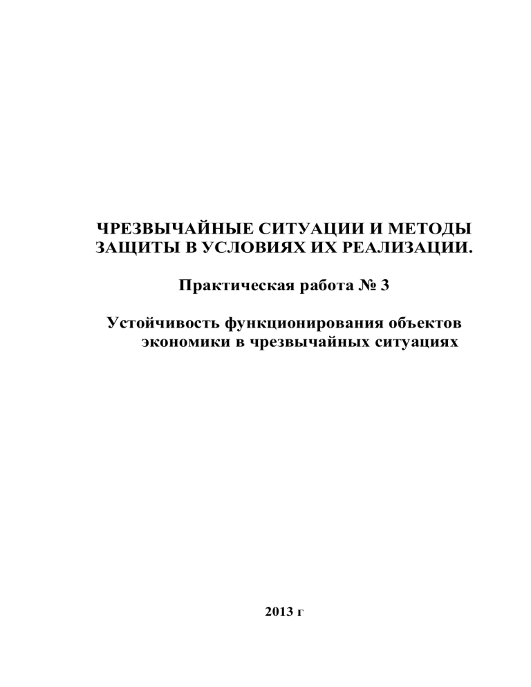 ЧРЕЗВЫЧАЙНЫЕ СИТУАЦИИ И МЕТОДЫ ЗАЩИТЫ В УСЛОВИЯХ ИХ РЕАЛИЗАЦИИ. Практическая работа № 3 Устойчивость функционирования объектов экономики в чрезвычайных ситуациях 2013 г 1. Разработка варианта Плана гражданской обороны и защиты населения объекта (организации, учреждения) 1.1. Цель практического занятия Научить студентов разрабатывать План гражданской обороны для повышения устойчивости объектов экономики в условиях ЧС и защиты населения. 1.2. Порядок выполнения 2.1. Ознакомиться с методикой разработки Плана гражданской обороны для повышения устойчивости объектов экономики и защиты населения (в дальнейшем – План). 2.2. Выбрать свой вариант задания по таблице вариантов (см. с. 38-40). Номер вариантов соответствует порядковому номеру студента в журнале учета занятий. 2.3. Выписать из таблицы вариантов исходные данные. 2.4. Разработать и оформить на отдельных листах План и приложения к нему на основе расчетов в соответствии с исходными данными своего варианта по приведенному в работе образцу. 2.5. Оформить отчет о практической работе в соответствии с требованиями к оформлению практических, курсовых и дипломных работ и защитить ее у преподавателя. 1.3. Методика выполнения расчетов Разработка Плана гражданской обороны и защиты населения требует большой подготовительной работы штаба ГО ЧС объекта. Необходимо выполнить расчеты сил и средств, которые могут быть использованы для ликвидации последствий от опасностей, возникающих при ведении военных действий или вследствие этих действий, а также при возникновении ЧС природного и техногенного характера. 1.3.1. Расчет вероятного числа людей, попадающих в зону заражения 3.1.1. Определяют среднюю плотность заселения, используя следующее соотношение: Число жителей района/Площадь района = Плотность заселения 3.1.2. Определяют площадь заражения данного района. 3.1.3. Определяют вероятное число пострадавших. Плотность заселения × Площадь заражения = Вероятное число пострадавших 4 1.3.2. Расчет структуры потерь людей в очаге поражения аварийнохимическими опасными веществами (АХОВ) с предельно допустимой концентрацией (ПДК), значительно превышающей норму Ориентировочно структура потерь людей в очаге поражения АХОВ выглядит следующим образом: пораженных в легкой степени – 25%, в средней и тяжелой степени (с выходом из строя не менее чем на 2-3 недели и нуждающихся в госпитализации) – 40%, со смертельным исходом – 35%. Общее число пораженных зависит от степени защищенности населения. Так, потери людей, находящихся на открытой местности в зоне заражения без средств индивидуальной защиты (СИЗ), могут составить 90-100% общего числа людей в этой зоне. Если население обеспечено СИЗ (противогазами) на 20, 40, 60, 90 %, то потери могут составить соответственно 75, 58, 40, 18 %. При размещении людей в простейших укрытиях, зданиях потери будут в 2 раза меньше. Пример. Вероятное число людей, попавших в зону заражения, 9000. Обеспеченность населения противогазами 40%, люди приняли сигнал оповещения и находятся в зданиях. Определить возможные потери людей, находящихся на открытой местности: 9000/100 × 58 = 5220 чел. Определить возможные потери людей, находящихся в зданиях: 5220/2 = 2610 чел. Определить структуру потерь людей в очаге поражения: поражения легкой степени 2610/100 × 25 = 653 чел.; поражения средней и тяжелой степени 2610/100 × 40 = 1044 чел.; со смертельным исходом 2