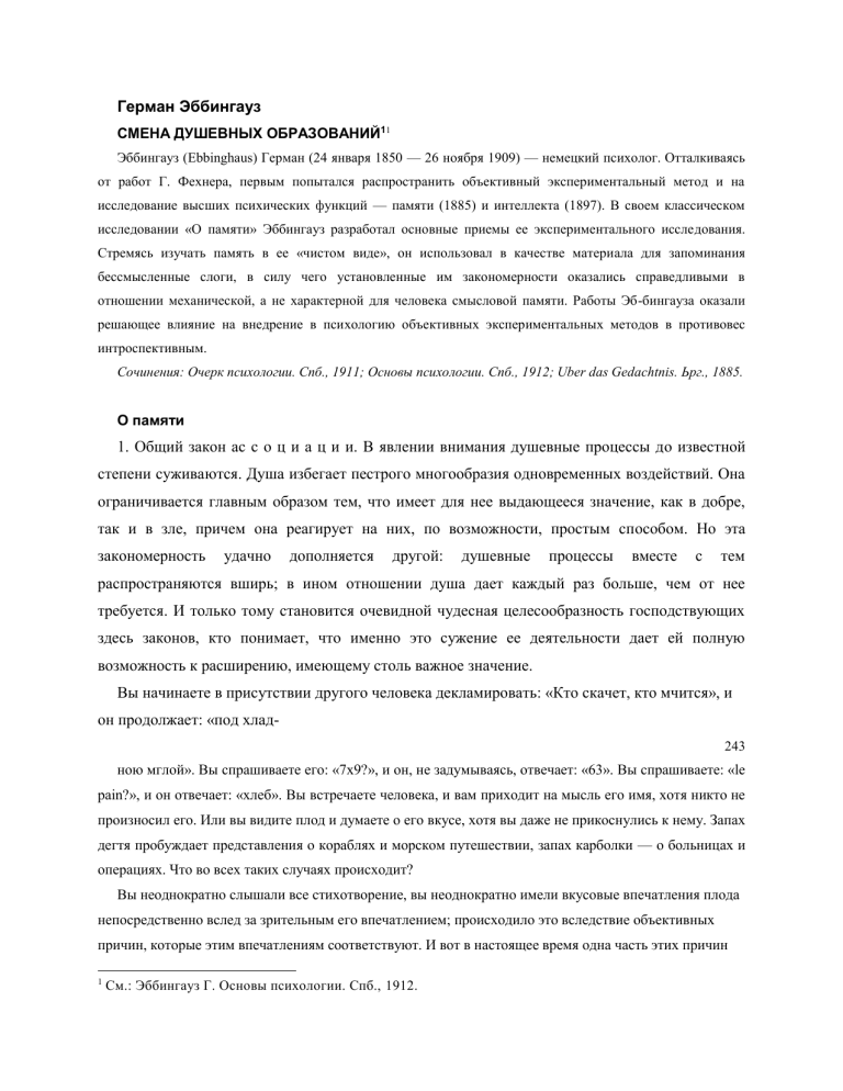 Герман Эббингауз СМЕНА ДУШЕВНЫХ ОБРАЗОВАНИЙ11 Эббингауз (Ebbinghaus) Герман (24 января 1850 — 26 ноября 1909) — немецкий психолог. Отталкиваясь от работ Г. Фехнера, первым попытался распространить объективный экспериментальный метод и на исследование высших психических функций — памяти (1885) и интеллекта (1897). В своем классическом исследовании «О памяти» Эббингауз разработал основные приемы ее экспериментального исследования. Стремясь изучать память в ее «чистом виде», он использовал в качестве материала для запоминания бессмысленные слоги, в силу чего установленные им закономерности оказались справедливыми в отношении механической, а не характерной для человека смысловой памяти. Работы Эб-бингауза оказали решающее влияние на внедрение в психологию объективных экспериментальных методов в противовес интроспективным. Сочинения: Очерк психологии. Спб., 1911; Основы психологии. Спб., 1912; Uber das Gedachtnis. Ьрг., 1885. О памяти 1. Общий закон ас с о ц и а ц и и. В явлении внимания душевные процессы до известной степени суживаются. Душа избегает пестрого многообразия одновременных воздействий. Она ограничивается главным образом тем, что имеет для нее выдающееся значение, как в добре, так и в зле, причем она реагирует на них, по возможности, простым способом. Но эта закономерность удачно дополняется другой: душевные процессы вместе с тем распространяются вширь; в ином отношении душа дает каждый раз больше, чем от нее требуется. И только тому становится очевидной чудесная целесообразность господствующих здесь законов, кто понимает, что именно это сужение ее деятельности дает ей полную возможность к расширению, имеющему столь важное значение. Вы начинаете в присутствии другого человека декламировать: «Кто скачет, кто мчится», и он продолжает: «под хлад243 ною мглой». Вы спрашиваете его: «7x9?», и он, не задумываясь, отвечает: «63». Вы спрашиваете: «le pain?», и он отвечает: «хлеб». Вы встречаете человека, и вам приходит на мысль его имя, хотя никто не произносил его. Или вы видите плод и думаете о его вкусе, хотя вы даже не прикоснулись к нему. Запах дегтя пробуждает представления о кораблях и морском путешествии, запах карболки — о больницах и операциях. Что во всех таких случаях происходит? Вы неоднократно слышали все стихотворение, вы неоднократно имели вкусовые впечатления плода непосредственно вслед за зрительным его впечатлением; происходило это вследствие объективных причин, которые этим впечатлениям соответствуют. И вот в настоящее время одна часть этих причин 1 См.: Эббингауз Г. Основы психологии. Спб., 1912. снова воздействует на душу и вызывает соответствующие впечатления, а остальные причины отсутствуют; тем не менее действия и этих отсутствующих причин вступают в сознание по крайней мере как представления отсутствующих причин. И вообще если какие-либо душевные образования когда-нибудь заполняли сознание одновременно или в близкой последовательности, то впоследствии повторение одних членов этого прежнего переживания вызывает представления и остальных членов, хотя бы первоначальные причины их и отсутствовали. Наша душа расширяет и обогащает всегда то, что ей непосредственно дано, на основе прежних своих переживаний. При помощи представлений она постоянно восстанавливает те более обширные связи и более значительные единства, в которых она некогда п