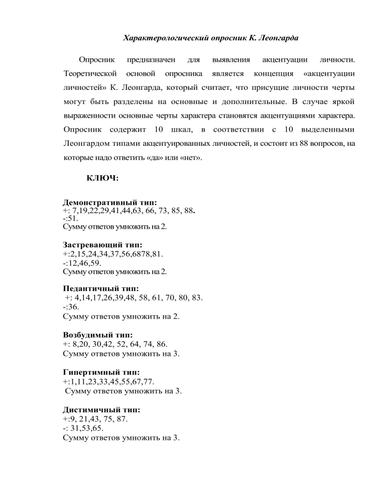 Характерологический опросник К. Леонгарда Опросник Теоретической предназначен основой для опросника выявления является акцентуации концепция личности. «акцентуации личностей» К. Леонгарда, который считает, что присущие личности черты могут быть разделены на основные и дополнительные. В случае яркой выраженности основные черты характера становятся акцентуациями характера. Опросник содержит 10 шкал, в соответствии с 10 выделенными Леонгардом типами акцентуированных личностей, и состоит из 88 вопросов, на которые надо ответить «да» или «нет». КЛЮЧ: Демонстративный тип: +: 7,19,22,29,41,44,63, 66, 73, 85, 88. -:51. Сумму ответов умножить на 2. Застревающий тип: +:2,15,24,34,37,56,6878,81. -:12,46,59. Сумму ответов умножить на 2. Педантичный тип: +: 4,14,17,26,39,48, 58, 61, 70, 80, 83. -:36. Сумму ответов умножить на 2. Возбудимый тип: +: 8,20, 30,42, 52, 64, 74, 86. Сумму ответов умножить на 3. Гипертимный тип: +:1,11,23,33,45,55,67,77. Сумму ответов умножить на 3. Дистимичный тип: +:9, 21,43, 75, 87. -: 31,53,65. Сумму ответов умножить на 3. Тревожно-боязливый тип: +:16,27,38,49,60,71,82. -:5. Сумму ответов умножить на 3. Аффективно-экзальтированный тип: +: 10,32,54,76. Сумму ответов умножить на 6. Эмотивный тип: +:3, 13,35,47,57,69,79. -:25. Сумму ответов умножить на 3. Циклотимный тип: +:6,18,28,40,50,62,72,84. Сумму ответов умножить на 3. Максимальная сумма баллов после умножения - 24. По некоторым источникам, признаком акцентуации считается величина, превосходящая 12 баллов. Другие же на основании практического применения опросника считают, что сумма баллов в диапазоне от 15 до 19 говорит лишь о тенденции к тому или иному типу акцентуации. И лишь в случае превышения 19 баллов черта характера является акцентуированной. ВОПРОСЫ 1. Является ли ваше настроение в общем веселым и беззаботным? 2. Восприимчивы ли вы к обидам? 3. Случалось ли вам иногда быстро заплакать? 4. Всегда ли вы считаете себя правым в том деле, которое делаете, и вы не успокоитесь, пока не убедитесь в этом? 5. Считаете ли вы себя более смелым, чем в детском возрасте? 6. Может ли ваше настроение меняться от глубокой радости до глубокой печали? 7. Находитесь ли вы в компании в центре внимания? 8. Бывают ли у вас дни, когда вы без достаточных оснований находитесь в угрюмом и раздражительном настроении и ни с кем не хотите разговаривать? 9. Серьезный ли вы человек? 10.Можете ли вы сильно воодушевиться? 11.Предприимчивы ли вы? 12.Быстро ли забываете, если кто-то вас обидит? 13.Мягкосердечный ли вы человек? 14.Пытаетесь ли вы проверить после того, как опустили письмо в ящик, не осталось ли оно висеть в прорези? 15.Всегда ли вы стараетесь быть добросовестным в работе? 16. Испытывали ли вы в детстве страх перед грозой или собаками? 17.Считаете ли вы других людей недостаточно требовательными друг к другу? 18.Сильно ли зависит ваше настроение от жизненных событий и переживаний? 19.Всегда ли вы прямодушны со своими знакомыми? 20.Часто ли ваше настроение бывает подавленным? 21.Был ли у вас раньше истерический припадок или истощение нервной системы? 22.Склонны ли вы к состояниям внутреннего беспокойства или страстного стремления? 23.Трудно ли вам длительное время просидеть на стуле? 24.Боретесь ли вы за свои интересы, если кто-то поступает с вами несправедливо? 25.Смогли бы вы убить человека? 26.Сильно ли вам мешает косо висящая гардина или неровно настланная скатерть, настолько, что вам хочется устранить эти недостатки? 27. Испытывали ли вы в детстве страх, когда
