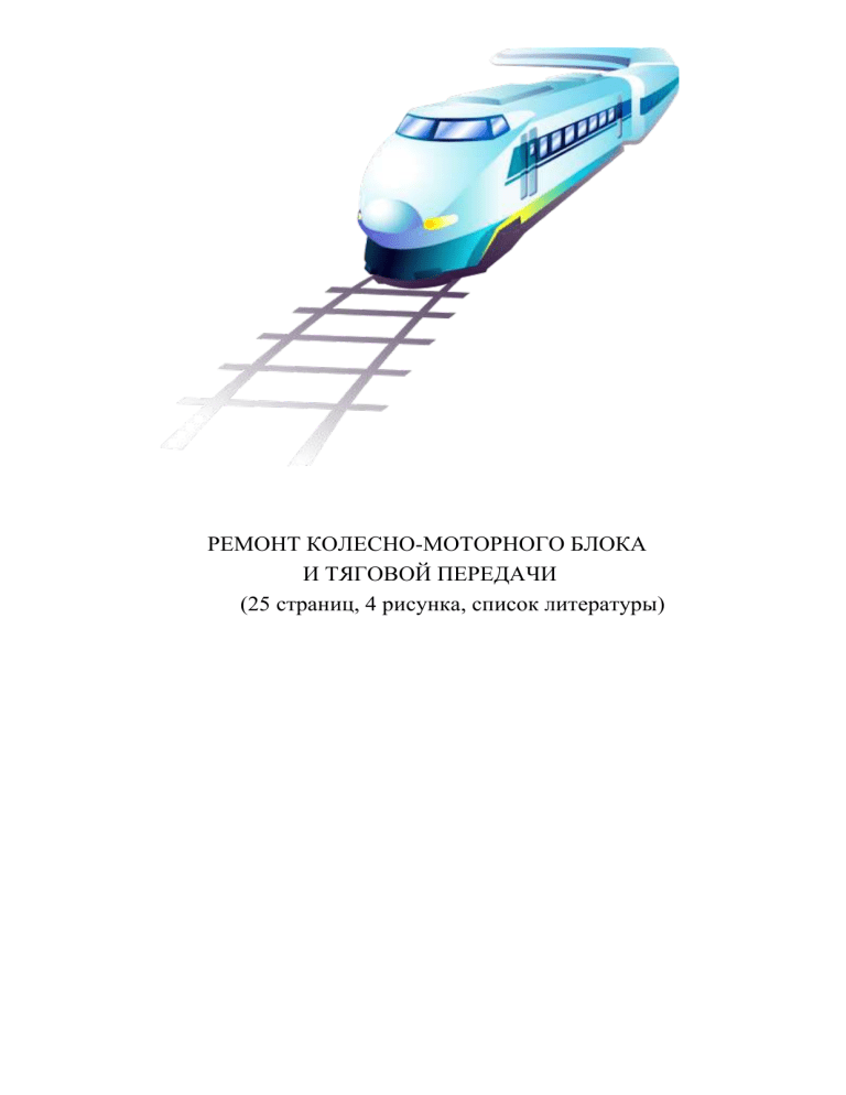 РЕМОНТ КОЛЕСНО-МОТОРНОГО БЛОКА И ТЯГОВОЙ ПЕРЕДАЧИ (25 страниц, 4 рисунка, список литературы) СОДЕРЖАНИЕ Введение …………………………………………………………………….3 1 Краткая характеристика подвешивания тягового двигателя и тяговой передачи ………………………………………………………..……………….5 2 Текущий ремонт ТР-3 колесно-моторного блока и тяговой передачи 11 2.1 Разборка и ремонт колесно-моторного блока ……..…………………11 2.2 Сборка колесно-моторного блока ……………….……………………17 3 Техника безопасности при выполнении слесарных работ …….………22 Заключение …………………………………………………………………24 Литература ………………………………………………………………….25 ВСТАВЬ СВОЙ ШИФР Изм. Лист № докум. Разраб. Иванов Провер. Иванов Реценз. Иванов Н. Контр. Иванов Утверд. Иванов Подпись Дата Ремонт колесномоторного блока и тяговой передачи Лит. Лист Листов 2 ПУ-1 гр. № 1 ВВЕДЕНИЕ Идея использования электрической энергии для тяги рельсового транспорта в России была практически решена в 1876 г., когда на пассажирском вагоне был установлен электрический двигатель, а в 1880 г. построен рельсовый путь для испытаний вагона в движении. Однако, несмотря на ряд практических предложений и проектов, электрические локомотивы не производились вплоть до начала электрификации железных дорог в 1924 г. В 1932 г. на Московском заводе «Динамо» были созданы тяговые двигатели, установленные на электровозе серии С, а затем совместно с Коломенским заводом был построен первый грузовой электровоз серии ВЛ19. Первый пассажирский электровоз был построен в 1934 г. на Коломенском заводе. Это был самый мощный в Европе электровоз, который развивал скорость 85 км/ч. На железных дорогах России эксплуатируется несколько типов электровозов. Их классификация осуществляется по роду тока, типу передач, виду работы и осевым характеристикам. По роду тока, подводимого к электровозам, различают магистральные электровозы постоянного тока с номинальным напряжением на токоприемнике З кВ, переменного однофазного тока напряжением 25 кВ, частотой 50Гц и электровозы двойного питания. В зависимости от способа передачи вращающего момента от тягового двигателя на колесные пары различают электровозы с индивидуальным и групповым приводом. При индивидуальном приводе вращающий момент передается на колесную пару от отдельного тягового двигателя. При групповом приводе вращающий момент от одного тягового двигателя передается группе колесных пар через специальный редуктор. ВСТАВЬ СВОЙ ШИФР Изм. Лист № докум. Подпись Дата Лист 3 Большинство электровозов имеют индивидуальный привод, более удобный в эксплуатации. По роду работы электровозы подразделяются на грузовые, пассажирские и маневровые. Основными сериями грузовых электровозов постоянного тока являются ВЛП, ВЛ10, ВЛ10у и переменного тока ВЛ80к, ВЛ80р, ВЛ80т, ВЛ85. Электровоз ВЛ82М является локомотивом двойного питания. В пассажирском движении эксплуатируются электровозы постоянного тока серий ЧС2,ЧС2Т, ЧС6, ЧС7, ЧС200 и переменного тока ЧС4, ЧС4Т, ЧС8. На Коломенском и Новочеркасском заводах изготовлен восьмиосный пассажирский электровоз переменного тока ЭП200, рассчитанный на скорость движения 200 км/ч. ВСТАВЬ СВОЙ ШИФР Изм. Лист № докум. Подпись Дата Лист 4 1 КРАТКАЯ ХАРАКТЕРИСТИКА ПОДВЕШИВАНИЯ ТЯГОВОГО ДВИГАТЕЛЯ И ТЯГОВОЙ ПЕРЕДАЧИ Для передачи вращающего момента от вала тяго
