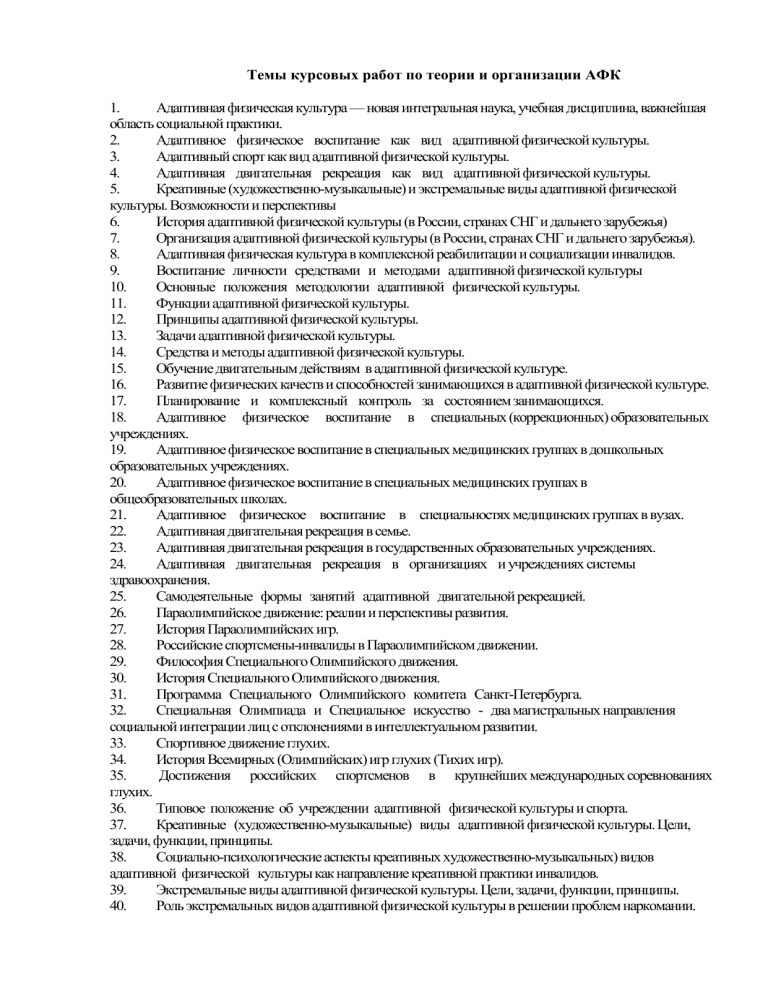 Темы курсовых работ по теории и организации АФК 1. Адаптивная физическая культура — новая интегральная наука, учебная дисциплина, важнейшая область социальной практики. 2. Адаптивное физическое воспитание как вид адаптивной физической культуры. 3. Адаптивный спорт как вид адаптивной физической культуры. 4. Адаптивная двигательная рекреация как вид адаптивной физической культуры. 5. Креативные (художественно-музыкальные) и экстремальные виды адаптивной физической культуры. Возможности и перспективы 6. История адаптивной физической культуры (в России, странах СНГ и дальнего зарубежья) 7. Организация адаптивной физической культуры (в России, странах СНГ и дальнего зарубежья). 8. Адаптивная физическая культура в комплексной реабилитации и социализации инвалидов. 9. Воспитание личности средствами и методами адаптивной физической культуры 10. Основные положения методологии адаптивной физической культуры. 11. Функции адаптивной физической культуры. 12. Принципы адаптивной физической культуры. 13. Задачи адаптивной физической культуры. 14. Средства и методы адаптивной физической культуры. 15. Обучение двигательным действиям в адаптивной физической культуре. 16. Развитие физических качеств и способностей занимающихся в адаптивной физической культуре. 17. Планирование и комплексный контроль за состоянием занимающихся. 18. Адаптивное физическое воспитание в специальных (коррекционных) образовательных учреждениях. 19. Адаптивное физическое воспитание в специальных медицинских группах в дошкольных образовательных учреждениях. 20. Адаптивное физическое воспитание в специальных медицинских группах в общеобразовательных школах. 21. Адаптивное физическое воспитание в специальностях медицинских группах в вузах. 22. Адаптивная двигательная рекреация в семье. 23. Адаптивная двигательная рекреация в государственных образовательных учреждениях. 24. Адаптивная двигательная рекреация в организациях и учреждениях системы здравоохранения. 25. Самодеятельные формы занятий адаптивной двигательной рекреацией. 26. Параолимпийское движение: реалии и перспективы развития. 27. История Параолимпийских игр. 28. Российские спортсмены-инвалиды в Параолимпийском движении. 29. Философия Специального Олимпийского движения. 30. История Специального Олимпийского движения. 31. Программа Специального Олимпийского комитета Санкт-Петербурга. 32. Специальная Олимпиада и Специальное искусство - два магистральных направления социальной интеграции лиц с отклонениями в интеллектуальном развитии. 33. Спортивное движение глухих. 34. История Всемирных (Олимпийских) игр глухих (Тихих игр). 35. Достижения российских спортсменов в крупнейших международных соревнованиях глухих. 36. Типовое положение об учреждении адаптивной физической культуры и спорта. 37. Креативные (художественно-музыкальные) виды адаптивной физической культуры. Цели, задачи, функции, принципы. 38. Социально-психологические аспекты креативных художественно-музыкальных) видов адаптивной физической культуры как направление креативной практики инвалидов. 39. Экстремальные виды адаптивной физической культуры. Цели, задачи, функции, принципы. 40. Роль экстремальных видов адаптивной физической культуры в решении проблем наркомании. 41. Государственные социальные программы развития адаптивной физической культур