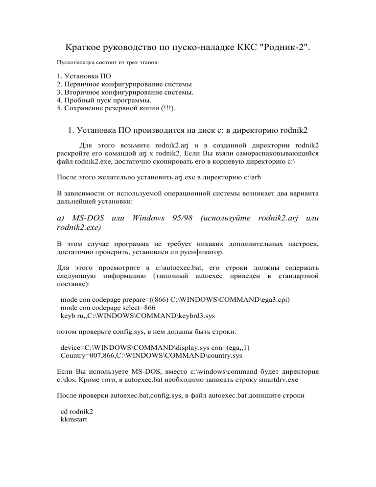 Краткое руководство по пуско-наладке ККС "Родник-2". Пусконаладка состоит из трех этапов: 1. Установка ПО 2. Первичное конфигурирование системы 3. Вторичное конфигурирование системы. 4. Пробный пуск программы. 5. Сохранение резервной копии (!!!). 1. Установка ПО производится на диск c: в директорию rodnik2 Для этого возьмите rodnik2.arj и в созданной директории rodnik2 раскройте его командой arj x rodnik2. Если Вы взяли самораспаковывающийся файл rodnik2.exe, достаточно скопировать его в корневую директорию c:\ После этого желательно установить arj.exe в директорию c:\arh В зависимости от используемой операционной системы возникает два варианта дальнейшей установки: а) MS-DOS или Windows 95/98 (используйте rodnik2.arj или rodnik2.exe) В этом случае программа не требует никаких дополнительных настроек, достаточно проверить, установлен ли русификатор. Для этого просмотрите в c:\autoexec.bat, его строки должны содержать следующую информацию (типичный autoexec приведен в стандартной поставке): mode con codepage prepare=((866) C:\WINDOWS\COMMAND\ega3.cpi) mode con codepage select=866 keyb ru,,C:\WINDOWS\COMMAND\keybrd3.sys потом проверьте config.sys, в нем должны быть строки: device=C:\WINDOWS\COMMAND\display.sys con=(ega,,1) Country=007,866,C:\WINDOWS\COMMAND\country.sys Если Вы используете MS-DOS, вместо c:\windows\command будет директория c:\dos. Кроме того, в autoexec.bat необходимо записать строку smartdrv.exe После проверки autoexec.bat,config.sys, в файл autoexec.bat допишите строки cd rodnik2 kkmstart Программа готова к автозапуску. После этого можно приступать к первичной (пуско-наладочной) установке. б) Windows rodnik2w.exe) 2000/XP/2003 (используйте rodnik2w.arj или Не рекомендуется использование на АЗС систем Windows XP и Windows 2003 из-за их ненадежной работы и сложной настройки. При возможности замените эти операционные системы на Windows 2000. После установки системы необходимо создать ярлык для c:\rodnik2\kkmstart.exe на рабочем столе В свойствах ярлыка необходимо во вкладке "программа" включить по кнопке "Дополнительно..." флажок "Эмуляция аппаратного таймера" и там же сменить файл autoexec с %SystemRoot%\system32\autoexec.nt на c:\rodnik2\autoexec.rod. Во вкладке "Память" установите объем памяти XMS не менее 6 Мб. Система готова к работе. Примечание: в архиве находятся ярлыки, настроенные под директорию установки c:\rodnik2, возможно использовать их, если не была выбрана другая директория. 2. Первичное конфигурирование системы (пуско-наладочное). а) настройка последовательных портов (com.ini) б) настройка внешних устройств (kkm3.ini) в) настройка поведения ТРК (trk2.ini) г) настройка поведения программы (kkm.ini, kkm3.ini) д) ввод конфигурации АЗС. а) настройка последовательных портов (com.ini) com.ini состоит из строк-описаний каналов устройств. Нумерация идет с нулевого канала. Обычно к нулевому каналу подключается ФР, ко второму трансивер - устройство связи с ТРК (основной трансивер обязательно подключать ко 2-му каналу) По умолчанию com.ini настроен на com1 и com2: 3f8 4 4800 0 00 00 2f8 3 4800 0 Формат строки-описания и типичные настройки устройств комментируются внутри файла com.ini Здесь и далее параметр "Канал" или "Канал связи" указывает на канал связи в com.ini б) настройка внешних устройств (kkm3.ini) Разделы [KKM], [Стенд с ценами], [Подключенные уровнемеры] используются для настройки устройств В разделе ККМ задаются регистраторы ( один - для торговли НП, второй - для торговли товарами) ( указаны настройки по умолчанию) Канал связи ФР_1=0 Тип ФР_1=1 Пароль системного администратора_1=30 Если Штрих-ФР новый, то по пароль системного администратора 30, иначе Вы должны узнать пароль у ЦТО или 