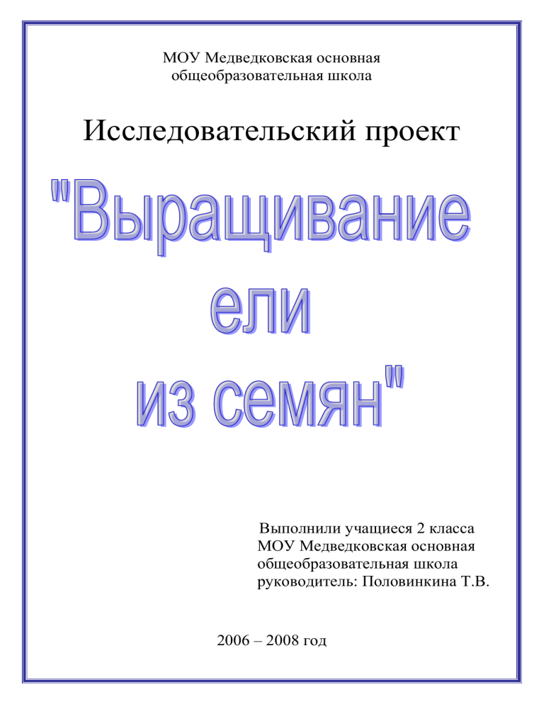 МОУ Медведковская основная общеобразовательная школа Исследовательский проект Выполнили учащиеся 2 класса МОУ Медведковская основная общеобразовательная школа руководитель: Половинкина Т.В. 2006 – 2008 год Цель проекта: Содействовать популяции ели на территории деревни Медведки; Задачи проекта: 1. Разработать практические рекомендации по выращиванию ели; 2. Ознакомить учащихся с методикой лабораторного исследования. Методика: 1. Выходы на природу с целью изучения проблемы «Состояние ели обыкновенной на территории д. Медведки»; 2. Сбор посадочного материала и оценка его качества; 3. Разработка и постановка условий эксперимента; 4. Экспериментальная работа; 5. Наблюдения, выводы, разработка рекомендаций по выращиванию ели обыкновенной. План: 1. Введение. а) Характеристика ели обыкновенной; б) Оценка популяции ели обыкновенной на территории д. Медведки. 2. Практическая часть. а) Сбор и оценка качества посадочного материала; б) Экспериментальная работа по выращиванию ели обыкновенной; в) Результаты наблюдений; г) Выводы. 3. Рекомендации по выращиванию саженцев ели в лабораторных условиях. Характеристика ели обыкновенной Ель – вечнозелёное хвойное дерево с короткими жёсткими иголкамилистьями. У ели густая крона, тонкие ветви расположены часто к стволу. Побеги густо покрыты со всех сторон хвоей, которая сидит отдельными иглами и остаётся на ветвях от 5 до 7 лет. Ветка ели кажется пушистой, но на самом деле она колючая, так как хвоя на ней остроконечная. Ель – порода теневыносливая: ей нужно мало света, может выносить очень долгое затенение. Находясь под пологом других деревьев, ель не погибает, а растёт медленно, оставаясь низенькой, угнетённой. Боковые ветви у неё сильно вытягиваются, крона становится широкой. Если срубить такую ель и подсчитать годовые слои, окажется, что ей столько же лет, сколько и высоким елям этого леса. Если же удалить деревья, которые угнетают ель, то она начнёт догонять в росте другие деревья. Шишки у ели крупнее, чем у сосны; длиной 10 – 15 см. еловые шишки созревают после цветения в тот же год осенью. В январе, феврале, марте семена из них высыпаются и шишки опадают. Семена у ели тёмно-коричневого цвета с острым кончиком. Ель растёт до 250 – 300 лет. Молодые шишки ели. К почвенным условиям ель очень требовательна. Для хорошего роста ей нужны суглинистые плодородные почвы, не сухие, но и не слишком влажные. Ель – порода морозостойкая, но страдает от весенних заморозков. Стержневой корень скоро перестаёт расти, развиваются боковые поверхностные корни, поэтому ель легко валит ветер. В ельнике густой полог ветвей пропускает мало света, задерживает ветер и осадки. В еловом лесу всегда тишина и сумрак, почва слабо нагревается, глубже промерзает и дольше оттаивает весной. В густом еловом лесу не бывает травы, почва покрыта мхами и лесной подстилкой, главным образом перегнивающей хвоей. Еловый лес. Прямые стволы ели дают прекрасный строевой и поделочный материал. Равнослойная древесина ели используется для изготовления музыкальных инструментов. Из неё делают огромное количество кровельной и штукатурной дранки и различные щепные изделия: корзины, лукошки, решета, игрушки. Еловая древесина идёт на изготовление бумаги. Оценка популяции ели на территории д. Медведки: Ель обыкновенная произрастает на территории деревни Медведки. 