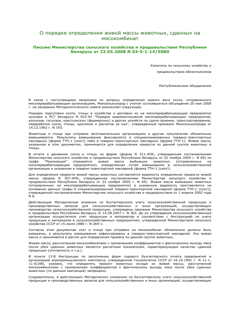 О порядке определения живой массы животных, сданных на мясокомбинат Письмо Министерства сельского хозяйства и продовольствия Республики Беларусь от 22.05.2008 N 03-5-1-14/5080 Комитеты по сельскому хозяйству и продовольствию облисполкомов Республиканские объединения В связи с поступающими запросами по вопросу определения живого веса скота, отправленного мясоперерабатывающим организациям, Минсельхозпрод с учетом состоявшегося обсуждения 20 мая 2008 г. на заседании Методологического совета разъясняет следующее. Порядок подготовки скота, птицы в хозяйстве и доставки их на мясоперерабатывающие предприятия изложен в РСТ Беларуси N 923-92 "Порядок взаимоотношений мясоперерабатывающих предприятий, колхозов, госхозов, крестьянских (фермерских) и других хозяйств по сдаче-приемке, транспортированию, переработке скота, птицы, кроликов и расчетов за них", утвержденный приказом Минсельхозпрода от 14.12.1992 г. N 193. Животные и птица при отправке заготовительным организациям и другим покупателям обязательно взвешиваются. Результаты взвешивания фиксируются в специализированных товарно-транспортных накладных (форма ТТН-1 (скот)) либо в товарно-транспортных накладных (форма ТТН-1). Живая масса, указанная в этих документах, принимается для определения прироста по данной группе животных и птицы. В отчете о движении скота и птицы на ферме (форма N 311-АПК, утвержденная постановлением Министерства сельского хозяйства и продовольствия Республики Беларусь от 22 ноября 2005 г. N 69) по графе "Реализация" отражается живая масса выбывших животных (отправленных на мясоперерабатывающие предприятия), определенная путем взвешивания в сельскохозяйственной организации и указанная в товарно-транспортной накладной (форма ТТН-1 (скот)). Для определения прироста живой массы животных составляется ведомость определения прироста живой массы (форма N 307-АПК, утвержденная постановлением Министерства сельского хозяйства и продовольствия Республики Беларусь от 22 ноября 2005 г. N 69). Живая масса выбывших животных (отправленных на мясоперерабатывающие предприятия) в указанную ведомость проставляется на основании данных графы 6 специализированной товарно-транспортной накладной (форма ТТН-1 (скот)), утвержденной постановлением Министерства сельского хозяйства и продовольствия от 1 апреля 2002 года N 8. Действующие Методические указания по бухгалтерскому учету сельскохозяйственной продукции и производственных запасов для сельскохозяйственных и иных организаций, осуществляющих производство сельскохозяйственной продукции, утверждены приказом Министерства сельского хозяйства и продовольствия Республики Беларусь от 14.08.2007 г. N 363. До их утверждения сельскохозяйственные организации осуществляли учет продукции и материалов в соответствии с Инструкцией по учету продукции и материалов в сельскохозяйственных предприятиях, утвержденной Министерством сельского хозяйства СССР от 15 июля 1980 г. N 269-1. Согласно этим документам скот и птица при отправке на мясокомбинат обязательно должны быть взвешены, а результаты взвешивания зафиксированы в товарно-транспортной накладной. Эта живая масса и принимается в расчет для определения привеса по данной группе животных. Живая масса, рассчитанная мясокомбинатами с применением коэффициентов к фактическому выходу мяса после убоя сданных животны
