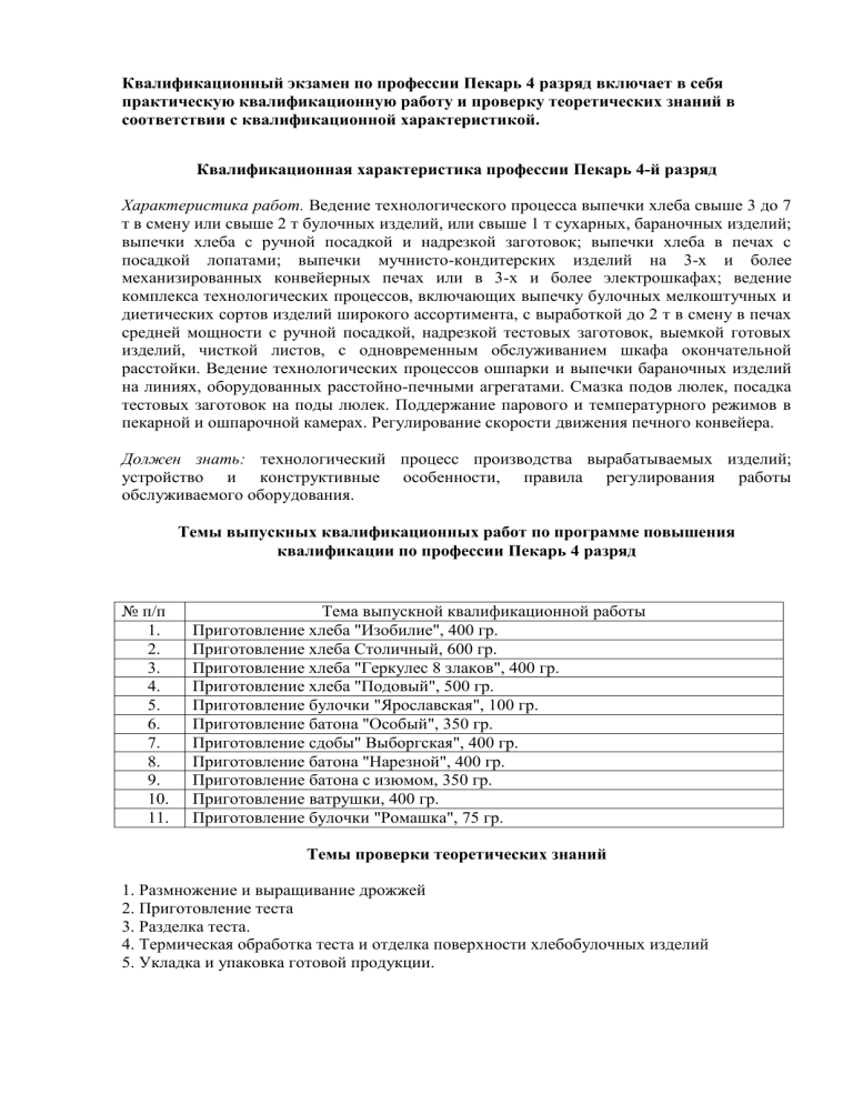 Квалификационный экзамен по профессии Пекарь 4 разряд включает в себя практическую квалификационную работу и проверку теоретических знаний в соответствии с квалификационной характеристикой. Квалификационная характеристика профессии Пекарь 4-й разряд Характеристика работ. Ведение технологического процесса выпечки хлеба свыше 3 до 7 т в смену или свыше 2 т булочных изделий, или свыше 1 т сухарных, бараночных изделий; выпечки хлеба с ручной посадкой и надрезкой заготовок; выпечки хлеба в печах с посадкой лопатами; выпечки мучнисто-кондитерских изделий на 3-х и более механизированных конвейерных печах или в 3-х и более электрошкафах; ведение комплекса технологических процессов, включающих выпечку булочных мелкоштучных и диетических сортов изделий широкого ассортимента, с выработкой до 2 т в смену в печах средней мощности с ручной посадкой, надрезкой тестовых заготовок, выемкой готовых изделий, чисткой листов, с одновременным обслуживанием шкафа окончательной расстойки. Ведение технологических процессов ошпарки и выпечки бараночных изделий на линиях, оборудованных расстойно-печными агрегатами. Смазка подов люлек, посадка тестовых заготовок на поды люлек. Поддержание парового и температурного режимов в пекарной и ошпарочной камерах. Регулирование скорости движения печного конвейера. Должен знать: технологический процесс производства вырабатываемых изделий; устройство и конструктивные особенности, правила регулирования работы обслуживаемого оборудования. Темы выпускных квалификационных работ по программе повышения квалификации по профессии Пекарь 4 разряд № п/п 1. 2. 3. 4. 5. 6. 7. 8. 9. 10. 11. Тема выпускной квалификационной работы Приготовление хлеба "Изобилие", 400 гр. Приготовление хлеба Столичный, 600 гр. Приготовление хлеба "Геркулес 8 злаков", 400 гр. Приготовление хлеба "Подовый", 500 гр. Приготовление булочки "Ярославская", 100 гр. Приготовление батона "Особый", 350 гр. Приготовление сдобы" Выборгская", 400 гр. Приготовление батона "Нарезной", 400 гр. Приготовление батона с изюмом, 350 гр. Приготовление ватрушки, 400 гр. Приготовление булочки "Ромашка", 75 гр. Темы проверки теоретических знаний 1. Размножение и выращивание дрожжей 2. Приготовление теста 3. Разделка теста. 4. Термическая обработка теста и отделка поверхности хлебобулочных изделий 5. Укладка и упаковка готовой продукции.