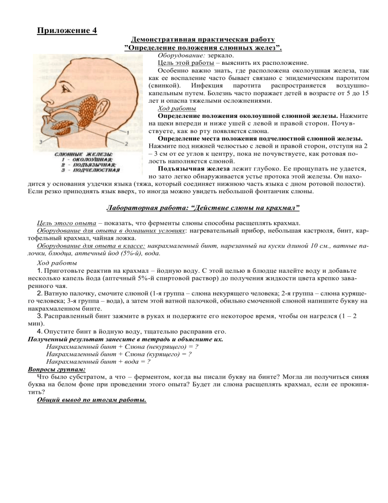 Приложение 4 Демонстративная практическая работу ”Определение положения слюнных желез”. Оборудование: зеркало. Цель этой работы – выяснить их расположение. Особенно важно знать, где расположена околоушная железа, так как ее воспаление часто бывает связано с эпидемическим паротитом (свинкой). Инфекция паротита распространяется воздушнокапельным путем. Болезнь часто поражает детей в возрасте от 5 до 15 лет и опасна тяжелыми осложнениями. Ход работы Определение положения околоушной слюнной железы. Нажмите на щеки впереди и ниже ушей с левой и правой сторон. Почувствуете, как во рту появляется слюна. Определение места положения подчелюстной слюнной железы. Нажмите под нижней челюстью с левой и правой сторон, отступя на 2 – 3 см от ее углов к центру, пока не почувствуете, как ротовая полость наполняется слюной. Подъязычная железа лежит глубоко. Ее прощупать не удается, но зато легко обнаруживается устье протока этой железы. Он находится у основания уздечки языка (тяжа, который соединяет нижнюю часть языка с дном ротовой полости). Если резко приподнять язык вверх, то иногда можно увидеть небольшой фонтанчик слюны. Лабораторная работа: “Действие слюны на крахмал” Цель этого опыта – показать, что ферменты слюны способны расщеплять крахмал. Оборудование для опыта в домашних условиях: нагревательный прибор, небольшая кастрюля, бинт, картофельный крахмал, чайная ложка. Оборудование для опыта в классе: накрахмаленный бинт, нарезанный на куски длиной 10 см., ватные палочки, блюдца, аптечный йод (5%-й), вода. Ход работы 1. Приготовьте реактив на крахмал – йодную воду. С этой целью в блюдце налейте воду и добавьте несколько капель йода (аптечный 5%-й спиртовой раствор) до получения жидкости цвета крепко заваренного чая. 2. Ватную палочку, смочите слюной (1-я группа – слюна некурящего человека; 2-я группа – слюна курящего человека; 3-я группа – вода), а затем этой ватной палочкой, обильно смоченной слюной напишите букву на накрахмаленном бинте. 3. Расправленный бинт зажмите в руках и подержите его некоторое время, чтобы он нагрелся (1 – 2 мин). 4. Опустите бинт в йодную воду, тщательно расправив его. Полученный результат занесите в тетрадь и объясните их. Накрахмаленный бинт + Слюна (некурящего) = ? Накрахмаленный бинт + Слюна (курящего) = ? Накрахмаленный бинт + вода = ? Вопросы группам: Что было субстратом, а что – ферментом, когда вы писали букву на бинте? Могла ли получиться синяя буква на белом фоне при проведении этого опыта? Будет ли слюна расщеплять крахмал, если ее прокипятить? Общий вывод по итогам работы.