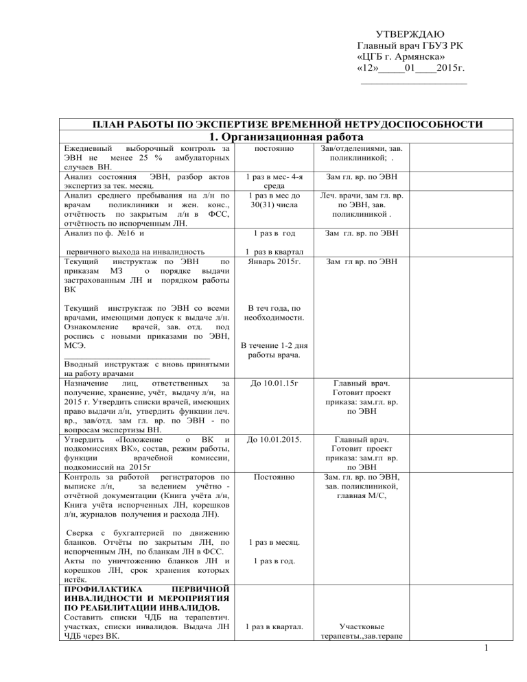 УТВЕРЖДАЮ Главный врач ГБУЗ РК «ЦГБ г. Армянска» «12»_____01____2015г. ____________________ ПЛАН РАБОТЫ ПО ЭКСПЕРТИЗЕ ВРЕМЕННОЙ НЕТРУДОСПОСОБНОСТИ 1. Организационная работа Ежедневный выборочный контроль за ЭВН не менее 25 % амбулаторных случаев ВН. Анализ состояния ЭВН, разбор актов экспертиз за тек. месяц. Анализ среднего пребывания на л/н по врачам поликлиники и жен. конс., отчётность по закрытым л/н в ФСС, отчётность по испорченным ЛН. Анализ по ф. №16 и постоянно Зав/отделениями, зав. поликлиникой; . 1 раз в мес- 4-я среда 1 раз в мес до 30(31) числа Зам гл. вр. по ЭВН Леч. врачи, зам гл. вр. по ЭВН, зав. поликлиникой . 1 раз в год Зам гл. вр. по ЭВН первичного выхода на инвалидность Текущий инструктаж по ЭВН по приказам МЗ о порядке выдачи застрахованным ЛН и порядком работы ВК 1 раз в квартал Январь 2015г. Зам гл вр. по ЭВН Текущий инструктаж по ЭВН со всеми врачами, имеющими допуск к выдаче л/н. Ознакомление врачей, зав. отд. под роспись с новыми приказами по ЭВН, МСЭ. _________________________________ Вводный инструктаж с вновь принятыми на работу врачами Назначение лиц, ответственных за получение, хранение, учёт, выдачу л/н, на 2015 г. Утвердить списки врачей, имеющих право выдачи л/н, утвердить функции леч. вр., зав/отд. зам гл. вр. по ЭВН - по вопросам экспертизы ВН. Утвердить «Положение о ВК и подкомиссиях ВК», состав, режим работы, функции врачебной комиссии, подкомиссий на 2015г Контроль за работой регистраторов по выписке л/н, за ведением учётно отчётной документации (Книга учёта л/н, Книга учёта испорченных ЛН, корешков л/н, журналов получения и расхода ЛН). В теч года, по необходимости. Сверка с бухгалтерией по движению бланков. Отчёты по закрытым ЛН, по испорченным ЛН, по бланкам ЛН в ФСС. Акты по уничтожению бланков ЛН и корешков ЛН, срок хранения которых истёк. ПРОФИЛАКТИКА ПЕРВИЧНОЙ ИНВАЛИДНОСТИ И МЕРОПРИЯТИЯ ПО РЕАБИЛИТАЦИИ ИНВАЛИДОВ. Составить списки ЧДБ на терапевтич. участках, списки инвалидов. Выдача ЛН ЧДБ через ВК. В течение 1-2 дня работы врача. До 10.01.15г Главный врач. Готовит проект приказа: зам.гл. вр. по ЭВН До 10.01.2015. Главный врач. Готовит проект приказа: зам.гл вр. по ЭВН Зам. гл. вр. по ЭВН, зав. поликлиникой, главная М/С, Постоянно 1 раз в месяц. 1 раз в год. 1 раз в квартал. Участковые терапевты.,зав.терапе 1 Анализ первичного инвалидность. выхода на Контроль за выполнением индивидуальной программы реабилитации инвалидов в соответствии с индивидуальными планами. 1 раз в месяц. По итогам всеобщей диспансеризации составить группы Д учёта. Довести % охвата ВД до 100%. Проводить меры медицинского характера по оздоровлению больных по индивидуальному плану : курсы профилактического лечения, направление на плановые операции в т. ч. на ВТМП, рекомендации по диетпитанию, беседы об отказе от вредных привычек, направление б-х к наркологу; санкурлечение, выдача справок на облегчённые условия труда, выдача справок по отстранению от работы с противопоказанными вредными условиями труда в соответствии с приказом МЗ № 302-н. ежемесячно втическим отделением поликлиники,Зав.поли клиникой Участковые терапевты,зав.терапев тическим отделением поликлиники,Зав.поли клиникой Участковые терапевты, зав.терапевтическим отделением поликлиники,Зав.поли клиникой РАБОТА ПО ПОВЫШЕНИЮ КВАЛИФИКАЦИИ ВРАЧЕЙ ПО ЭВН Врачебные конференции. Обучающий семинар по основам ЭВН, Январь Зам гл. вр. по ЭВН изучение приказов М