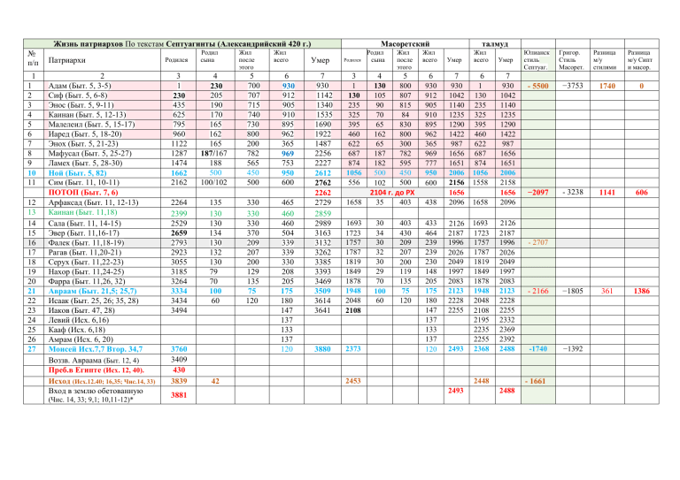 Жизнь патриархов По текстам Септуагинты (Александрийский 420 г.) № п/п 1 1 2 3 4 5 6 7 8 9 10 11 12 13 14 15 16 17 18 19 20 21 22 23 24 25 26 27 Патриархи 2 Адам (Быт. 5, 3-5) Сиф (Быт. 5, 6-8) Энос (Быт. 5, 9-11) Каинан (Быт. 5, 12-13) Малелеил (Быт. 5, 15-17) Иаред (Быт. 5, 18-20) Энох (Быт. 5, 21-23) Мафусал (Быт. 5, 25-27) Ламех (Быт. 5, 28-30) Ной (Быт. 5, 82) Сим (Быт. 11, 10-11) ПОТОП (Быт. 7, 6) Арфаксад (Быт. 11, 12-13) Каинан (Быт. 11,18) Сала (Быт. 11, 14-15) Эвер (Быт. 11,16-17) Фалек (Быт. 11,18-19) Рагав (Быт. 11,20-21) Серух (Быт. 11,22-23) Нахор (Быт. 11,24-25) Фарра (Быт. 11,26, 32) Авраам (Быт. 21,5; 25,7) Исаак (Быт. 25, 26; 35, 28) Иаков (Быт. 47, 28) Левий (Исх. 6,16) Кааф (Исх. 6,18) Амрам (Исх. 6, 20) Моисей Исх.7,7 Втор. 34,7 Воззв. Авраама (Быт. 12, 4) Преб.в Египте (Исх. 12, 40). Исход (Исх.12.40; 16,35; Чис.14, 33) Вход в землю обетованную (Чис. 14, 33; 9,1; 10,11-12)* Родился Родил сына Жил после этого Жил всего 3 1 230 435 625 795 960 1122 1287 1474 1662 2162 4 230 205 190 170 165 162 165 187/167 188 500 100/102 5 700 707 715 740 730 800 200 782 565 450 500 6 930 912 905 910 895 962 365 969 753 950 600 2264 2399 2529 2659 2793 2923 3055 3185 3264 3334 3434 3494 135 130 130 134 130 132 130 79 70 100 60 330 330 330 370 209 207 200 129 135 75 120 465 460 460 504 339 339 330 208 205 175 180 147 137 133 137 120 3760 3409 430 3839 3881 42 Масоретский Умер Родился 7 930 1142 1340 1535 1690 1922 1487 2256 2227 2612 2762 2262 2729 2859 2989 3163 3132 3262 3385 3393 3469 3509 3614 3641 3 1 130 235 325 395 460 622 687 874 1056 556 4 5 6 7 6 7 130 105 90 70 65 162 65 187 182 500 102 800 807 815 84 830 800 300 782 595 450 500 930 912 905 910 895 962 365 969 777 950 600 1 130 235 325 395 460 622 687 874 1056 1558 1658 2104 г. до РХ 35 403 438 930 1042 1140 1235 1290 1422 987 1656 1651 2006 2156 1656 2096 1658 930 1042 1140 1235 1290 1422 987 1656 1651 2006 2158 1656 2096 1693 1723 1757 1787 1819 1849 1878 1948 2048 2108 2126 2187 1996 2026 2049 1997 2083 2123 2228 2255 3880 2373 1693 1723 1757 1787 1819 1849 1878 1948 2048 2108 2195 2235 2255 2368 2126 2187 1996 2026 2049 1997 2083 2123 2228 2255 2332 2369 2392 2488 30 34 30 32 30 29 70 100 60 Жил после этого 403 430 209 207 200 119 135 75 120 Жил всего талмуд Родил сына 433 464 239 239 230 148 205 175 180 147 137 133 137 120 Умер 2493 2453 Жил всего Умер 2448 2493 Юлианск стиль Септуаг. Григор. Стиль Масорет. Разница м/у стилями Разница м/у Сипт и масор. - 5500 −3753 1740 0 −2097 - 3238 1141 606 - 2166 −1805 361 1386 -1740 −1392 - 2707 - 1661 2488 № п/п 1 1 2 3 4 5 б 7 8 9 10 11 12 13 14 15 16 17 18 19 20 21 22 23 24 25 Событие 2 Исход Вход в землю обетованную (Нав. 5, б) Смерть Иисуса Навина (Нав. 24, 29) Работа Хусарсафему (Суд. 3,8) Гофониил (Суд. 3, 11) Работа Эглому (Суд. 3, 14) Аод (Суд. 3, 30) Самегар (Суд. 3, 31) Работа Иавину Ханаан. царю (Суд. 4.3) Девора (Суд. 5, 32) Работа Мадиму (Суд. 6, 11) Гедеон (Суд. 8, 28) Авнмелсх (Суд. 9,22) Фола (Суд. 10, 2) Иаир (Суд. 10, 3) Служба филистимлянам (Суд. 10.8) Иефай (Суд. 12,7) Есевон (Суд. 12,9) Элон (Суд. 12,11) Авдон (Суд. 12,14) Служба филистимлянам (Од-13,1) Самсон (Суд. 16,31) Эмеагр (Суд. 16, 31) Илий (I Цар. 4,18) Самуил (I Цар. 7, 2; 8, 1; 25,1) Саул (1 Цар. 13, 1; Деян. 13.21) Давид (3 Цар. 2. 11) Соломон (2 Пар. 9. 30) Ровоам (2 Пар. 12,13) Авиа (2 Пар. 3,2) Аса (2 Пар. 16,13) Иосафат (2 Пар. 20,31) Время по Септуагинте / масоретск.т. 3 Год от Адама по Септуагинте 4 42/40* 8 40 18 80 — 20 40 7 40 3 23 22 18 6 7 10 8 40 20 — 40 40 40 40 40 17 3 41 25 3839 3881 3910 3918 3958 3976 4056 — 4076 4116 4123 4163 4166 4189 4211 4229 4235 4242 4252 4260 4300 4320 — 4360 4400 4440 4480 4520 4537 4540 4581 4606 Год от Адама по Масоретскому тексту 7 2453 2493 2524 2535 2572 2590 2670 — 2690 2730 2737 2777 2780 2803 2825 2843 2849 2856 2866 2874 2914 2934 — 2974 3014 3054 3094 3134 3151 3154 3195 3220 Год от Адама по Талмуду Разница м/у Сипт и масор. 8 2488** 2488 2515 2524 2555 2574 2635 2635 2656 2675 2683 2715 2718 2741 2762 2780 2786 2793 2803 2811 2831 2831 — 2871 2882 2884 2924 2964 2981 2983 3024 3047 - 1661 1386 26 27 28 29 30 31 32 33 34 35 36 37 38 39 40 41 Иорам (2 Пар. 20, 20) Охозия (2 Пар. 22, 2) Гофолия (2 Пар. 22, 12; 23,1) Иоас (2 Пар. 24,1) Амасия (2 Пар. 25,1) Озия (2 Пар. 26, 3) Иоафам (2 Пар. 27, 2) Ахаз (2 Пар. 28,1) Езекия (2 Пар. 29,1) Манасия (2 Пар. 33,1) Амон (2 Пар. 33, 21) Иосия (2 Пар. 34, 1) Иохаз (2 Пар. 36, 2) Элиаким (2 Пар. 36, 5) Иехония (2 Пар. 36.1) Седекня (2 Пар. 36.11) Плен Вавилонский (2 Пар. 36,21) Возвращение из плена (2 Пар. 36. 21,22) Благовещение Воскресение Господне От плена Вавилонского до Благовещення 8 1 6 40 29 52 16 16 29 55 2 31 3 мес. 1