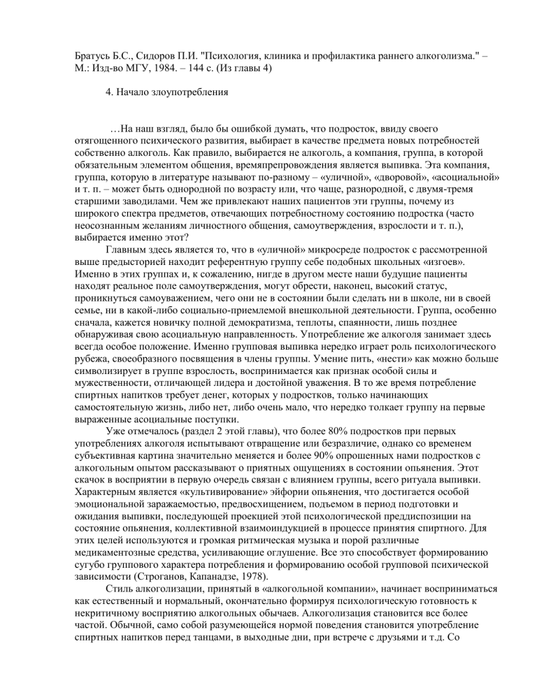 Братусь Б.С., Сидоров П.И. "Психология, клиника и профилактика раннего алкоголизма." – М.: Изд-во МГУ, 1984. – 144 с. (Из главы 4) 4. Начало злоупотребления …На наш взгляд, было бы ошибкой думать, что подросток, ввиду своего отягощенного психического развития, выбирает в качестве предмета новых потребностей собственно алкоголь. Как правило, выбирается не алкоголь, а компания, группа, в которой обязательным элементом общения, времяпрепровождения является выпивка. Эта компания, группа, которую в литературе называют по-разному – «уличной», «дворовой», «асоциальной» и т. п. – может быть однородной по возрасту или, что чаще, разнородной, с двумя-тремя старшими заводилами. Чем же привлекают наших пациентов эти группы, почему из широкого спектра предметов, отвечающих потребностному состоянию подростка (часто неосознанным желаниям личностного общения, самоутверждения, взрослости и т. п.), выбирается именно этот? Главным здесь является то, что в «уличной» микросреде подросток с рассмотренной выше предысторией находит референтную группу себе подобных школьных «изгоев». Именно в этих группах и, к сожалению, нигде в другом месте наши будущие пациенты находят реальное поле самоутверждения, могут обрести, наконец, высокий статус, проникнуться самоуважением, чего они не в состоянии были сделать ни в школе, ни в своей семье, ни в какой-либо социально-приемлемой внешкольной деятельности. Группа, особенно сначала, кажется новичку полной демократизма, теплоты, спаянности, лишь позднее обнаруживая свою асоциальную направленность. Употребление же алкоголя занимает здесь всегда особое положение. Именно групповая выпивка нередко играет роль психологического рубежа, своеобразного посвящения в члены группы. Умение пить, «нести» как можно больше символизирует в группе взрослость, воспринимается как признак особой силы и мужественности, отличающей лидера и достойной уважения. В то же время потребление спиртных напитков требует денег, которых у подростков, только начинающих самостоятельную жизнь, либо нет, либо очень мало, что нередко толкает группу на первые выраженные асоциальные поступки. Уже отмечалось (раздел 2 этой главы), что более 80% подростков при первых употреблениях алкоголя испытывают отвращение или безразличие, однако со временем субъективная картина значительно меняется и более 90% опрошенных нами подростков с алкогольным опытом рассказывают о приятных ощущениях в состоянии опьянения. Этот скачок в восприятии в первую очередь связан с влиянием группы, всего ритуала выпивки. Характерным является «культивирование» эйфории опьянения, что достигается особой эмоциональной заражаемостью, предвосхищением, подъемом в период подготовки и ожидания выпивки, последующей проекцией этой психологической преддиспозиции на состояние опьянения, коллективной взаимоиндукцией в процессе принятия спиртного. Для этих целей используются и громкая ритмическая музыка и порой различные медикаментозные средства, усиливающие оглушение. Все это способствует формированию сугубо группового характера потребления и формированию особой групповой психической зависимости (Строганов, Капанадзе, 1978). Стиль алкоголизации, принятый в «алкогольной компании», начинает восприниматься как естественный и нормальный, окончательно формируя психологическую готовно