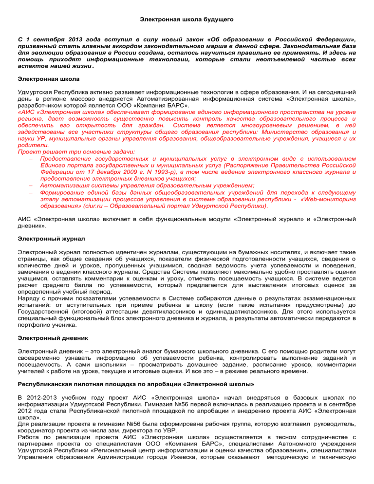 Электронная школа будущего С 1 сентября 2013 года вступил в силу новый закон «Об образовании в Российской Федерации», призванный стать главным аккордом законодательного марша в данной сфере. Законодательная база для эволюции образования в России создана, осталось научиться правильно ее применять. И здесь на помощь приходят информационные технологии, которые стали неотъемлемой частью всех аспектов нашей жизни. Электронная школа Удмуртская Республика активно развивает информационные технологии в сфере образования. И на сегодняшний день в регионе массово внедряется Автоматизированная информационная система «Электронная школа», разработчиком которой является ООО «Компания БАРС». «АИС «Электронная школа» обеспечивает формирование единого информационного пространства на уровне региона, дает возможность существенно повысить контроль качества образовательного процесса и обеспечить его открытость для граждан. Система является многоуровневым решением, в ней задействованы все участники структуры общего образования республики: Министерство образования и науки УР, муниципальные органы управления образования, общеобразовательные учреждения, учащиеся и их родители. Проект решает три основные задачи: Предоставление государственных и муниципальных услуг в электронном виде с использованием Единого портала государственных и муниципальных услуг (Распоряжение Правительства Российской Федерации от 17 декабря 2009 г. N 1993-р), в том числе ведение электронного классного журнала и предоставление электронных дневников учащихся; Автоматизация системы управления образовательным учреждением; Формирование единой базы данных общеобразовательных учреждений для перехода к следующему этапу автоматизации процессов управления в системе образовании республики - «Web-мониторинг образования» (ciur.ru – Образовательный портал Удмуртской Республики). АИС «Электронная школа» включает в себя функциональные модули «Электронный журнал» и «Электронный дневник». Электронный журнал Электронный журнал полностью идентичен журналам, существующим на бумажных носителях, и включает такие страницы, как общие сведения об учащихся, показатели физической подготовленности учащихся, сведения о количестве дней и уроков, пропущенных учащимися, сводная ведомость учета успеваемости и поведения, замечания о ведении классного журнала. Средства Системы позволяют максимально удобно проставлять оценки учащимся, оставлять комментарии к оценкам и уроку, отмечать посещаемость учащихся. В системе ведется расчет среднего балла по успеваемости, который предлагается для выставления итоговых оценок за определенный учебный период. Наряду с прочими показателями успеваемости в Системе собираются данные о результатах экзаменационных испытаний: от вступительных при приеме ребенка в школу (если такие испытания предусмотрены) до Государственной (итоговой) аттестации девятиклассников и одиннадцатиклассников. Для этого используется специальный функциональный блок электронного дневника и журнала, а результаты автоматически передаются в портфолио ученика. Электронный дневник Электронный дневник – это электронный аналог бумажного школьного дневника. С его помощью родители могут своевременно узнавать информацию об успеваемости ребенка, контролировать выпол