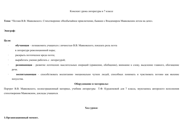 Конспект урока литературы в 7 классе Тема: “Поэзия В.В. Маяковского. Стихотворение «Необычайное приключение, бывшее с Владимиром Маяковским летом на даче». Эпиграф: Цели: · обучающая – познакомить учащихся с личностью В.В. Маяковского, показать роль поэта в литературе революционной поры; · раскрыть поэтическое кредо поэта; · выработать умение работать с литературой; · развивающая – развитие логических мыслительных операций (сравнение, обобщение), внимание к слову, выделение главного, обогащение речи. · воспитывающая – способствовать воспитанию эмоционально чутких людей, способных понимать и чувствовать поэзию как явление искусства. Оборудование и материалы: Портрет В.В. Маяковского, иллюстрационный материал, учебник литературы Т.Ф. Курдюмовой для 7 класса, звукозапись авторского исполнения стихотворения Маяковским, доклады учащихся. Ход урока: 1.Организационный момент. Учитель: «Здравствуйте, ребята! Садитесь! 2. Проверка домашнего задания: В рассказе «Старуха Изергиль» Горький предлагает легенду о Данко. Перескажите коротко сюжет. Какое литературное направление представлено в этом рассказе? (Романтизм). В чём его особенность? (Герой противопоставляет себя всему обществу, он одинокий, красивый). 3. Вступительное слово учителя. Сегодня мы познакомимся с литературным направлением футуризм. Футуризм - направление в литературе и изобразительном искусстве, появившееся в начале XX века, от лат. futurum — будущее. Основными задачами в литературе были: заменить ямбы и хореи новыми стихотворными размерами, ввести новые слова (авторские неологизмы), упростить формы словосочетания, создать необычные сюжеты. Предлагаю вашему вниманию несколько стихотворных текстов. Определите авторов стихотворений. Найдите среди них стихотворение, которое не вписывается в этот ряд. Почему? Я пришел к тебе с приветом, Рассказать, что солнце встало, Что оно горячим светом По листам затрепетало; (А. А. Фет, «Я пришел к тебе с приветом...») Еще в полях белеет снег, А воды уж весной шумят Бегут и будят сонный брег, Бегут и блещут, и гласят... (Федор Тютчев «Весенние воды») Под голубыми небесами Великолепными коврами, Блестя на солнце, снег лежит; Прозрачный лес один чернеет, И ель сквозь иней зеленеет, И речка подо льдом блестит. (Александр Пушкин «Зимнее утро») - Поэзия - вся! езда в незнаемое. Поэзия та же добыча радия. В грамм добыча, в год труды. Изводишь единого слова ради тысячи тонн словесной руды. (В. Маяковский «Разговор с финиспектором») Приведите синонимы к слову незнаемое (незнакомое, неизвестное). С чем Маяковский сравнивает поэзию? (С путешествием по просторам таинственной страны, имя которй-поэзия.). Лёгкий ли труд поэта? С каким трудом сравнивается он? Сведения из энциклопедии: РАДИЙ — радиоактивный химический элемент Чистый радий — блестящий серебристо-белый металл, быстро тускнеющий на воздухе. Плавится радий при 969° С, кипит при 1507° С. Любые физические и химические свойства радия изучать трудно из-за его очень высокой радиоактивности. Радий непрерывно выделяет теплоту, металл быстро нагревается и может даже расплавиться. Из-за высокой радиоактивности радий и его соединения светятся в темноте, его бесцветные соли быстро желтеют, а затем приобретают коричневую, вплоть до черной, окраску; их водные растворы разлагают воду, выделяя из нее водород и кислор