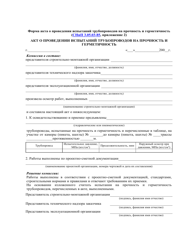 Форма акта о проведении испытаний трубопроводов на прочность и герметичность (СНиП 3.05.03-85, приложение 2) АКТ О ПРОВЕДЕНИИ ИСПЫТАНИЙ ТРУБОПРОВОДОВ НА ПРОЧНОСТЬ И ГЕРМЕТИЧНОСТЬ г._________________ «___»_____________200__г. Комиссия в составе: представителя строительно-монтажной организации (фамилия, имя, отчество, должность) представителя технического надзора заказчика (фамилия, имя, отчество, должность) представителя эксплуатационной организации (фамилия, имя, отчество, должность) произвела осмотр работ, выполненных (наименование строительно-монтажной организации) и составила настоящий акт о нижеследующем: 1. К освидетельствованию и приемке предъявлены (гидравлические или пневматические) трубопроводы, испытанные на прочность и герметичность и перечисленные в таблице, на участке от камеры (пикета, шахты) № _______до камеры (пикета, шахты) № ____трассы ______________протяженностью _______м. Трубопровод Испытательное давление, Продолжительность, мин МПа (кгс/см2) Наружный осмотр при давлении, МПа (кгс/см2) 2. Работы выполнены по проектно-сметной документации (наименование проектной организации, номера чертежей и дата их составления) Решение комиссии: Работы выполнены в соответствии с проектно-сметной документацией, стандартами, строительными нормами и правилами и отвечают требованиям их приемки. На основании изложенного считать испытания на прочность и герметичность трубопроводов, перечисленных в акте, выполненными. Представитель строительно-монтажной организации (подпись, фамилия имя отчество) Представитель технического надзора заказчика (подпись, фамилия имя отчество) Представитель эксплуатационной организации (подпись, фамилия имя отчество)