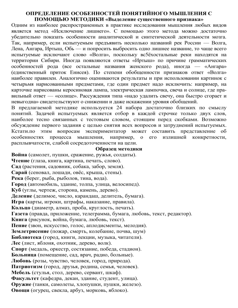 ОПРЕДЕЛЕНИЕ ОСОБЕННОСТЕЙ ПОНЯТИЙНОГО МЫШЛЕНИЯ С ПОМОЩЬЮ МЕТОДИКИ «Выделение существенного признака» Одним из наиболее распространенных в практике исследования мышления любых видов является метод «Исключение лишнего». С помощью этого метода можно достаточно убедительно показать особенности аналитической и синтетической деятельности мозга. Так, например, если испытуемым предъявить несколько названий рек России — Волга, Лена, Ангара, Иртыш, Обь — и попросить выбросить одно лишнее название, то чаще всего испытуемые исключают слово «Волга», поскольку вс5ёхостальные реки находятся на территории Сибири. Иногда появляются ответы «Иртыш» по причине грамматических особенностей рода (все остальные названия женского рода), иногда — «Ангара» (единственный приток Енисея). По степени обобщенности признаков ответ «Волга» наиболее правилен. Аналогично оцениваются результаты и при использовании картинок с четырьмя нарисованными предметами, где один предмет надо исключить: например, на карточке нарисованы керосиновая лампа, электрическая лампочка, свеча и солнце, где правильный ответ — «солнце». Рассуждения типа «надо удалить свечу, она быстро сгорает и невыгодна» свидетельствуют о снижении и даже искажении уровня обобщений. В предлагаемой методике используется 24 набора достаточно близких по смыслу понятий. Задачей испытуемых является отбор в каждой строчке только двух слов, наиболее тесно связанных с тестовым словом, стоящим перед скобками. Возможно обсуждение первого задания с целью снятия всех вопросов и затруднений испытуемых. Кстати.по этим вопросам экспериментатор может составить представление об особенностях процесса мышления, например, о его излишней конкретности, расплывчатости, слабой сосредоточенности на цели. Образец методики Война (самолет, пушки, сражение, ружья, солдаты). Чтение (глаза, книга, картина, печать, слово). Сад (растения, садовник, собака, забор, земля). Сарай (сеновал, лошади, овёс, крыша, стены). Река (берег, рыба, рыболов, тина, вода). Город (автомобиль, здание, толпа, улица, велосипед). Куб (углы, чертеж, сторона, камень, дерево). Деление (делимое, число, карандаш, делитель, бумага). Игра (карты, игроки, штрафы, наказание, правила). Кольцо (диаметр, алмаз, проба, круглость, печать). Газета (правда, приложение, телеграмма, бумага, любовь, текст, редактор). Книга (рисунок, война, бумага, любовь, текст). Пение (звон, искусство, голос, аплодисменты, мелодия). Землетрясение (пожар, смерть, колебание, почва, шум) Библиотека (город, книги, лекции, музыка, читатели). Лес (лист, яблоня, охотник, дерево, волк). Спорт (медаль, оркестр, состязание, победа, стадион). Больница (помещение, сад, врач, радио, больные). Любовь (розы, чувство, человек, город, природа). Патриотизм (город, друзья, родина, семья, человек). Мебель (стулья, стол, дерево, сервант, шкаф). Факультет (кафедра, декан, здание, студент, улица). Оружие (танки, самолеты, хлопушки, пушки, железо). Овощи (огурец, свекла, арбуз, морковь, яблоко). При сравнении своих ответов с правильными испытуемые оценивают свои результаты в баллах, где 2 балла соответствуют двум правильно выбранным словам, 1 балл соответствует одному правильно выбранному слову и 0 баллов, когда испытуемый не смог выбрать ни одного правильного слова. Результаты суммируются. Максимальное количество баллов равно 48 баллам, резу