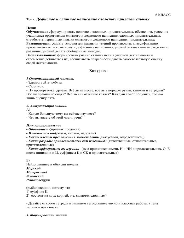 6 КЛАСС Тема: Дефисное и слитное написание сложных прилагательных Цели: Обучающая: сформулировать понятие о сложных прилагательных, обеспечить усвоение учащимися орфограммы слитного и дефисного написания сложных прилагательных, отработать первичные навыки слитного и дефисного написания прилагательных; Развивающая: создать условия для развития умений производить классификацию прилагательных по слитному и дефисному написанию, умений устанавливать сходства и различия, умений делать обобщенные выводы; Воспитывающая: формировать умение ставить цели в учебной деятельности и стремление добиваться их, воспитывать потребности давать самостоятельную оценку своей деятельности. Ход урока: 1 Организационный момент. - Здравствуйте, ребята. - Садитесь. - Ну проверьте-ка, друзья. Всё ль на месте, все ль в порядке ручки, книжки и тетрадки? Все ли правильно сидят? Все ль внимательно глядят? Каждый хочет получить, только лишь оценку пять. 2. Актуализация знаний. А) - Какую большую тему вы сейчас изучаете? - Что вы знаете об этой части речи? Имя прилагательное - Обозначает-(признак предмета) - Изменяется по-(родам, числам, падежам) - Каким членом предложения может быть (сказуемым, определением,) - Какие разряды прилагательных вам известны? (качественные, относительные, притяжательные) - Какие орфограммы вы изучили- (не с прилагательными, Н и НН в прилагательных, О, Ё после шипящих и Ц, суффиксы К и СК в прилагательных) Б) Найди лишнее и объясни почему. Морской Матросский Флотский Рыболовецкий (рыболовецкий, потому что 1) суффикс К, 2) состоит из двух корней, т.е. является сложным) - Давайте откроем тетради и запишем сегодняшнее число и классная работа, а тему запишем чуть позже. 3. Формирование знаний. А) Работа с текстом. Слайд №1 - Прочитайте текст. Юго - западный ветер гнал сине - зеленые волны горько – соленого моря. На борту рыболовецкого судна стоял высокий седобородый человек с темно – зеленым водонепроницаемым плащом и смотрел вдаль. На горизонте маячил трехмачтовый бриг. Над ним висели бело – розовые облака. Одно было похоже на огромную носорожью тушу. - Слова какой части речи у нас подчеркнуты? - Что отличает их от других прилагательных? - Почему они являются сложными? - Почему они пишутся по- разному? - Как вы думаете, какую тему мы будем сегодня изучать? Давайте запишем ее. Слайд №2 - Чему мы должны научиться к концу урока? - Мне бы очень хотелось, чтобы к концу урока каждый из вас смог ответить себе на вопрос достиг ли он поставленной цели? Задание: Выпишите в 2 столбика все сложные прилагательные, которые пишутся слитно и через дефис. Проверка слайд №3 Слитно Рыболовецкое судно Седобородый человек Водонепроницаемый плащ Трехмачтовый бриг Носорожья туша Через дефис Юго-западный ветер Сине-зеленые волны Горько-соленое море Темно-серый плащ Бело-розовые облака - Какие из этих сложных прилагательных образованы от имени существительного? Носорожья – носорог, Юго – западный – юго – запад - Почему одно прилагательное пишется слитно, а другое через дефис? - Какой мы вывод можем сделать? - Какие из этих сложных прилагательных образованы от словосочетания? Рыболовецкое – ловец (чего?) рыбы, Седобородый – борода (какая?) седая, Водонепроницаемый – непроницаемый ( чем?) водой, Трехмачтовый – три (чего?) мачты - Как пишутся все эти сложные прилагательные? Вывод. Сложн