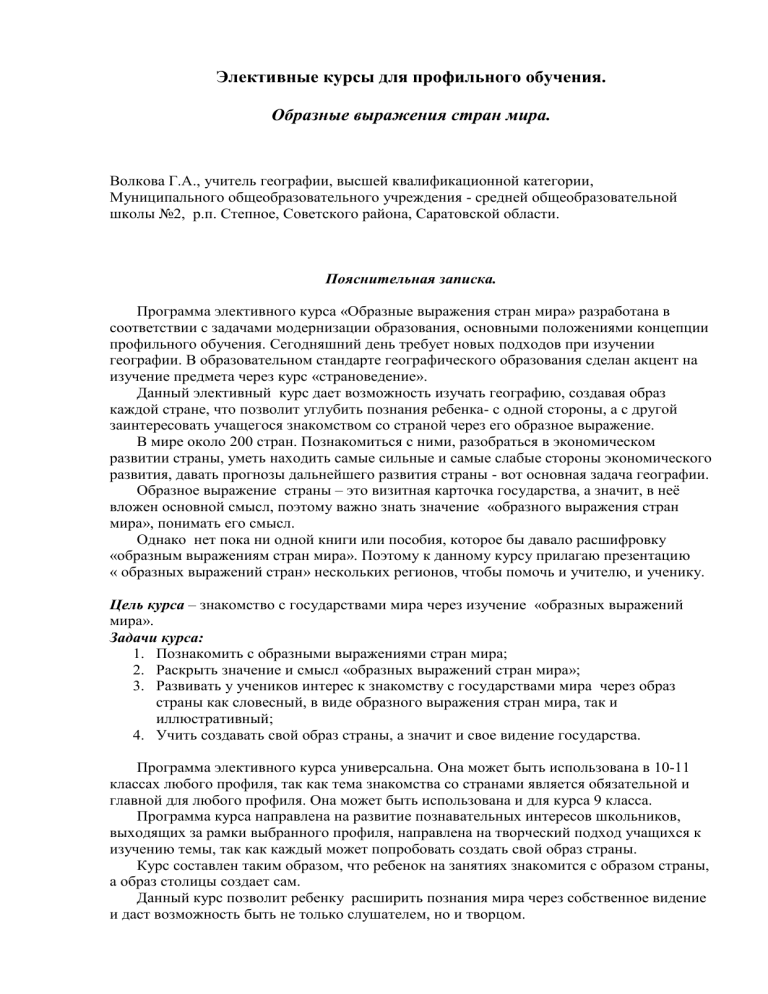 Элективные курсы для профильного обучения. Образные выражения стран мира. Волкова Г.А., учитель географии, высшей квалификационной категории, Муниципального общеобразовательного учреждения - средней общеобразовательной школы №2, р.п. Степное, Советского района, Саратовской области. Пояснительная записка. Программа элективного курса «Образные выражения стран мира» разработана в соответствии с задачами модернизации образования, основными положениями концепции профильного обучения. Сегодняшний день требует новых подходов при изучении географии. В образовательном стандарте географического образования сделан акцент на изучение предмета через курс «страноведение». Данный элективный курс дает возможность изучать географию, создавая образ каждой стране, что позволит углубить познания ребенка- с одной стороны, а с другой заинтересовать учащегося знакомством со страной через его образное выражение. В мире около 200 стран. Познакомиться с ними, разобраться в экономическом развитии страны, уметь находить самые сильные и самые слабые стороны экономического развития, давать прогнозы дальнейшего развития страны - вот основная задача географии. Образное выражение страны – это визитная карточка государства, а значит, в неё вложен основной смысл, поэтому важно знать значение «образного выражения стран мира», понимать его смысл. Однако нет пока ни одной книги или пособия, которое бы давало расшифровку «образным выражениям стран мира». Поэтому к данному курсу прилагаю презентацию « образных выражений стран» нескольких регионов, чтобы помочь и учителю, и ученику. Цель курса – знакомство с государствами мира через изучение «образных выражений мира». Задачи курса: 1. Познакомить с образными выражениями стран мира; 2. Раскрыть значение и смысл «образных выражений стран мира»; 3. Развивать у учеников интерес к знакомству с государствами мира через образ страны как словесный, в виде образного выражения стран мира, так и иллюстративный; 4. Учить создавать свой образ страны, а значит и свое видение государства. Программа элективного курса универсальна. Она может быть использована в 10-11 классах любого профиля, так как тема знакомства со странами является обязательной и главной для любого профиля. Она может быть использована и для курса 9 класса. Программа курса направлена на развитие познавательных интересов школьников, выходящих за рамки выбранного профиля, направлена на творческий подход учащихся к изучению темы, так как каждый может попробовать создать свой образ страны. Курс составлен таким образом, что ребенок на занятиях знакомится с образом страны, а образ столицы создает сам. Данный курс позволит ребенку расширить познания мира через собственное видение и даст возможность быть не только слушателем, но и творцом. Элективный курс предполагает использование разнообразных форм проведения: лекции, семинары, консультации, защита проектов. На итоговом занятии подводят итоги изучения элективного курса. Учащиеся получают итоговые результаты индивидуального рейтинга, которые могут быть включены в портфолио школьника. Методика проведения занятий ориентирует учащихся на способы добывания знаний. Учебно-тематическое планирование. Тема Количество часов. Введение в тему. Образные выражения стран Европы 1 час 6 часов Образные выраже