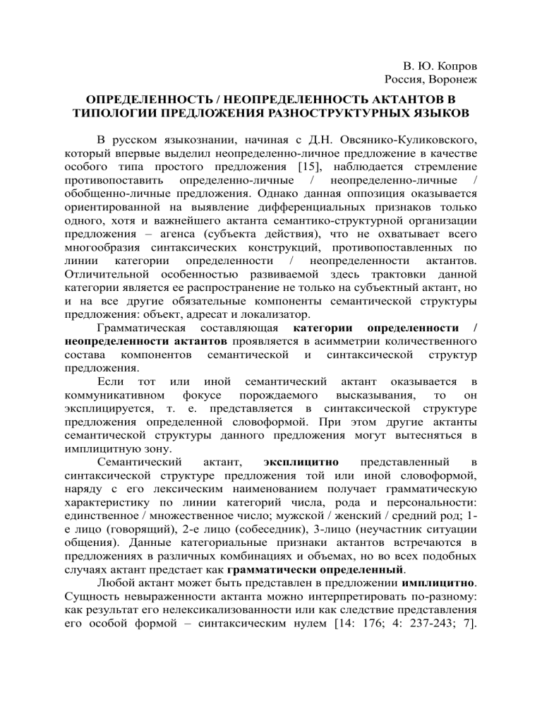 В. Ю. Копров Россия, Воронеж ОПРЕДЕЛЕННОСТЬ / НЕОПРЕДЕЛЕННОСТЬ АКТАНТОВ В ТИПОЛОГИИ ПРЕДЛОЖЕНИЯ РАЗНОСТРУКТУРНЫХ ЯЗЫКОВ В русском языкознании, начиная с Д.Н. Овсянико-Куликовского, который впервые выделил неопределенно-личное предложение в качестве особого типа простого предложения [15], наблюдается стремление противопоставить определенно-личные / неопределенно-личные / обобщенно-личные предложения. Однако данная оппозиция оказывается ориентированной на выявление дифференциальных признаков только одного, хотя и важнейшего актанта семантико-структурной организации предложения – агенса (субъекта действия), что не охватывает всего многообразия синтаксических конструкций, противопоставленных по линии категории определенности / неопределенности актантов. Отличительной особенностью развиваемой здесь трактовки данной категории является ее распространение не только на субъектный актант, но и на все другие обязательные компоненты семантической структуры предложения: объект, адресат и локализатор. Грамматическая составляющая категории определенности / неопределенности актантов проявляется в асимметрии количественного состава компонентов семантической и синтаксической структур предложения. Если тот или иной семантический актант оказывается в коммуникативном фокусе порождаемого высказывания, то он эксплицируется, т. е. представляется в синтаксической структуре предложения определенной словоформой. При этом другие актанты семантической структуры данного предложения могут вытесняться в имплицитную зону. Семантический актант, эксплицитно представленный в синтаксической структуре предложения той или иной словоформой, наряду с его лексическим наименованием получает грамматическую характеристику по линии категорий числа, рода и персональности: единственное / множественное число; мужской / женский / средний род; 1е лицо (говорящий), 2-е лицо (собеседник), 3-лицо (неучастник ситуации общения). Данные категориальные признаки актантов встречаются в предложениях в различных комбинациях и объемах, но во всех подобных случаях актант предстает как грамматически определенный. Любой актант может быть представлен в предложении имплицитно. Сущность невыраженности актанта можно интерпретировать по-разному: как результат его нелексикализованности или как следствие представления его особой формой – синтаксическим нулем [14: 176; 4: 237-243; 7]. Синтаксический нуль просто замещает в конструкции соответствующую синтаксическую позицию актанта, не выражая при этом никаких его категориально-грамматических признаков. Так, в неопределенно-личной конструкции – это позиция подлежащего, в других конструкциях это может быть позиция дополнения. Неназванность актанта в синтаксической конструкции не означает его отсутствия в семантической структуре предложения: она лишь обусловливает возможность мысленного заполнения позиции этого актанта именем того предмета, который выполняет его функцию. Имплицитное обозначение актанта объясняется не только его неактуальностью для конкретного высказывания, но и тем, что говорящий может рассчитывать на адекватное восстановление этого смысла адресатом. При реализации актанта синтаксическим нулем его грамматические признаки числа, рода и персональности, естественно, остаются невыраженными,