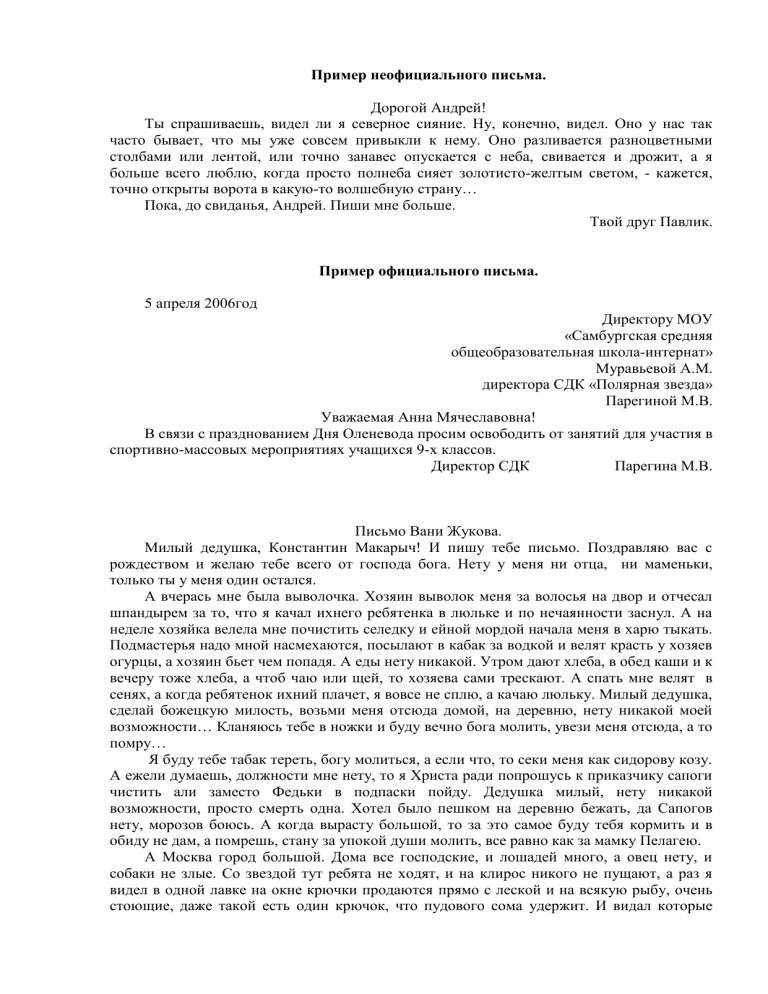 Пример неофициального письма. Дорогой Андрей! Ты спрашиваешь, видел ли я северное сияние. Ну, конечно, видел. Оно у нас так часто бывает, что мы уже совсем привыкли к нему. Оно разливается разноцветными столбами или лентой, или точно занавес опускается с неба, свивается и дрожит, а я больше всего люблю, когда просто полнеба сияет золотисто-желтым светом, - кажется, точно открыты ворота в какую-то волшебную страну… Пока, до свиданья, Андрей. Пиши мне больше. Твой друг Павлик. Пример официального письма. 5 апреля 2006год Директору МОУ «Самбургская средняя общеобразовательная школа-интернат» Муравьевой А.М. директора СДК «Полярная звезда» Парегиной М.В. Уважаемая Анна Мячеславовна! В связи с празднованием Дня Оленевода просим освободить от занятий для участия в спортивно-массовых мероприятиях учащихся 9-х классов. Директор СДК Парегина М.В. Письмо Вани Жукова. Милый дедушка, Константин Макарыч! И пишу тебе письмо. Поздравляю вас с рождеством и желаю тебе всего от господа бога. Нету у меня ни отца, ни маменьки, только ты у меня один остался. А вчерась мне была выволочка. Хозяин выволок меня за волосья на двор и отчесал шпандырем за то, что я качал ихнего ребятенка в люльке и по нечаянности заснул. А на неделе хозяйка велела мне почистить селедку и ейной мордой начала меня в харю тыкать. Подмастерья надо мной насмехаются, посылают в кабак за водкой и велят красть у хозяев огурцы, а хозяин бьет чем попадя. А еды нету никакой. Утром дают хлеба, в обед каши и к вечеру тоже хлеба, а чтоб чаю или щей, то хозяева сами трескают. А спать мне велят в сенях, а когда ребятенок ихний плачет, я вовсе не сплю, а качаю люльку. Милый дедушка, сделай божецкую милость, возьми меня отсюда домой, на деревню, нету никакой моей возможности… Кланяюсь тебе в ножки и буду вечно бога молить, увези меня отсюда, а то помру… Я буду тебе табак тереть, богу молиться, а если что, то секи меня как сидорову козу. А ежели думаешь, должности мне нету, то я Христа ради попрошусь к приказчику сапоги чистить али заместо Федьки в подпаски пойду. Дедушка милый, нету никакой возможности, просто смерть одна. Хотел было пешком на деревню бежать, да Сапогов нету, морозов боюсь. А когда вырасту большой, то за это самое буду тебя кормить и в обиду не дам, а помрешь, стану за упокой души молить, все равно как за мамку Пелагею. А Москва город большой. Дома все господские, и лошадей много, а овец нету, и собаки не злые. Со звездой тут ребята не ходят, и на клирос никого не пущают, а раз я видел в одной лавке на окне крючки продаются прямо с леской и на всякую рыбу, очень стоющие, даже такой есть один крючок, что пудового сома удержит. И видал которые лавки, где ружья всякие на манер Бариновых, так сто небось рублей сто кажное… А в мясных лавках и тетерева, и рябцы, и зайцы, а в котором месте их стреляют, про то сидельцы не сказывают. Милый дедушка, а когда у господ будет елка с гостинцами, возьми мне золоченый орех и в зеленый сундучок спрячь. Попроси у барышни Ольги Игнатьевны, скажи, для Ваньки. Приезжай, милый дедушка, Христом богом тебя молю, возьми меня отсюда. Пожалей ты меня, сироту несчастную, а то меня все колотят и кушать страсть как хочется, а скука такая, что и сказать нельзя, все плачу. А намедни хозяин колодкой по голове ударил, так что упал и насилу очухался. Пропащая моя жизнь, хуже собаки всякой… А еще кланяюсь А