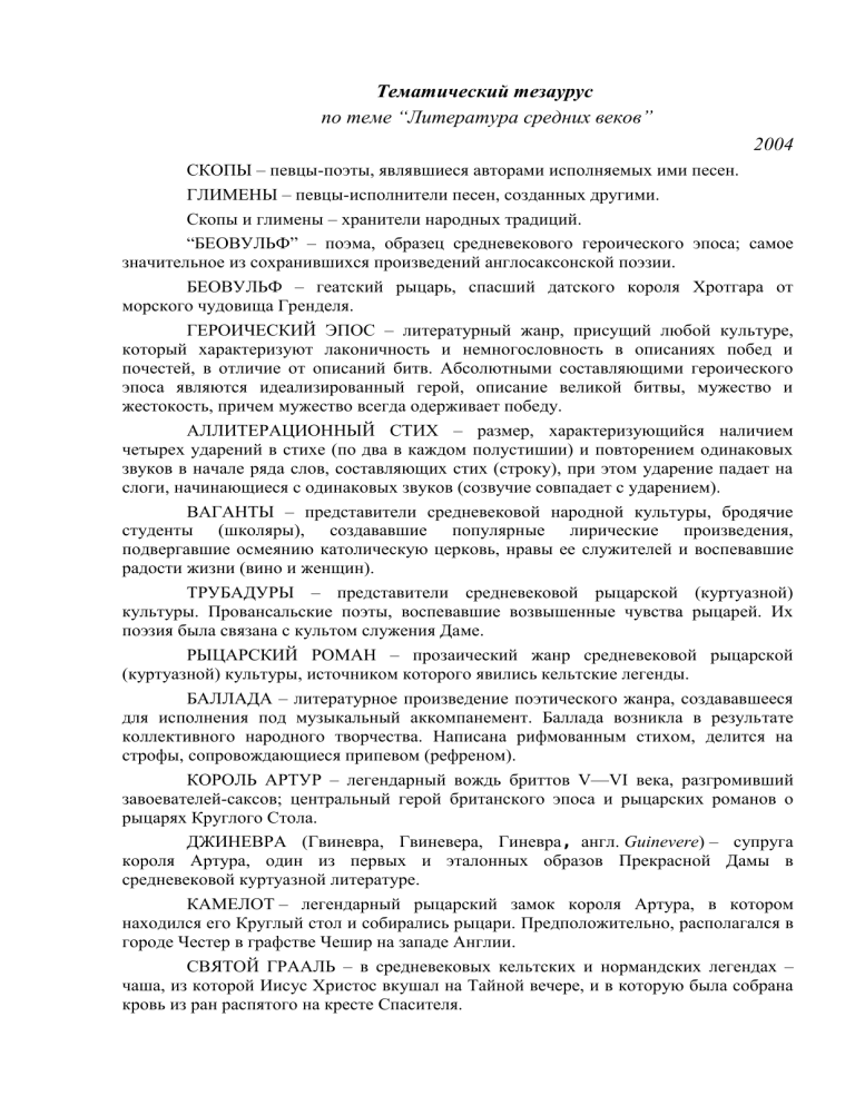 Тематический тезаурус по теме “Литература средних веков” 2004 СКОПЫ – певцы-поэты, являвшиеся авторами исполняемых ими песен. ГЛИМЕНЫ – певцы-исполнители песен, созданных другими. Скопы и глимены – хранители народных традиций. “БЕОВУЛЬФ” – поэма, образец средневекового героического эпоса; самое значительное из сохранившихся произведений англосаксонской поэзии. БЕОВУЛЬФ – геатский рыцарь, спасший датского короля Хротгара от морского чудовища Гренделя. ГЕРОИЧЕСКИЙ ЭПОС – литературный жанр, присущий любой культуре, который характеризуют лаконичность и немногословность в описаниях побед и почестей, в отличие от описаний битв. Абсолютными составляющими героического эпоса являются идеализированный герой, описание великой битвы, мужество и жестокость, причем мужество всегда одерживает победу. АЛЛИТЕРАЦИОННЫЙ СТИХ – размер, характеризующийся наличием четырех ударений в стихе (по два в каждом полустишии) и повторением одинаковых звуков в начале ряда слов, составляющих стих (строку), при этом ударение падает на слоги, начинающиеся с одинаковых звуков (созвучие совпадает с ударением). ВАГАНТЫ – представители средневековой народной культуры, бродячие студенты (школяры), создававшие популярные лирические произведения, подвергавшие осмеянию католическую церковь, нравы ее служителей и воспевавшие радости жизни (вино и женщин). ТРУБАДУРЫ – представители средневековой рыцарской (куртуазной) культуры. Провансальские поэты, воспевавшие возвышенные чувства рыцарей. Их поэзия была связана с культом служения Даме. РЫЦАРСКИЙ РОМАН – прозаический жанр средневековой рыцарской (куртуазной) культуры, источником которого явились кельтские легенды. БАЛЛАДА – литературное произведение поэтического жанра, создававшееся для исполнения под музыкальный аккомпанемент. Баллада возникла в результате коллективного народного творчества. Написана рифмованным стихом, делится на строфы, сопровождающиеся припевом (рефреном). КОРОЛЬ АРТУР – легендарный вождь бриттов V—VI века, разгромивший завоевателей-саксов; центральный герой британского эпоса и рыцарских романов о рыцарях Круглого Стола. ДЖИНЕВРА (Гвиневра, Гвиневера, Гиневра, англ. Guinevere) – супруга короля Артура, один из первых и эталонных образов Прекрасной Дамы в средневековой куртуазной литературе. КАМЕЛОТ – легендарный рыцарский замок короля Артура, в котором находился его Круглый стол и собирались рыцари. Предположительно, располагался в городе Честер в графстве Чешир на западе Англии. СВЯТОЙ ГРААЛЬ – в средневековых кельтских и нормандских легендах – чаша, из которой Иисус Христос вкушал на Тайной вечере, и в которую была собрана кровь из ран распятого на кресте Спасителя.