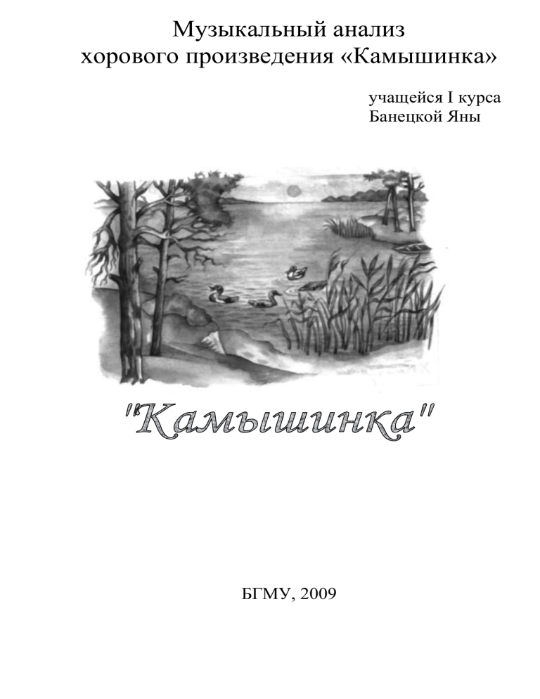 Музыкальный анализ хорового произведения «Камышинка» учащейся I курса Банецкой Яны БГМУ, 2009 I.Общий анализ Народная песня – небольшое, обычно куплетное (строфическое), музыкальнопоэтическое произведение, основной вид народного художественного творчества. Народные песни отличаются богатством жанров – эпические, лирические, трудовые, сатирические, бытовые, обрядовые, исторические, революционные и т. д. Некоторые жанры (обрядовые, хороводные, игровые, плясовые) связаны с драматическим действием, пляской, игрой. Народные песни исполняются без инструментального сопровождения или с аккомпанементом народных музыкальных инструментов. Лучшие народные песни – образцы высокого художественного совершенства и красоты. Они бесконечно разнообразны по мелодическому стилю (широко напевному, речитативному, орнаментальному), музыкальным формам, ритмам, типам сочетания слов текста и звуков мелодии. Народные песни – результат коллективного творчества многих поколений. Передаваясь из уст в уста, народные песни непрерывно изменяются, варьируются. Один и тот же напев, при относительной устойчивости его основных мелодических оборотов, видоизменяются в соответствии с местными художественными традициями. Часто на один напев слогается множество разных текстов (например, в частушке) или, наоборот, на один текст – различные напевы. Обработка – видоизменение музыкальных произведений путём гармонизации, аранжировки или транскрипции. Термин «обработка» применяется чаще всего в отношении народных мелодий при присоединении к пению инструментального сопровождения, при переложениях для хора. Чешскую народную песню «Камышинка» обработал Н. Можайский, перевод текста на русский язык – Т. Сикорская. Литературный текст: 1.Камышинку клонит Ветер у ручья. Горько плачет, стонет Милая моя. 2. Камышинке этой Рано ждать зимы Ты не плачь, не сетуй, Что в разлуке мы. Плачет, что пригожа, А всегда одна… Что для сердца тоже Минула весна. Ждёт нас снова, знаю, Счастье и любовь. Ты горюй, родная, Всё вернётся вновь. Текст данного произведения лирический, задумчивый, задушевный. Жанр любовной лирики представлен здесь своеобразной ассоциативной параллельно с одинокой камышинкой, которая нуждается в тепле и защите. Последние строфы текста отражают мечты и веру в счастливое будущее. Размер текста – двухсложный хорей: Камышинку клонит ветер у ручья Оригинальной находкой произведения является сочетание двухсложного размера литературного текста и трёхдольного размере музыка: ударения приходятся на первые и вторые доли: Пример 1,1а II.Музыкально – теоретический анализ Фактура хорового произведения «Камышинка» смешанная: в основном гармоническая с элементами подголосочности и распевности: Пример 2 Мелодическая линия хора присутствует в партии сопрано. В некоторых фрагментах тему исполняют две партии (соло – тенора и сопрано): Пример 3 Форма произведения «Камышинка» - куплетная, что характерно для большинства народных песен. Запев представляет собой период(4+4), квадратный, повторного строения. Припев имеет в каждом куплете различные тексты, является также периодом(4+4), имеет в заключении полную совершенную каденцию. После второго куплета идёт восьмитактовое заключение, основанное на повторном пропевании фразы: «не горюй родная». Основная тональность произведени