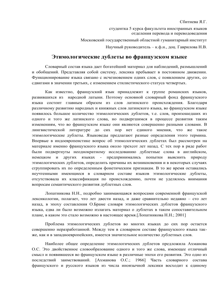 Сбитнева Я.Г. студентка 5 курса факультета иностранных языков отделения перевода и переводоведения Московский государственный областной гуманитарный институт Научный руководитель – к.ф.н., доц. Гаврилова Н.В. Этимологические дублеты во французском языке Словарный состав языка дает богатейший материал для наблюдений, размышлений и обобщений. Представляя собой систему, лексика пребывает в постоянном движении. Функционирование языка связано с исчезновением одних слов, с появлением других, со сдвигами в значении третьих, с изменением стилистического статуса четвертых. Как известно, французский язык принадлежит к группе романских языков, развившихся из народной латыни. Поэтому основной словарный фонд французского языка состоит главным образом из слов латинского происхождения. Благодаря различному развитию народных и книжных слов латинского языка, во французском языке появилось большое количество этимологических дублетов, т.е. слов, произошедших из одного и того же латинского слова, но подвергшимся в процессе развития таким изменениям, что во французском языке они являются совершенно разными словами. В лингвистической литературе до сих пор нет единого мнения, что же такое этимологические дублеты. Языковеды предлагают разные определения этого термина. Впервые в индоевропеистике вопрос об этимологических дублетах был рассмотрен на материале именно французского языка около трехсот лет назад. С тех пор в ряде работ были подвергнуты неоднократному исследованию дублетные слова в английском, немецком и других языках - предпринимались попытки выяснить природу этимологических дублетов, определить причины их возникновения и в некоторых случаях сгруппировать их по определенным фонетическим признакам. В то же время оставались неучтенными имеющиеся в словарном составе языков этимологические дублеты, отсутствовала их классификация по происхождению, почти не уделялось внимания вопросам семантического развития дублетных слов. Лопатникова Н.Н., подробно занимающаяся вопросами современной французской лексикологии, полагает, что лет двести назад, и даже сравнительно недавно – сто лет назад, в эпоху составления О.Браме словаря этимологических дублетов французского языка, едва ли было возможно излагать материал о дублетах в таком сопоставительном плане, в каком это стало возможно в настоящее время.[Лопатникова Н.Н.; 2001] Проблема этимологических дублетов во многих языках до сих пор остается совершенно неразработанной. Между тем в словарном составе французского языка также, как и в западноевропейских, имеется значительное количество дублетных слов. Наиболее общее определение этимологических дублетов предложила Ахманова О.С. Это двойственное словообразование одного и того же слова, имеющее отличный смысл и появившееся во французском языке в различные эпохи его развития. Это одно из последствий заимствований. [Ахманова О.С.; 1966] Часть словарного состава французского и русского языков из числа иноязычной лексики восходит к единому источнику, и в значительном количестве случаев одни и те же слова входили в оба языка неоднократно в результате разновременных заимствований или через посредство разных языков и образовали в последних дублетные словоформы. Однако в более полном понимании этимологическими дублетами следуе